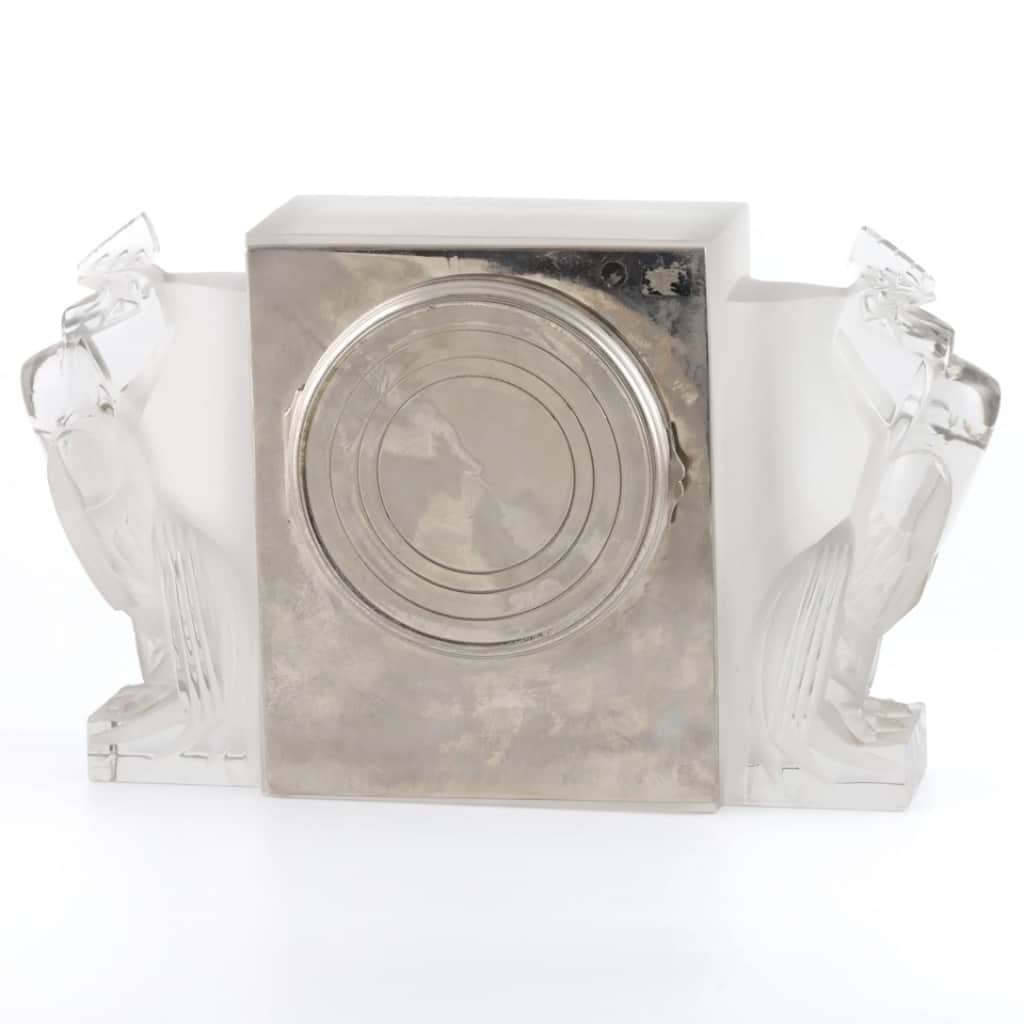 Pendule «Deux Coqs» en verre moulé-pressé satiné et brillant. Mouvement ATO. Signée. Modèle créé le 30 avril 1929, supprimé en 1932.