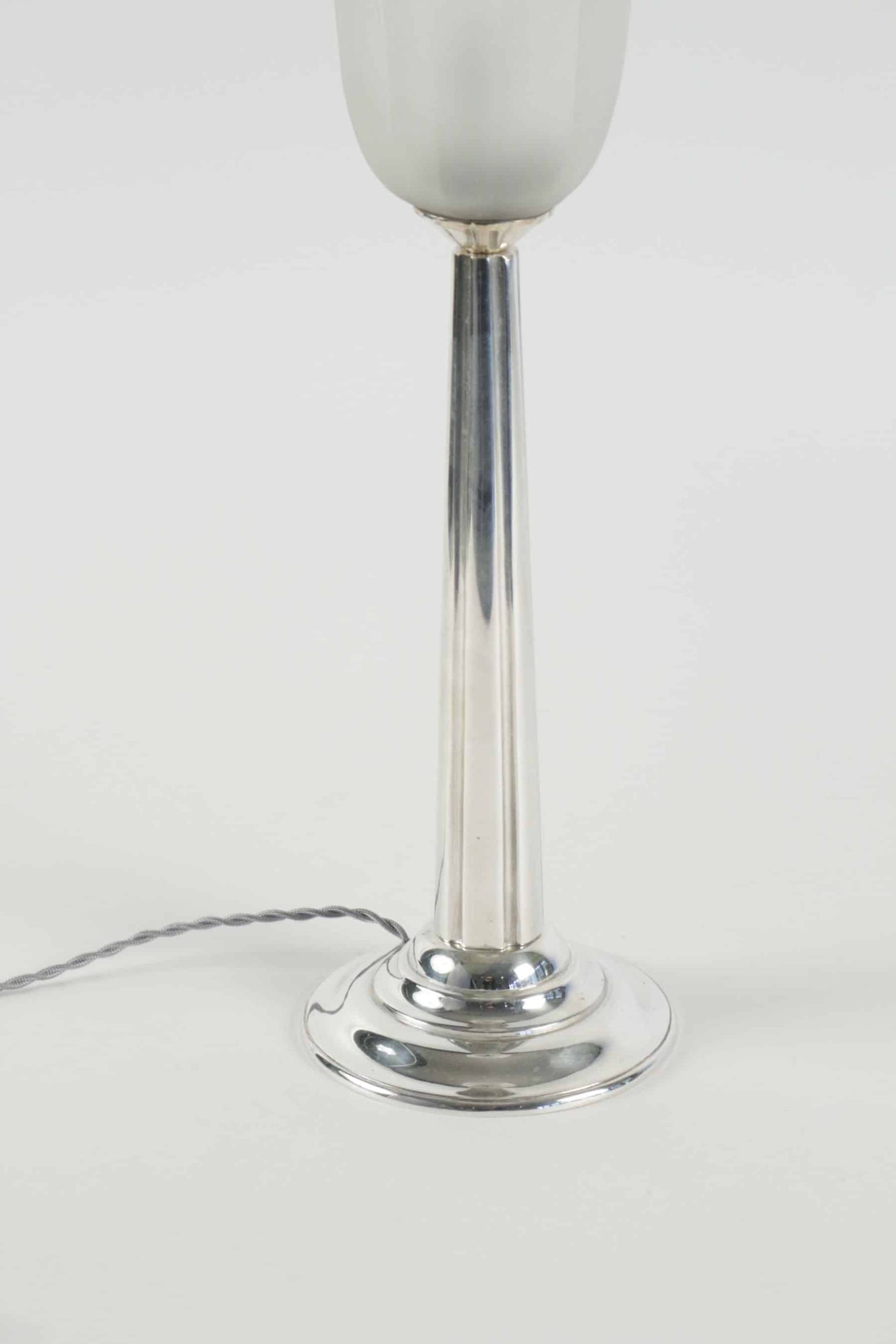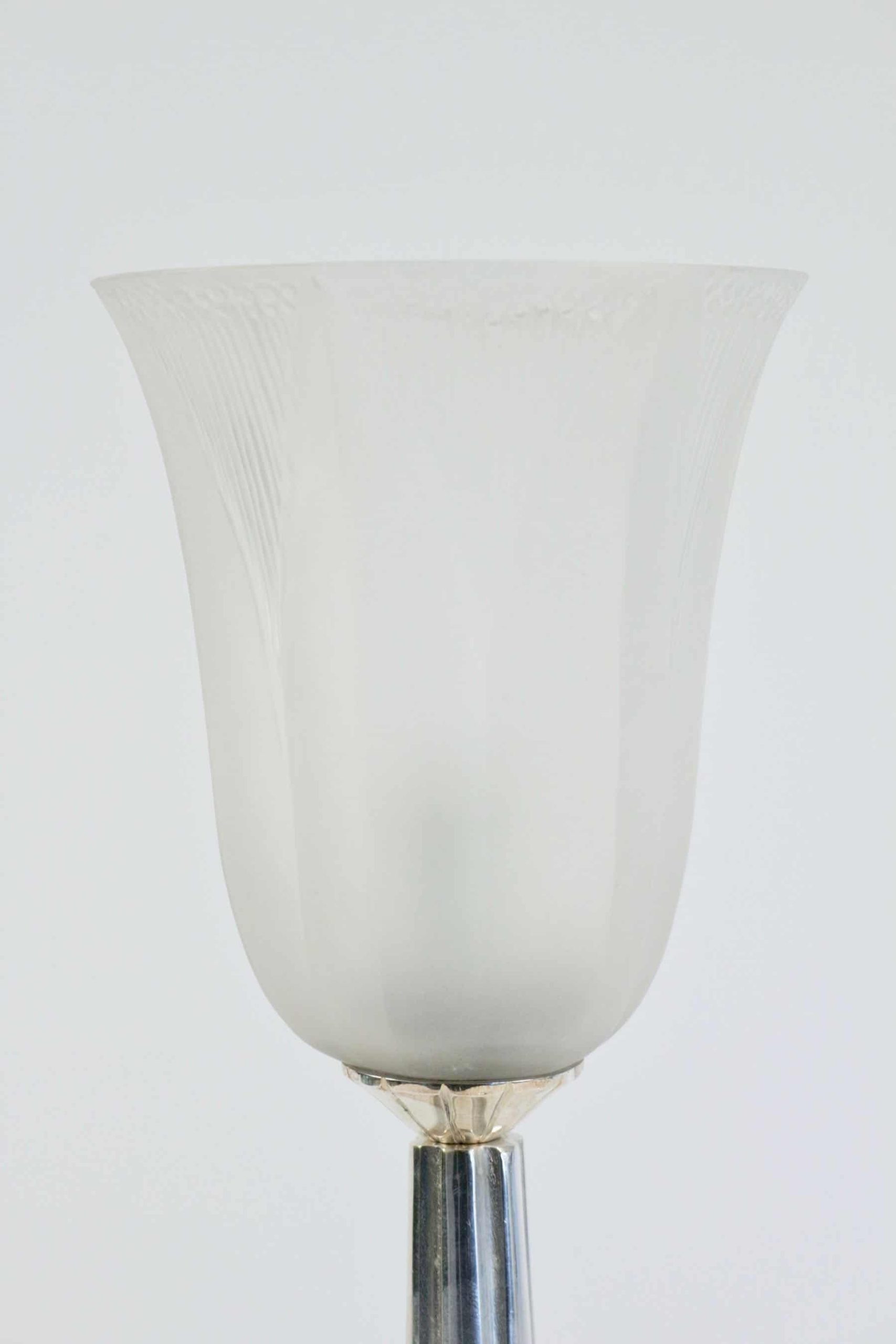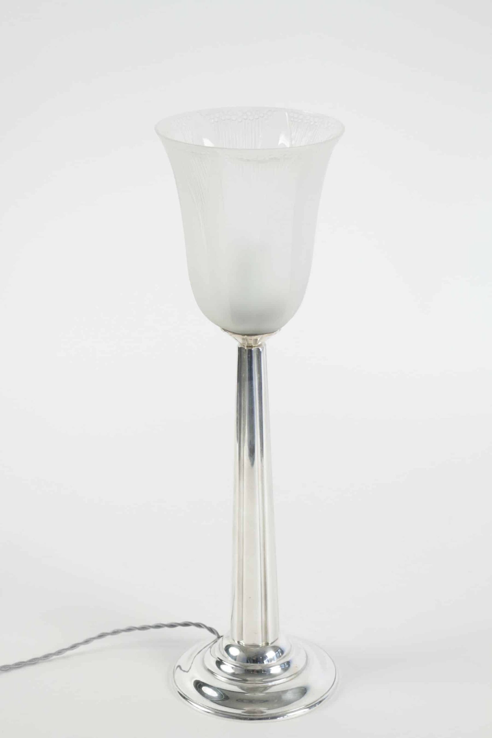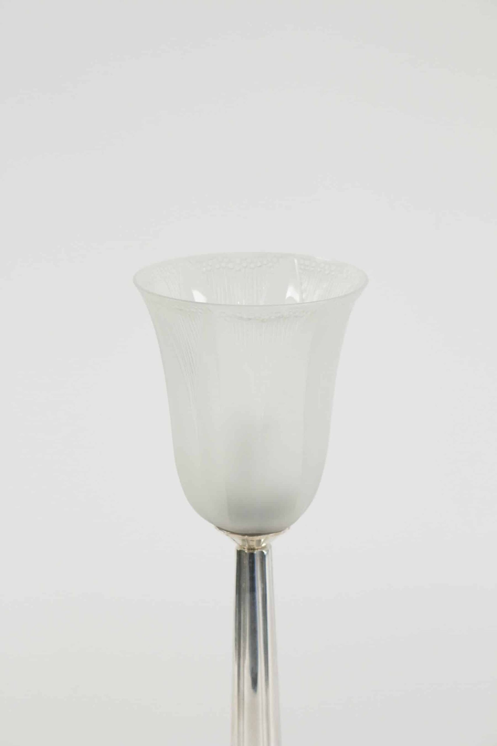 Lampe de table en métal argenté et sa tulipe en verre modèle « campanule »