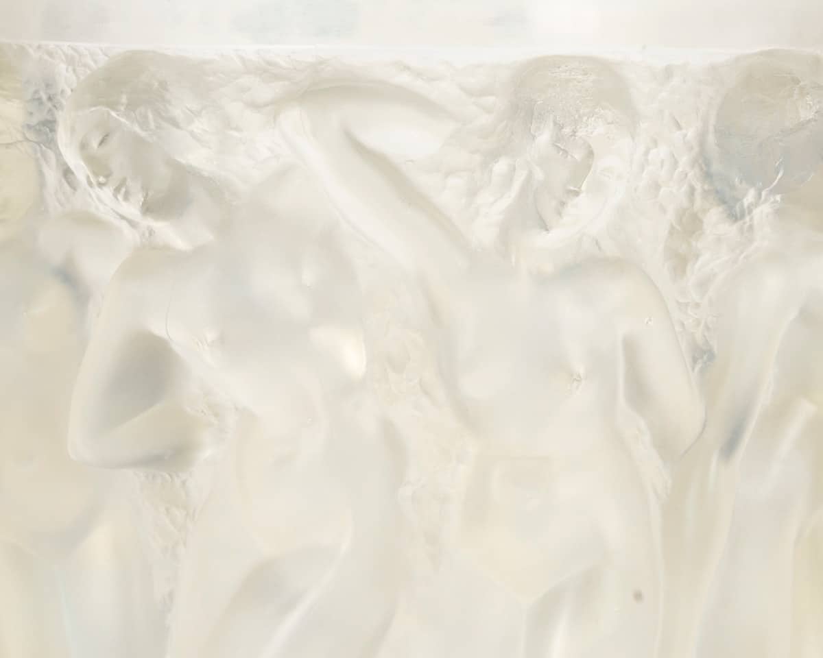 René Lalique a été inspiré par la représentation du corps féminin tout au long de sa carrière. Les Bacchantes correspondent aux Ménades de la mythologie grecque. Ici, les jeunes prêtresses de Bacchus forment une ronde de nus sculpturaux en bas-relief à la sensualité troublante et dansent pour célébrer le dieu du vin, de la vigne et des excès.