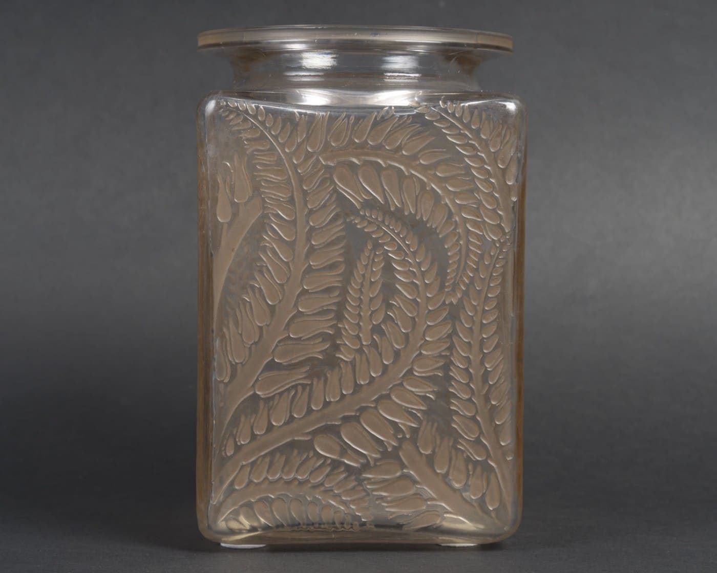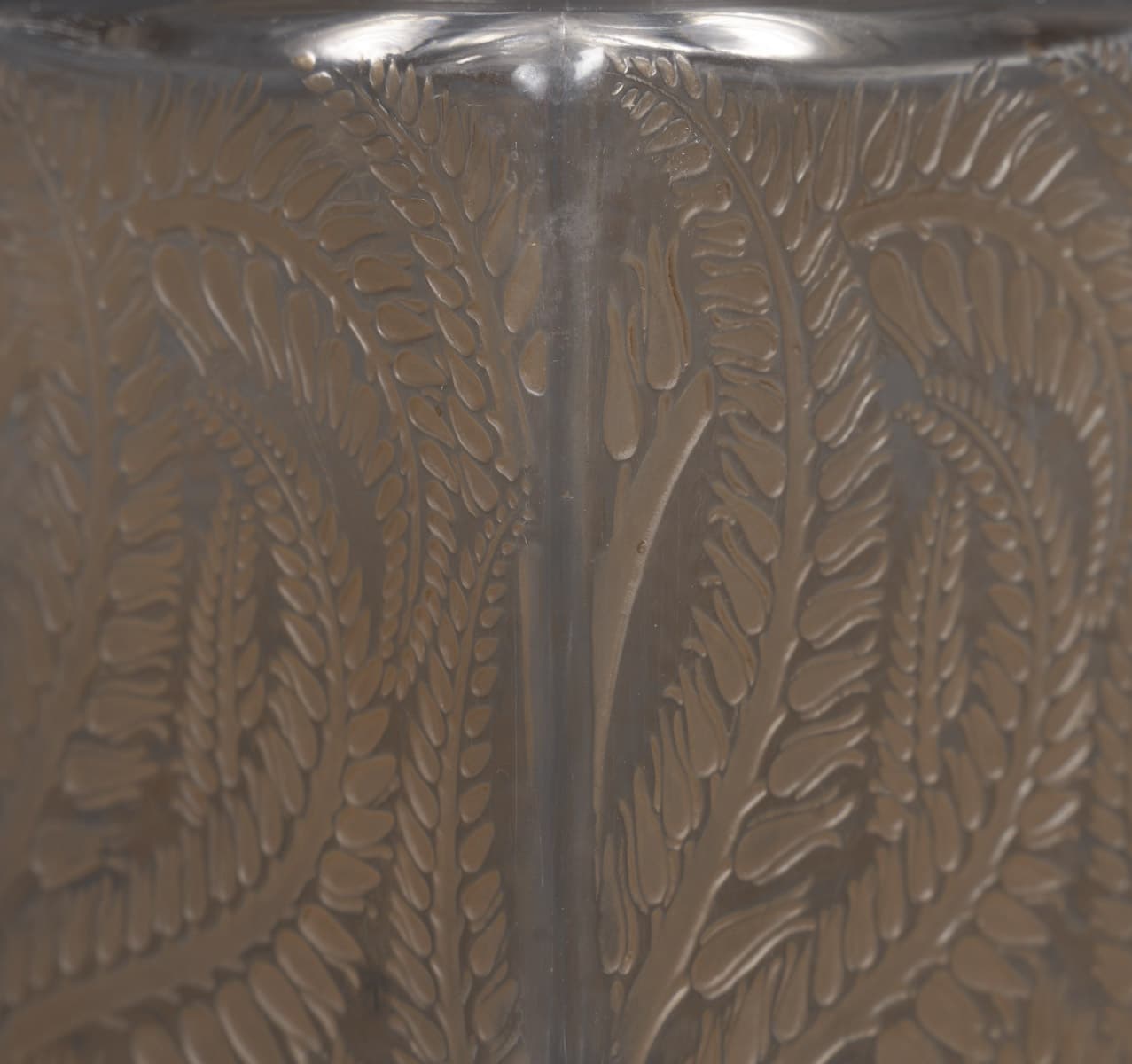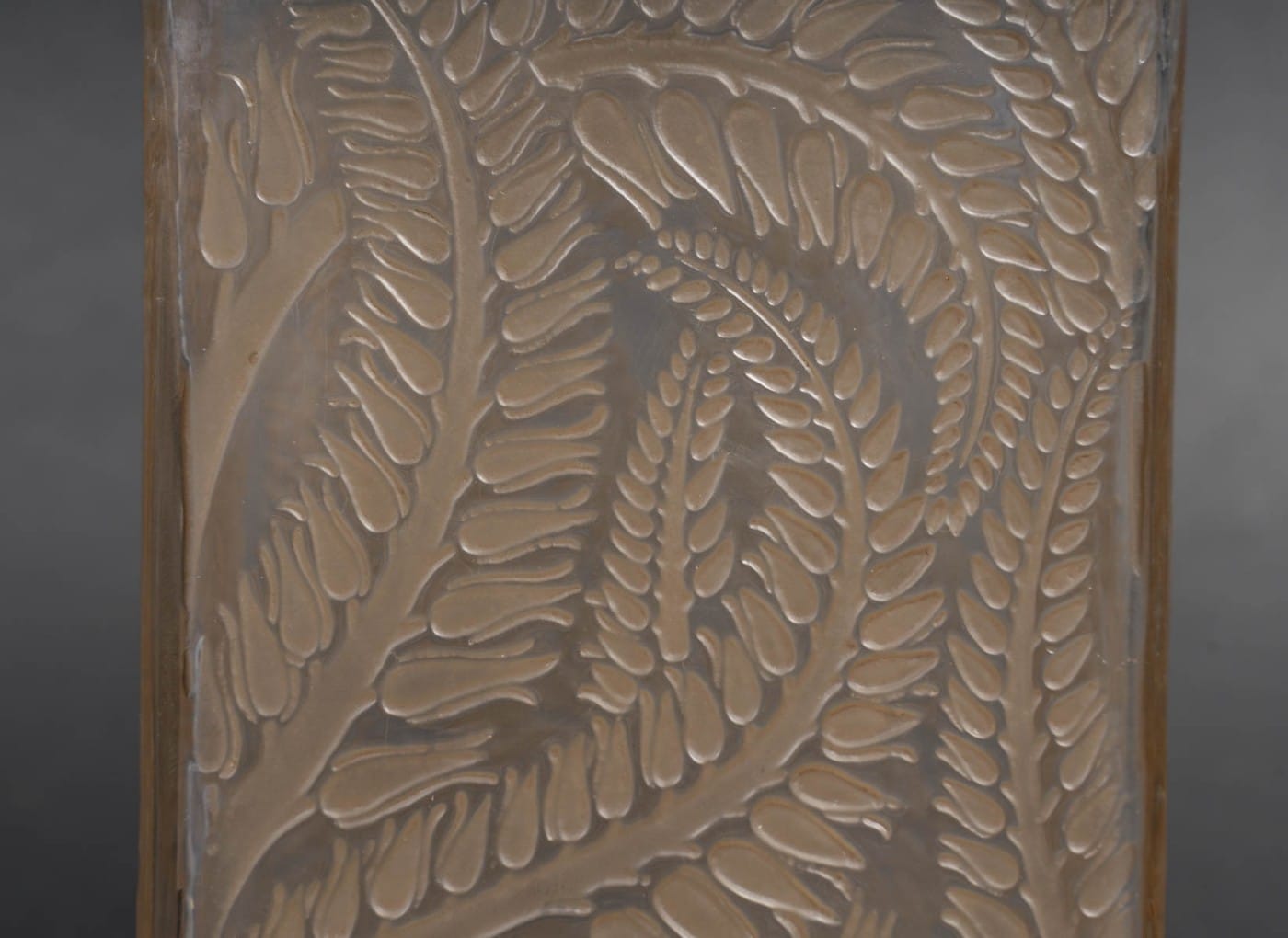 Vase en verre blanc soufflé, moulé, patiné et couleur ambrée. Décor aux Fougères.