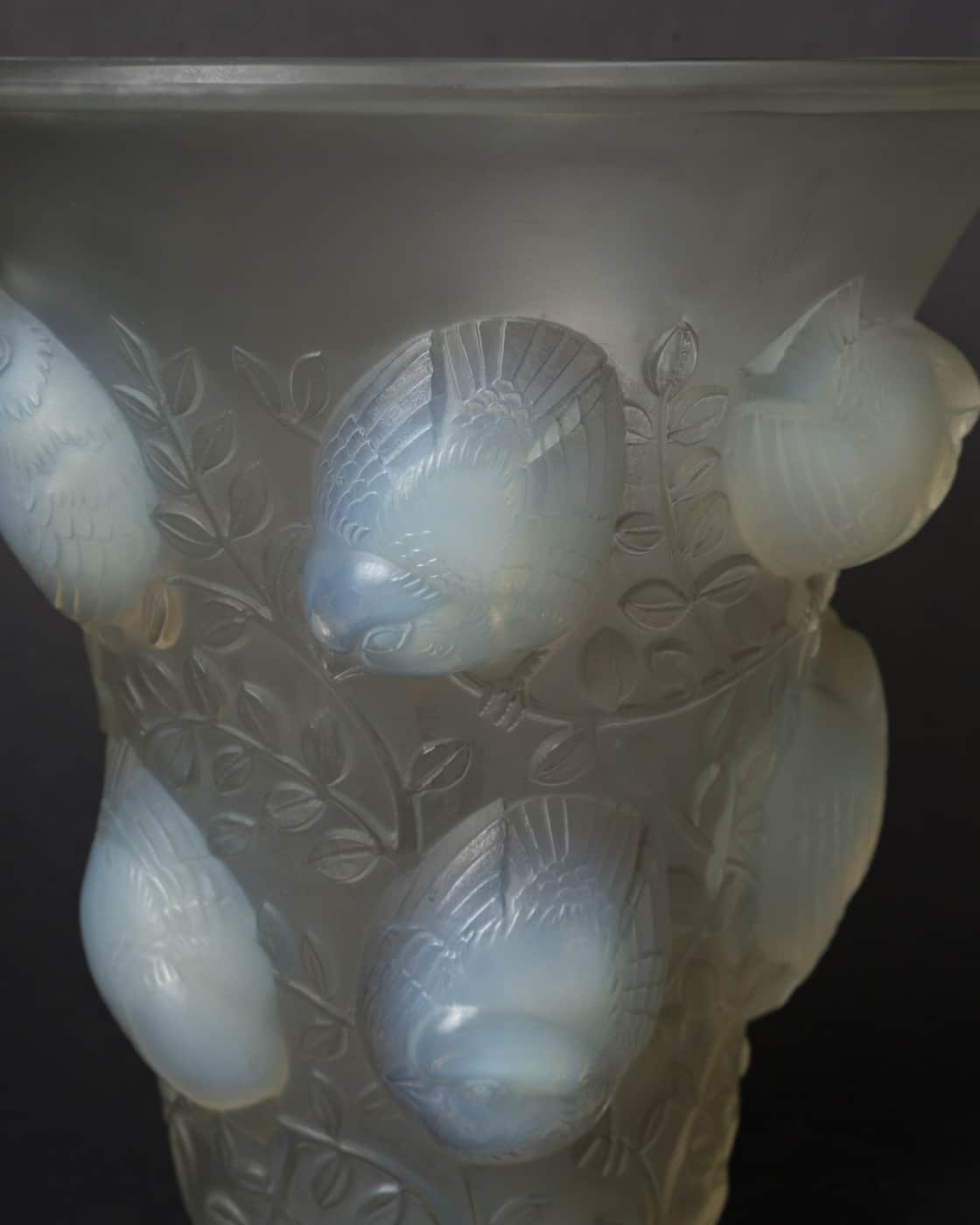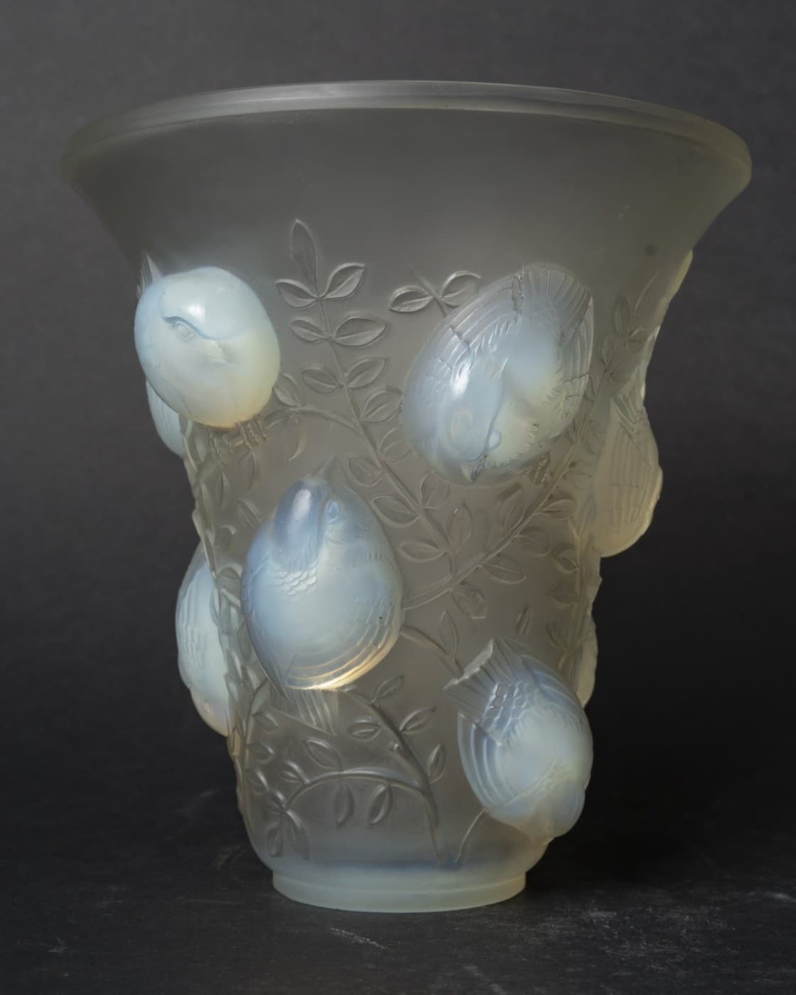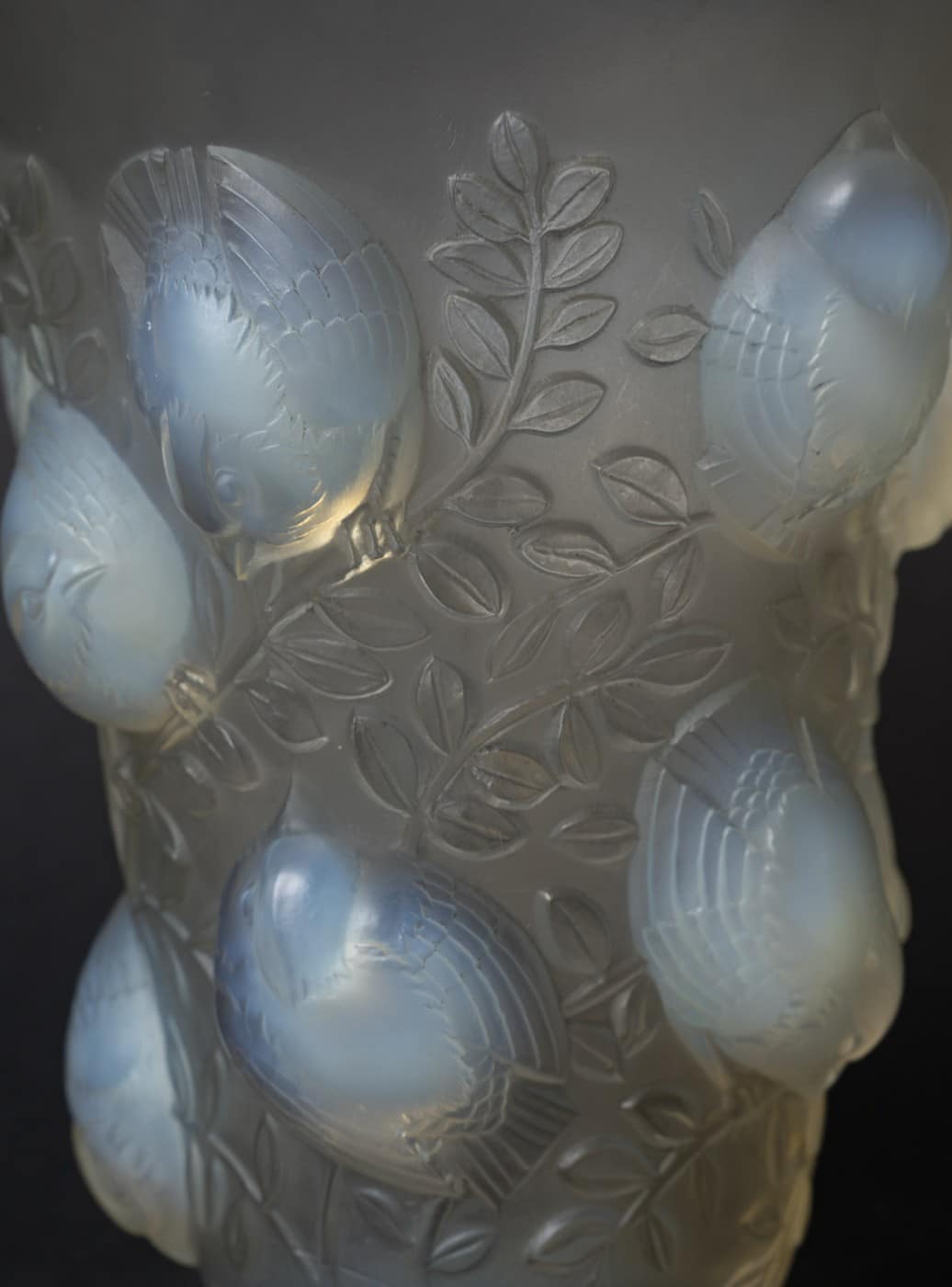 Vase en verre blanc moulé et pressé opalescent représentant des moineaux sur leur branche.