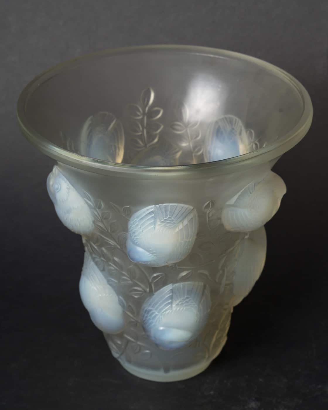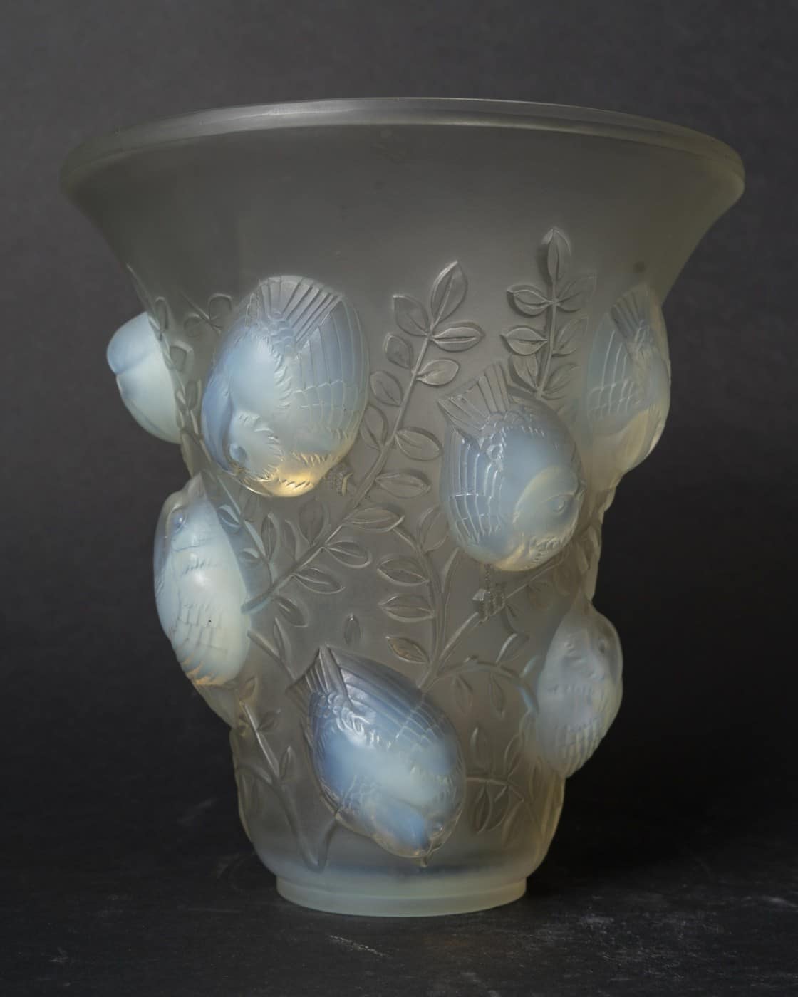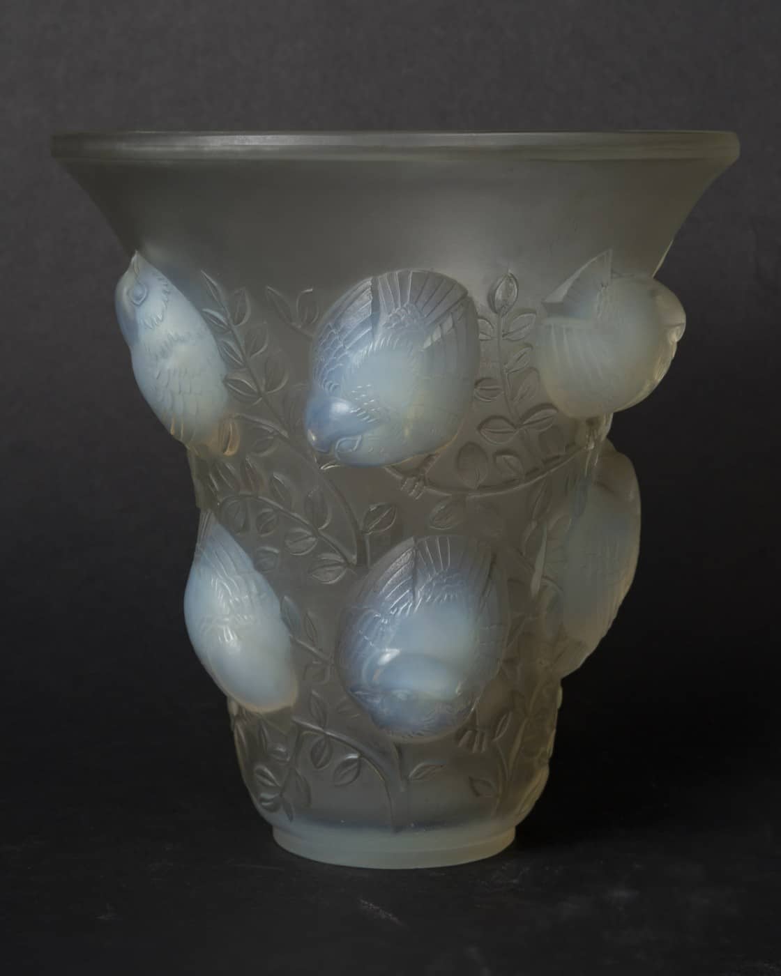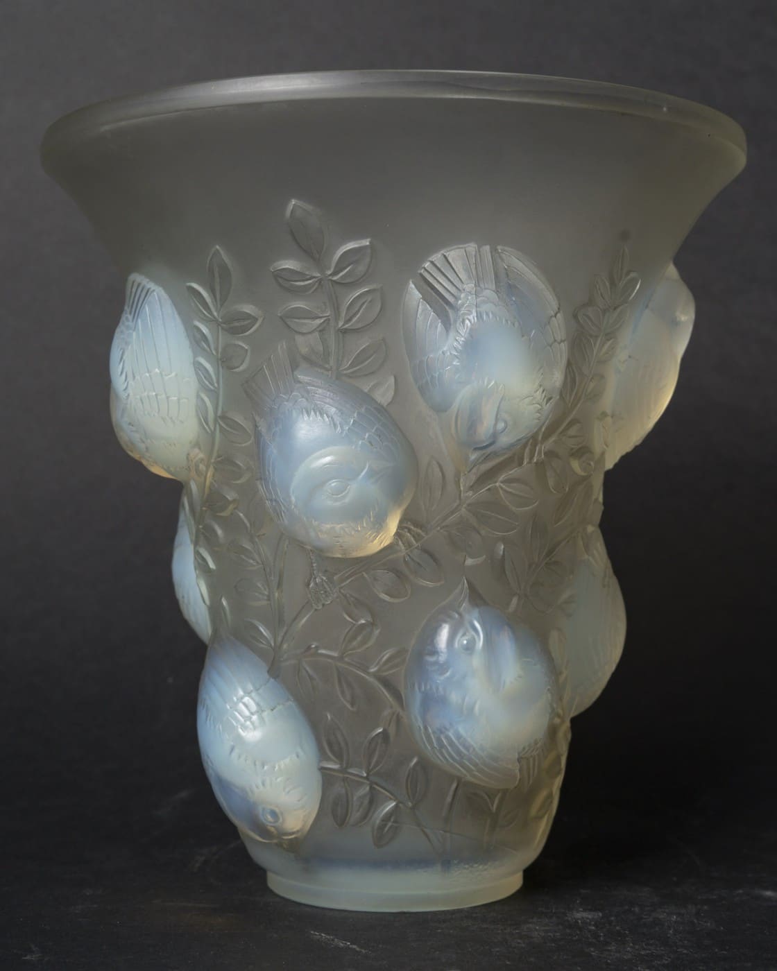 Vase en verre blanc moulé et pressé opalescent représentant des moineaux sur leur branche.