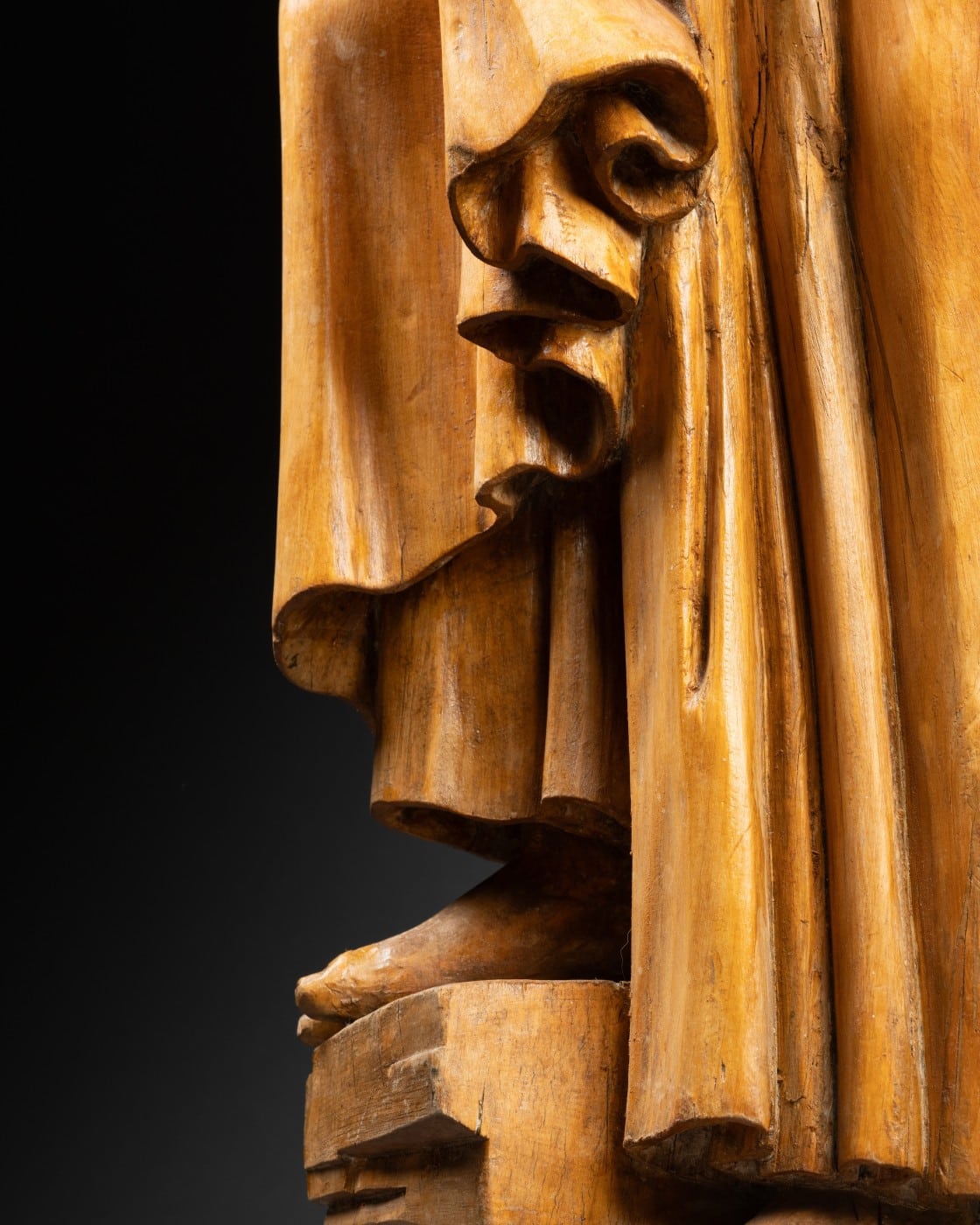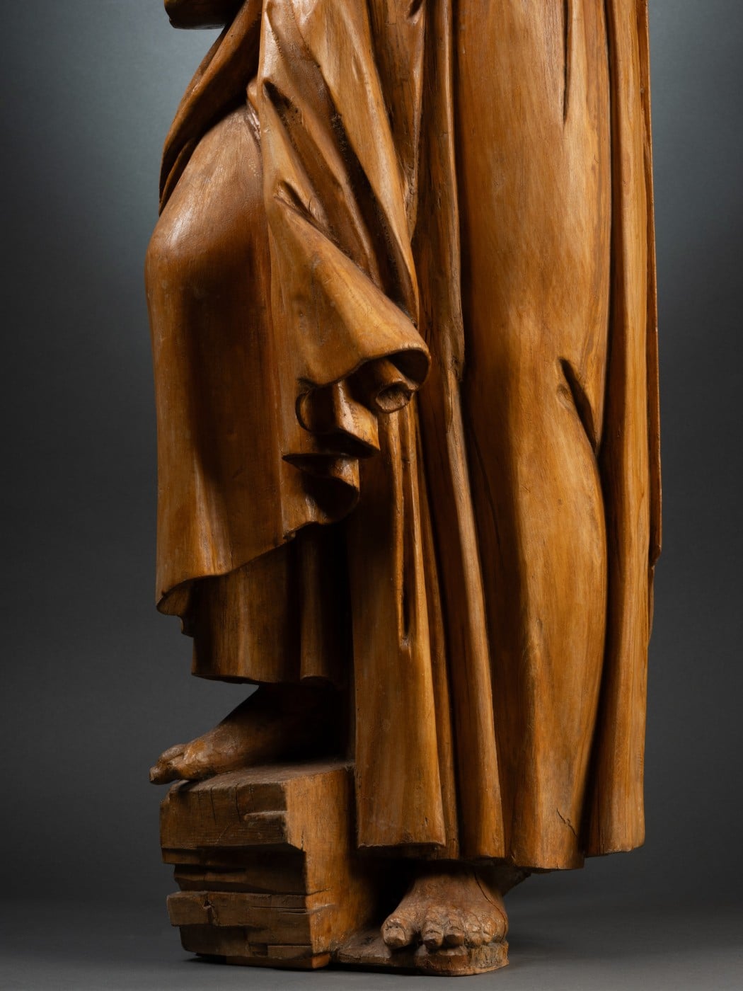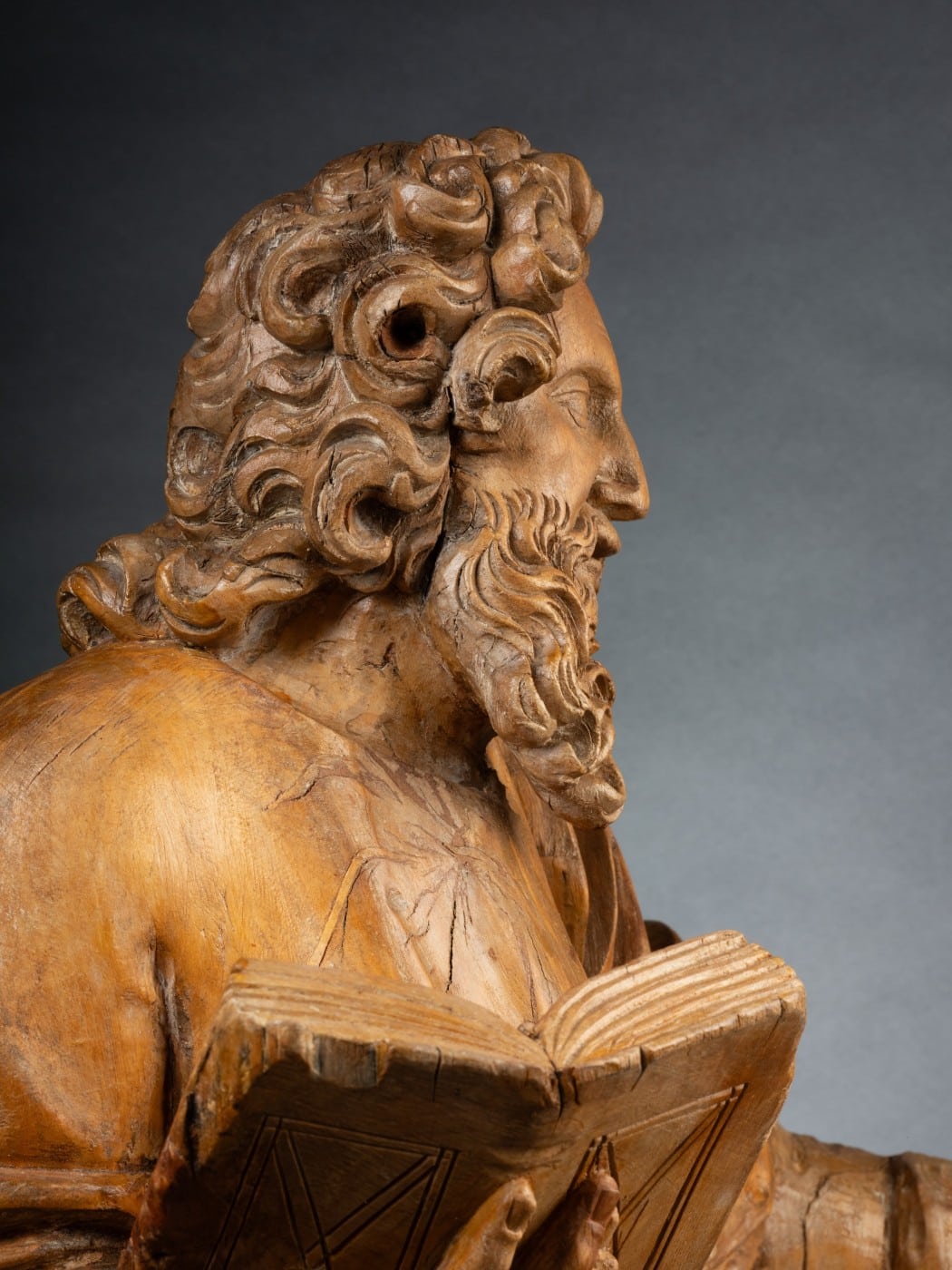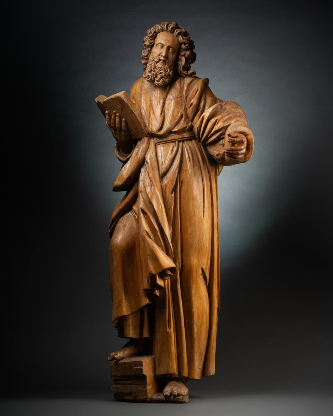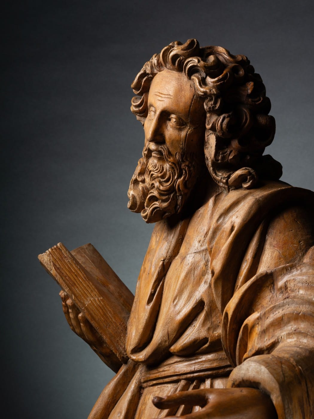 Notre sculpture en pin cembro représente un homme fort, un pied posé sur un rocher, tenant un livre ouvert dans une main. Et l’on devine qu’il tenait un objet de l’autre main entrouverte. Quel pourrait donc être ce saint ? Paul qui aurait perdu son épée, Philippe sans la croix ou encore saint Jacques le Majeur sans son bâton de pèlerin ? La question reste ouverte et cela ajoute à la beauté et au raffinement de notre sculpture anciennement polychrome.