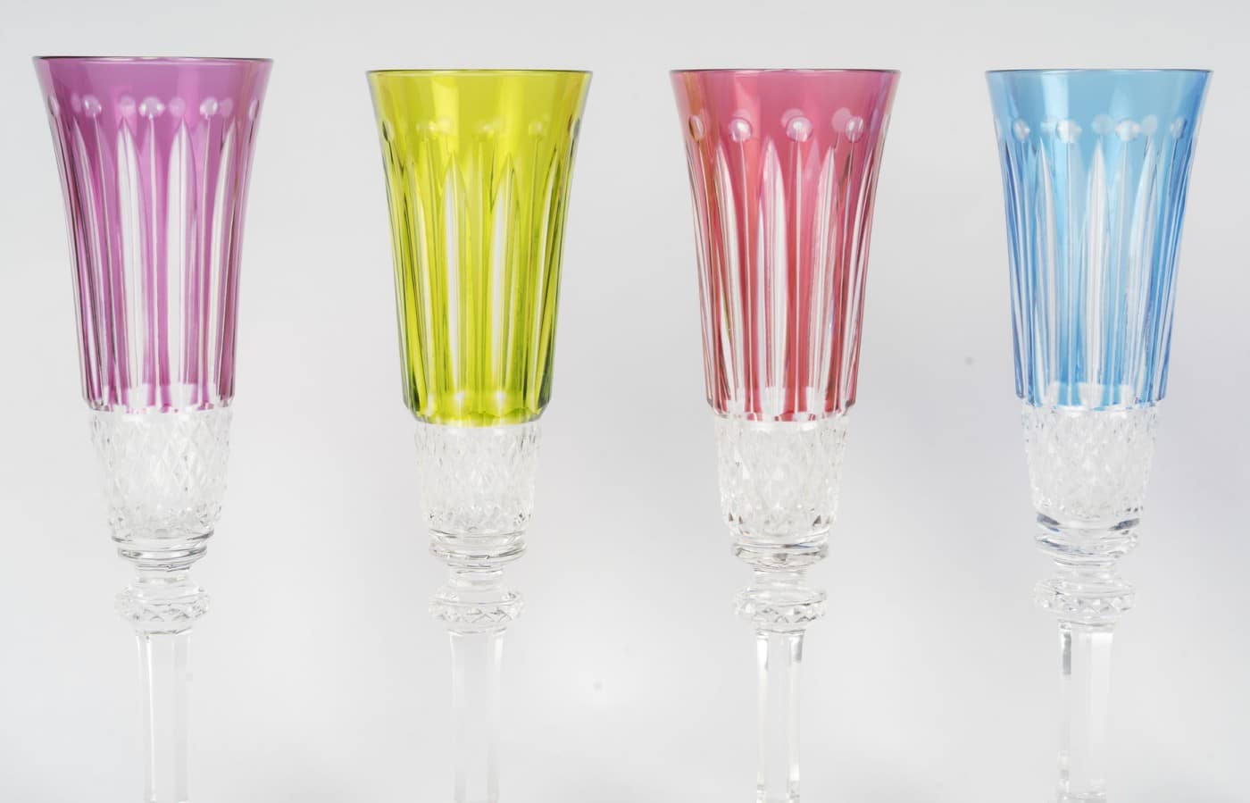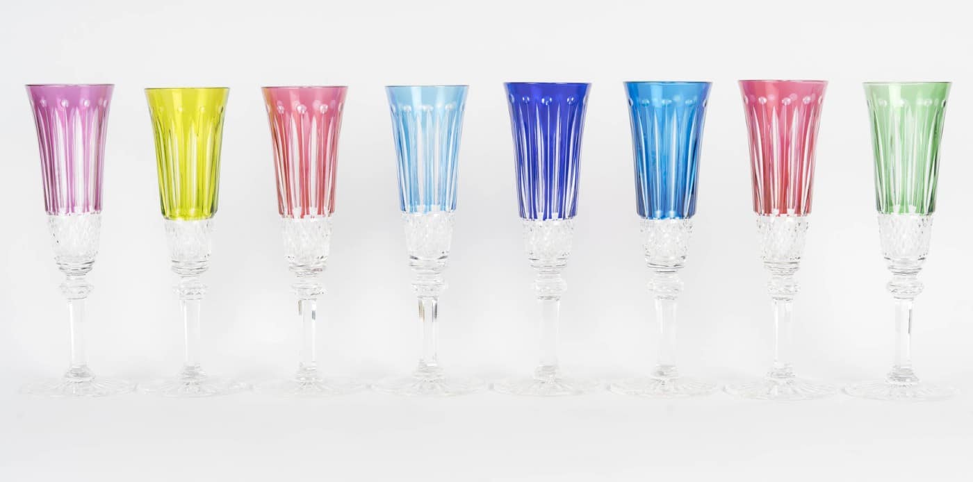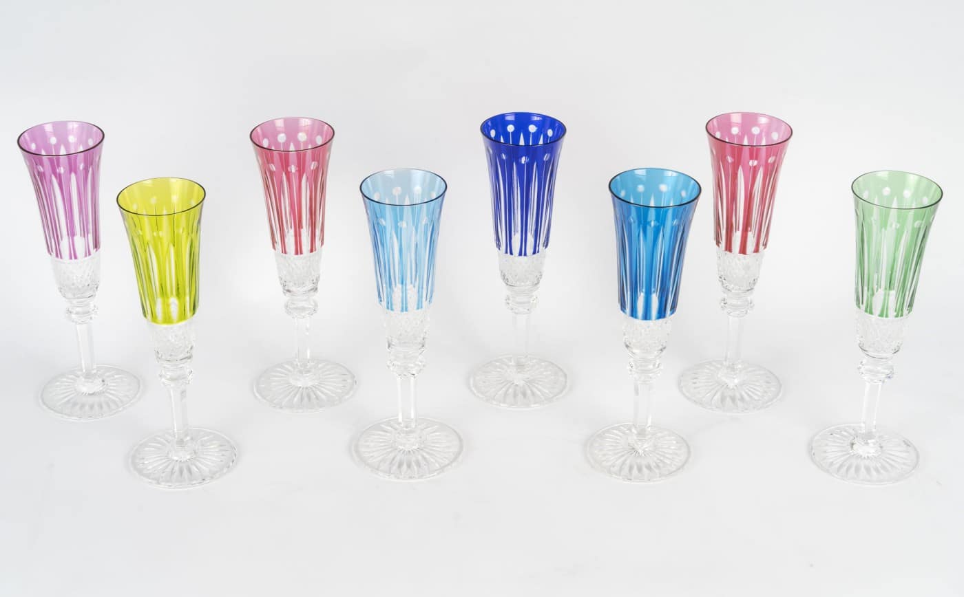 Suite de 8 flutes à champagne en cristal taillé transparent et teinté bleu, rouge, violet, vert ou jaune.