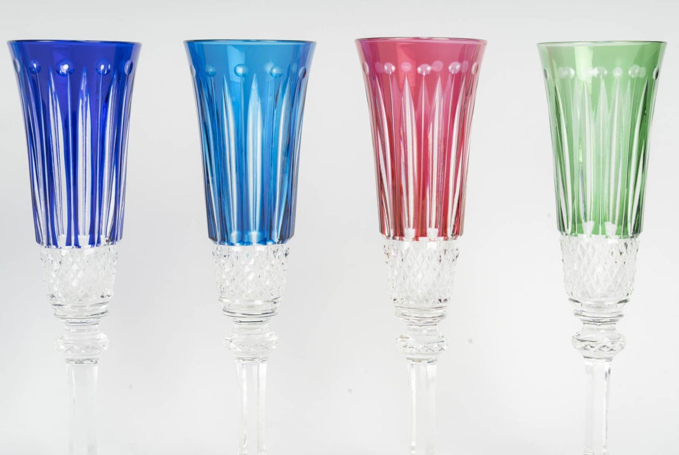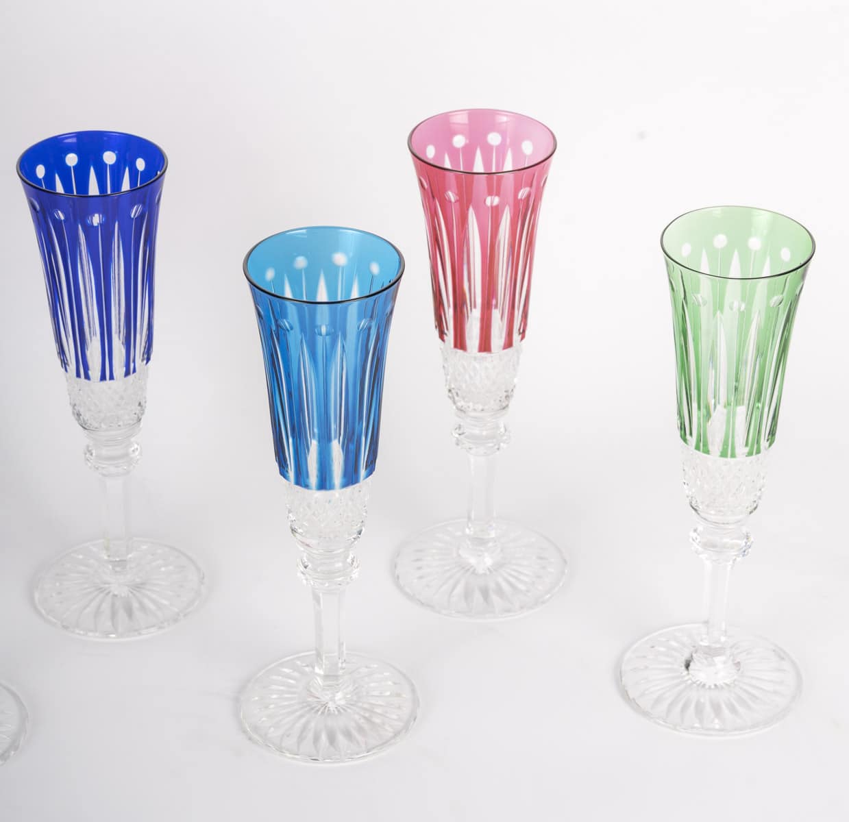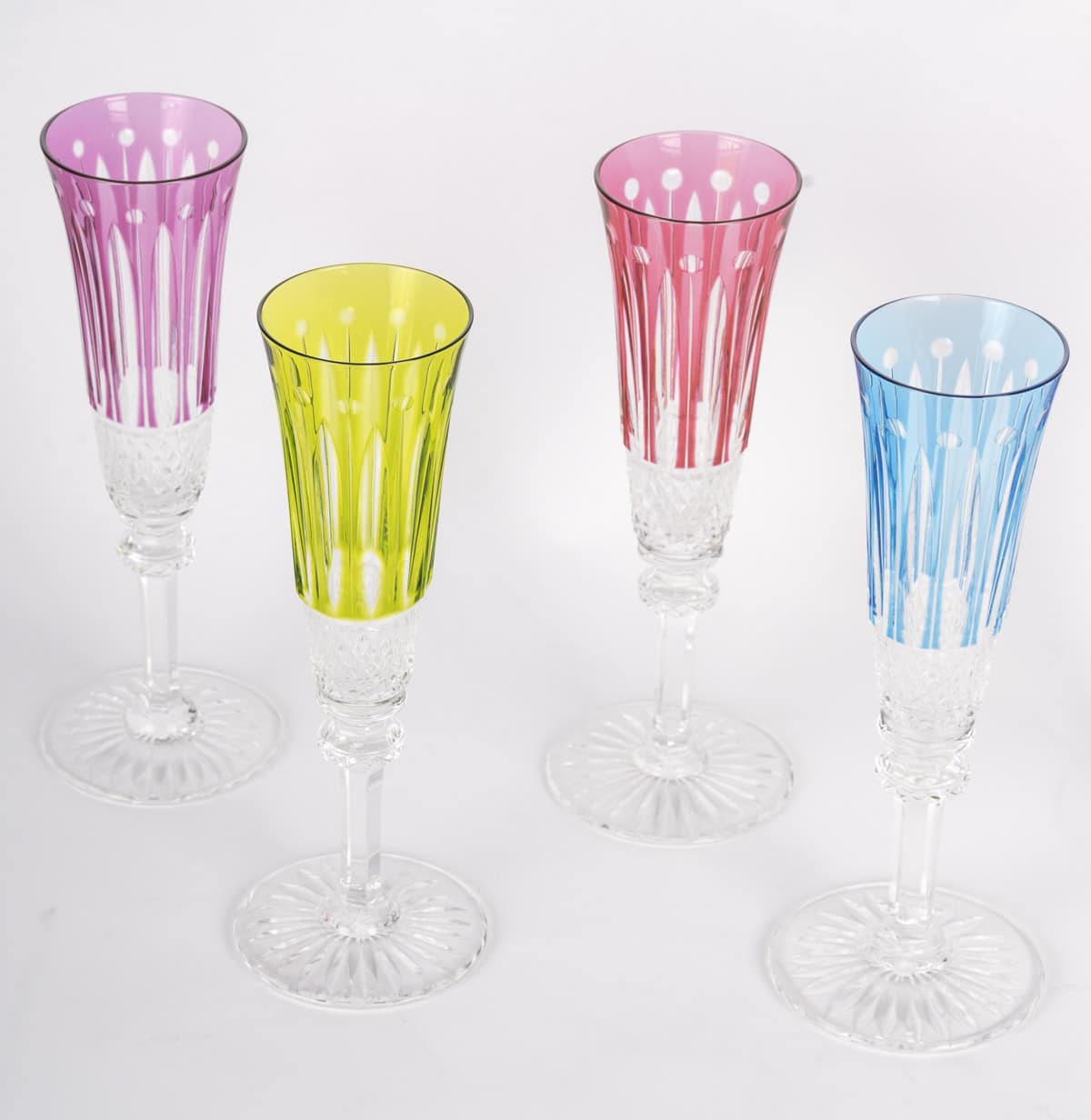 Suite de 8 flutes à champagne en cristal taillé transparent et teinté bleu, rouge, violet, vert ou jaune.