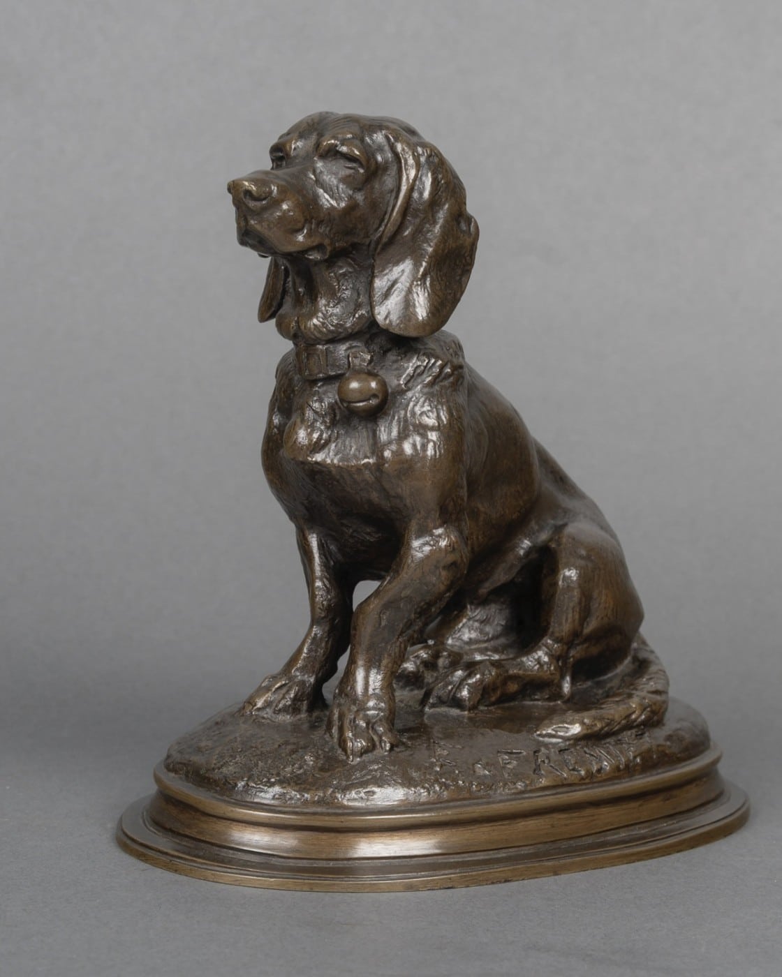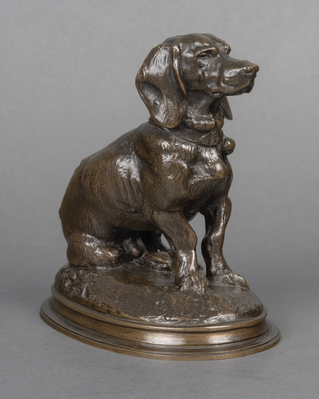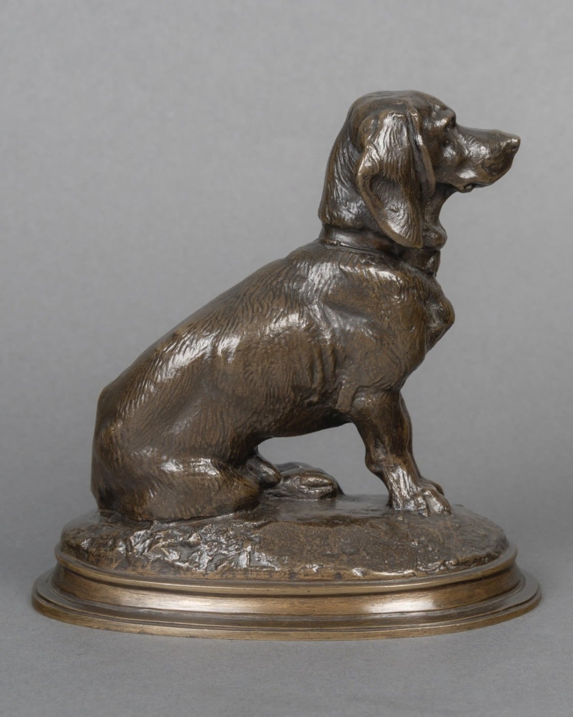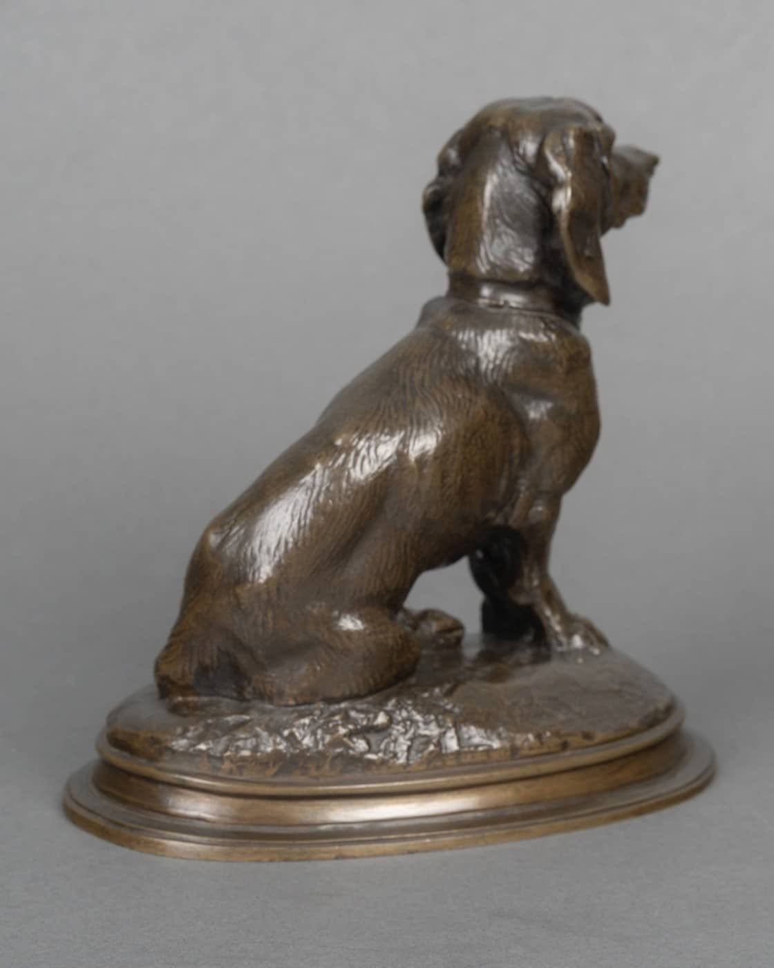 Épreuve en bronze à patine brune , figurant le basset assis « Ravageot » , issu du groupe « Ravageot et Ravageode » , célèbres bassets de Napoléon III , exposés au Salon de 1853 , par le sculpteur Emmanuel Frémiet (1824 -1910) .