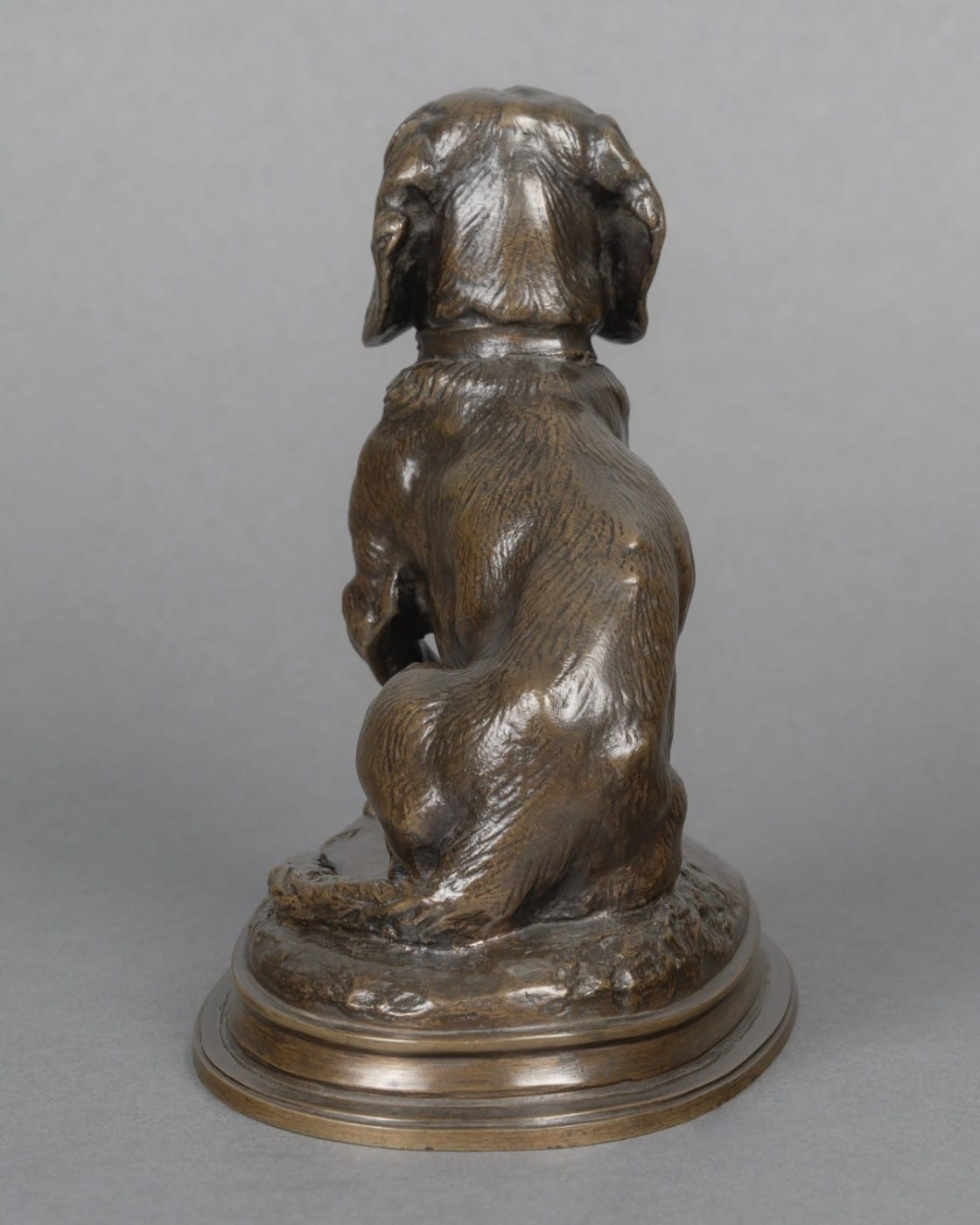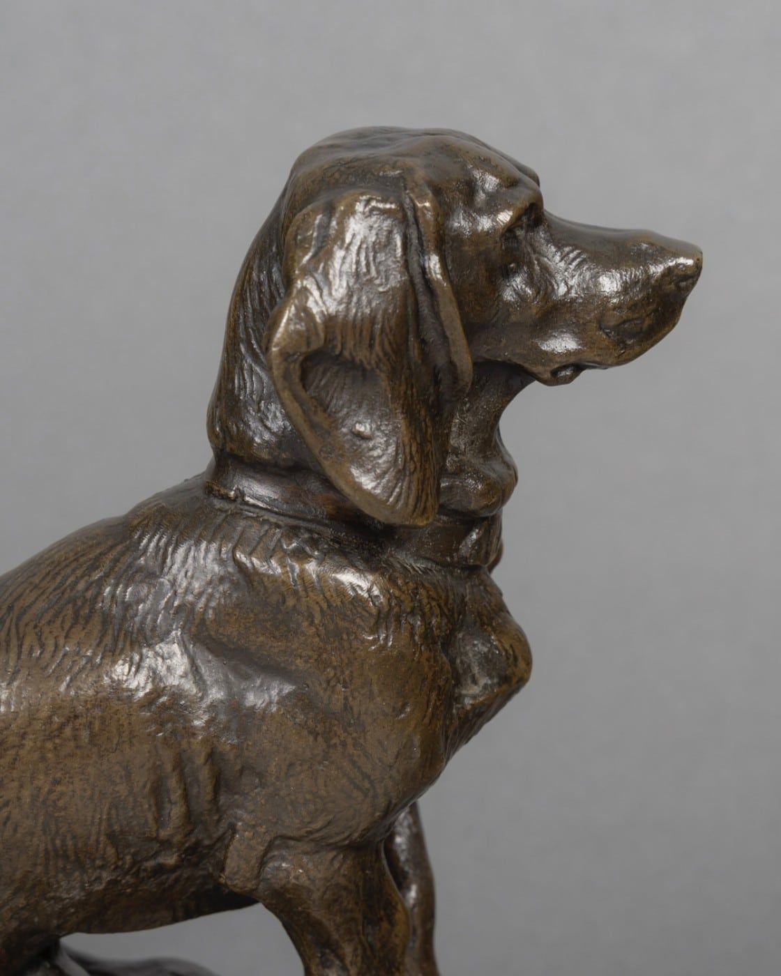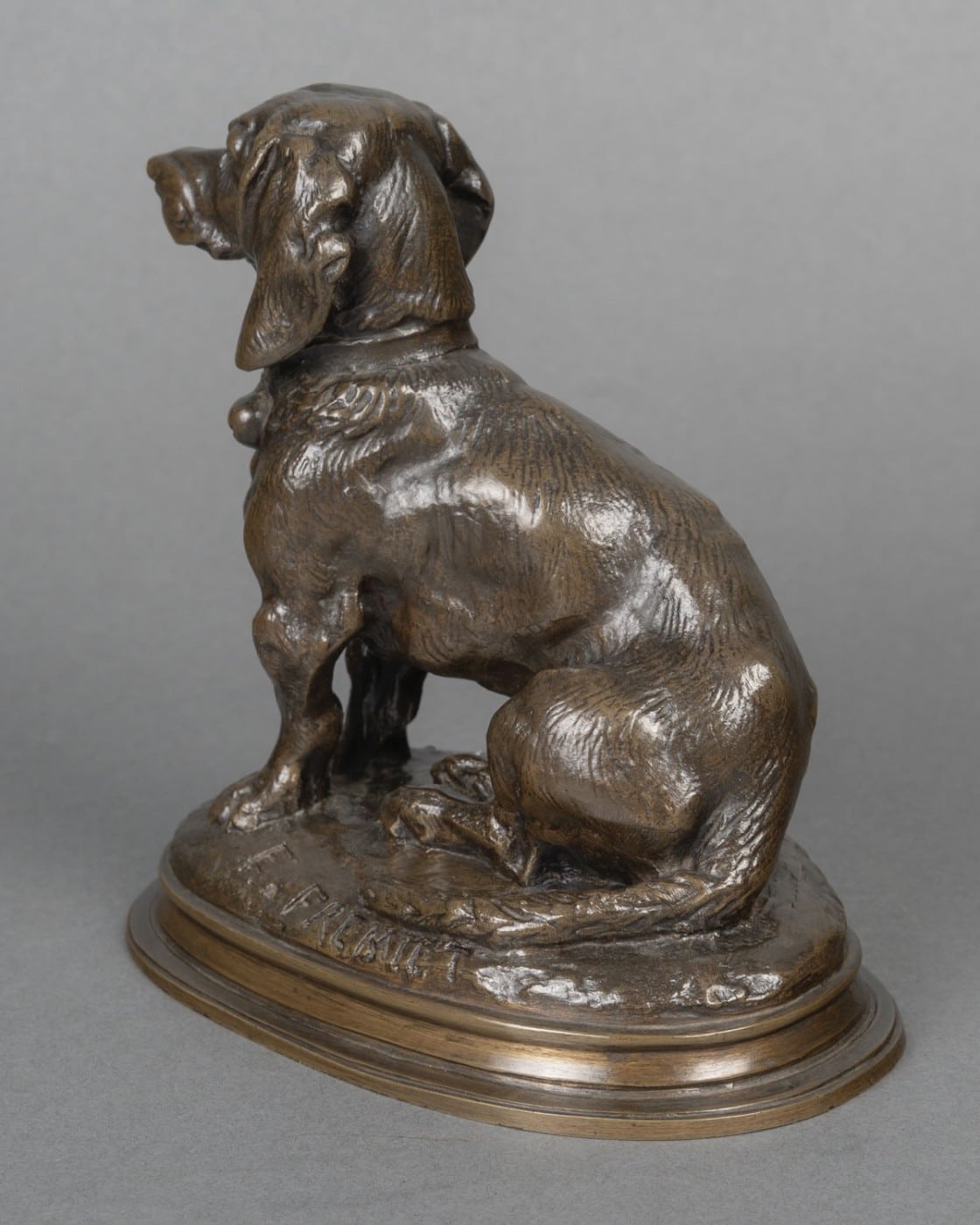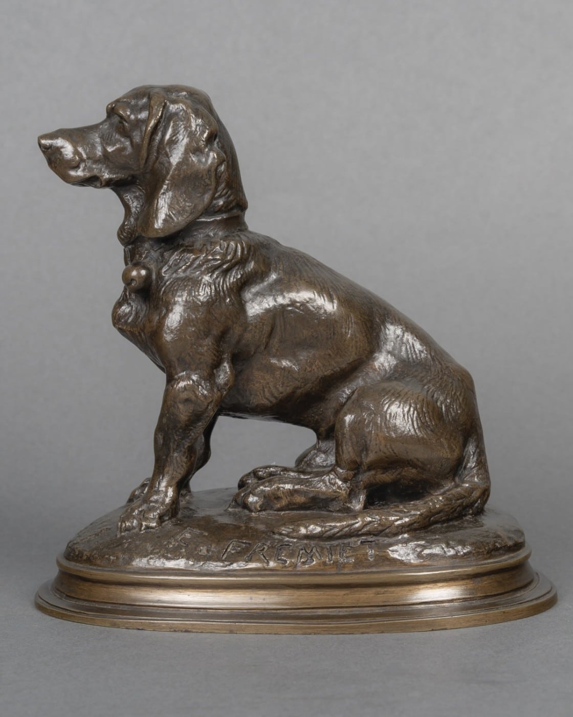 Épreuve en bronze à patine brune , figurant le basset assis « Ravageot » , issu du groupe « Ravageot et Ravageode » , célèbres bassets de Napoléon III , exposés au Salon de 1853 , par le sculpteur Emmanuel Frémiet (1824 -1910) .