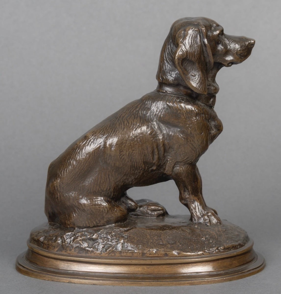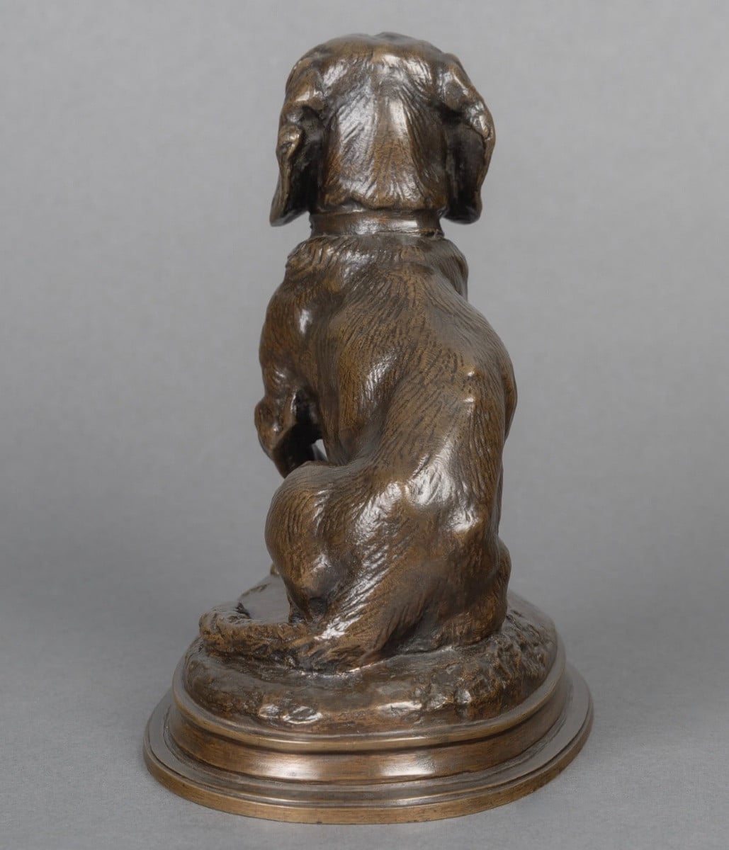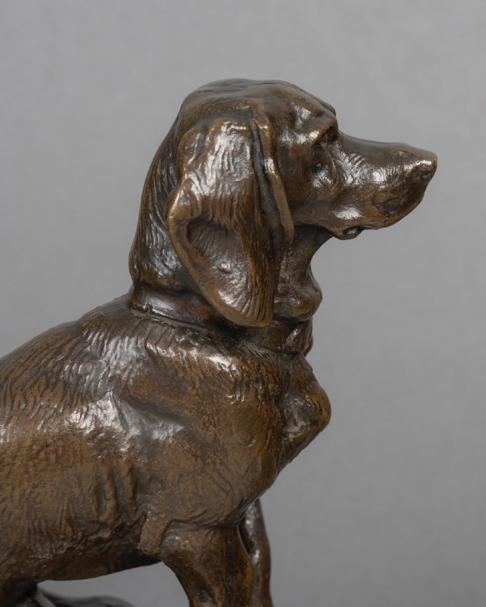 Rare épreuve en bronze à patine brune , figurant le basset assis « Ravageot » , issu du groupe « Ravageot et Ravageode » , célèbres bassets de Napoléon III , exposés au Salon de 1853 , par le sculpteur Emmanuel Frémiet (1824 -1910) .