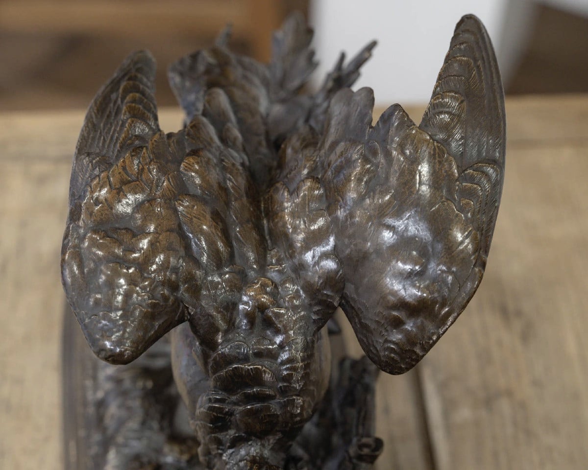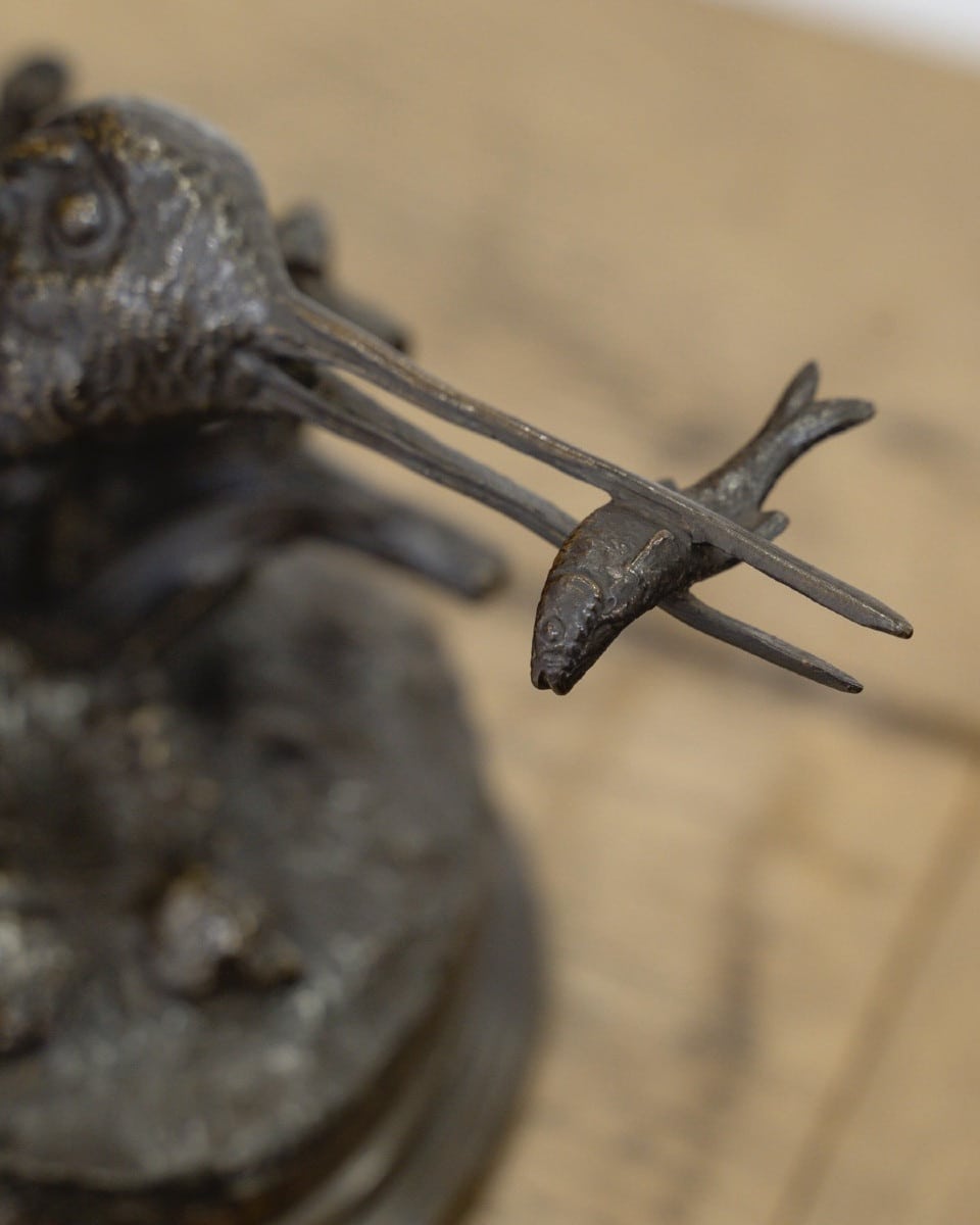Épreuve en bronze à patine brune , figurant une bécasse prête à l’envol , après avoir pêché un poisson , qu’elle tient fièrement dans son long bec , par le sculpteur Jules Moigniez (1835-1894) .