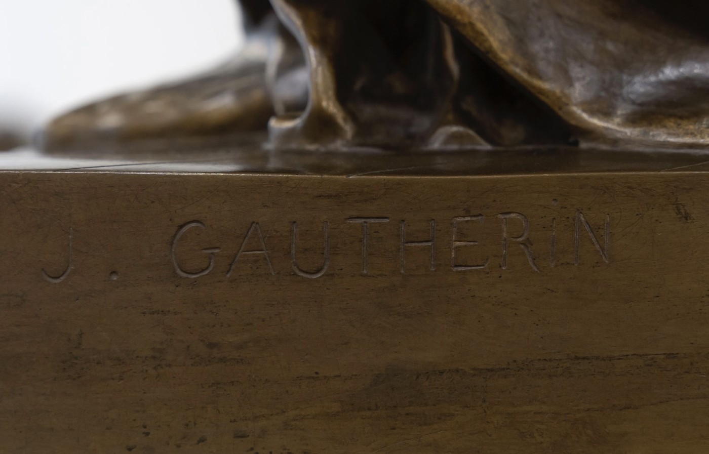 Signature du sculpteur « J.GAUTHERIN » en creux , sur le coté droit de la terrasse .