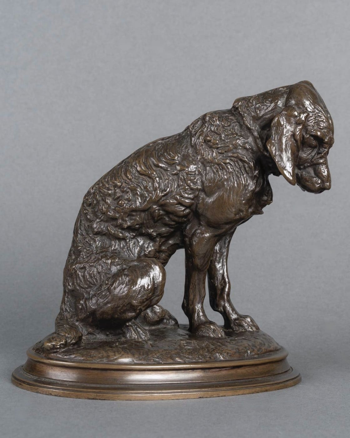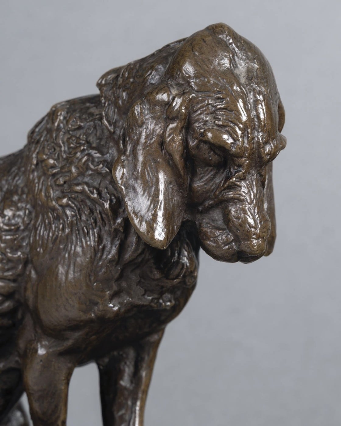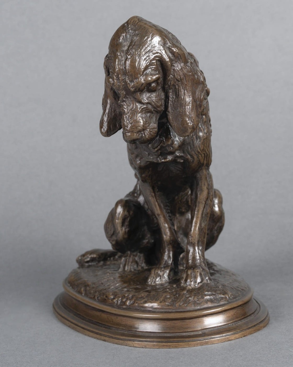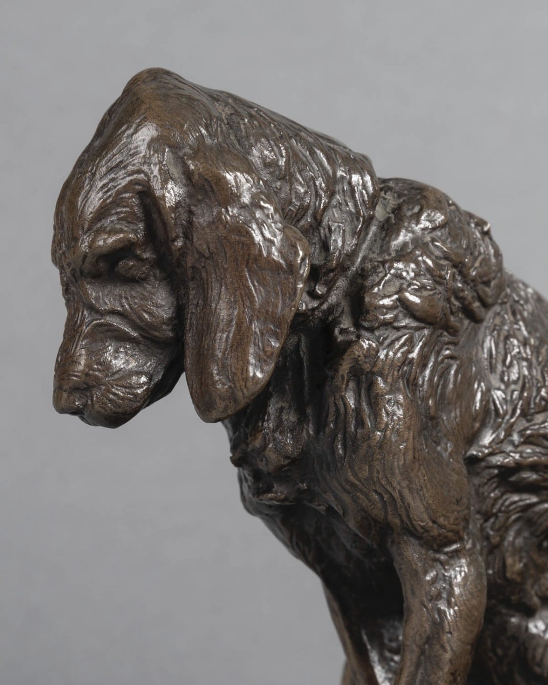 Le chien de chasse figure assis , la tête baissée , il est souvent nommé « Le Chien Boudeur » dans les ouvrages concernant les oeuvres du sculpteur .