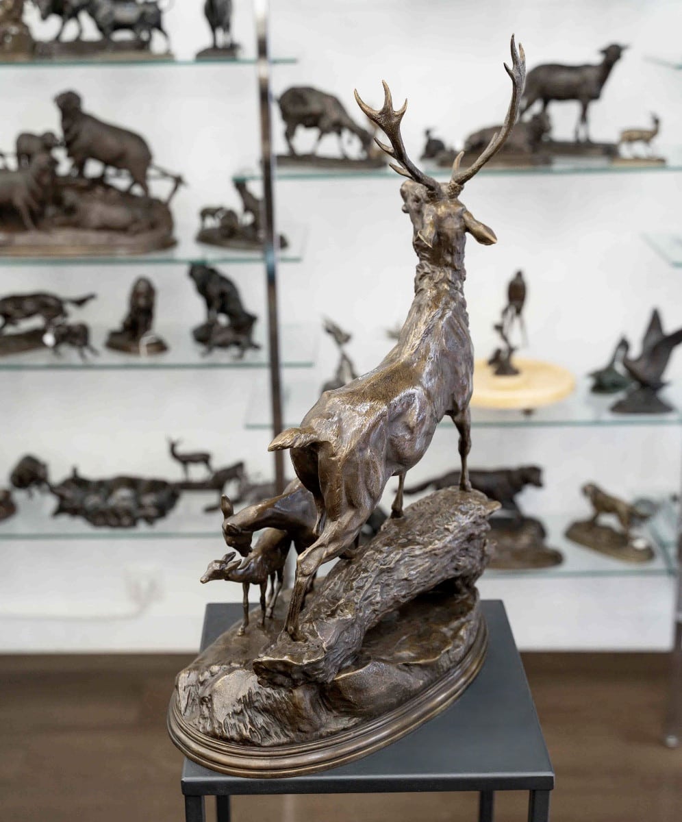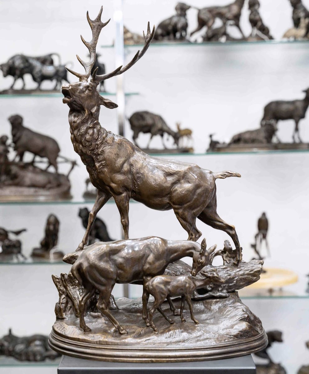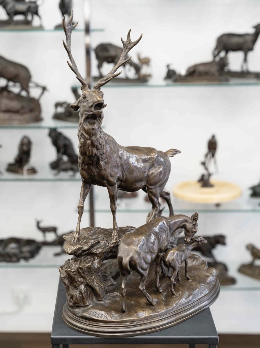 Important groupe en bronze à patine brune , représentant une famille de cervidés , composée d’un cerf bramant , d’une biche et de leur faon , par le sculpteur Hippolyte Heizler (1828-1871).