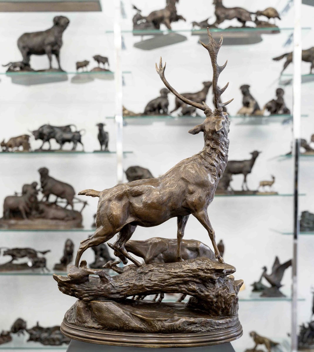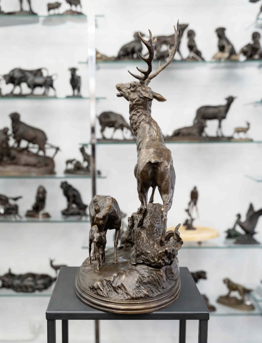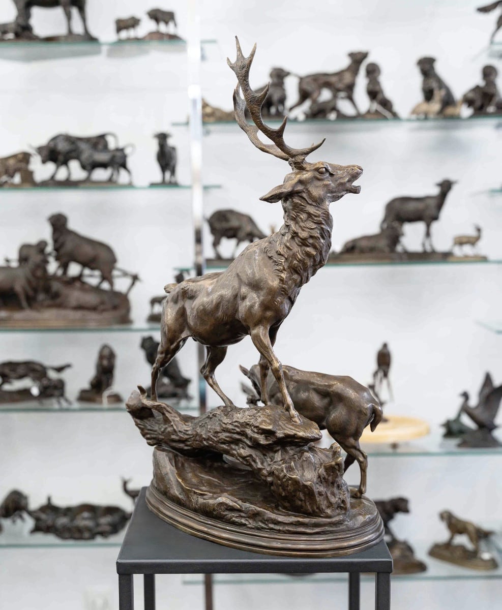 Important groupe en bronze à patine brune , représentant une famille de cervidés , composée d’un cerf bramant , d’une biche et de leur faon , par le sculpteur Hippolyte Heizler (1828-1871).