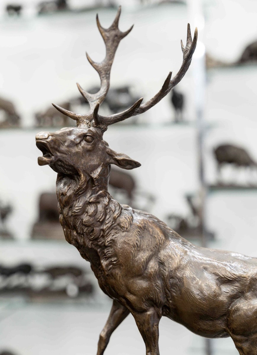 Le cerf repose en hauteur sur un tronc , il est en plein brame , le sculpteur met en avant l’aspect majestueux et imposant du cerf , qui contraste avec la douceur maternelle de la biche et de son faon .