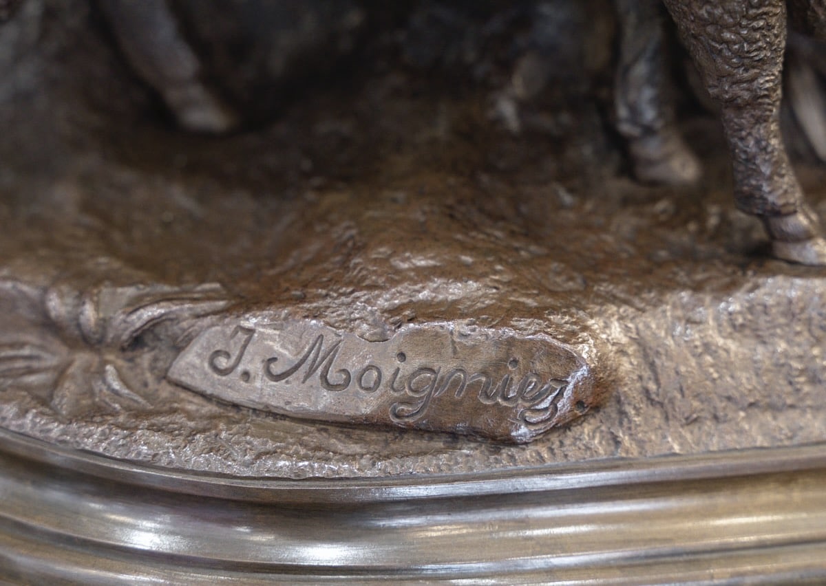 Signature du sculpteur « J.Moigniez » , en creux sur la terrasse naturaliste richement ciselée et ornée .