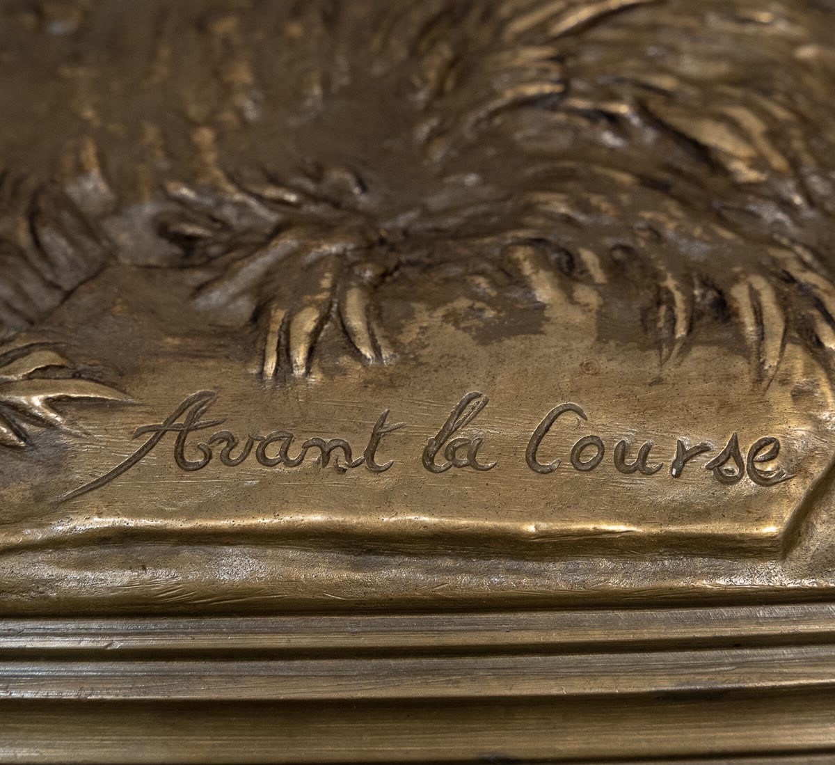 Bronze titré , « Avant la Course » , et signé « J.Moigniez » en creux sur la terrasse naturaliste , à contre-socle mouluré .