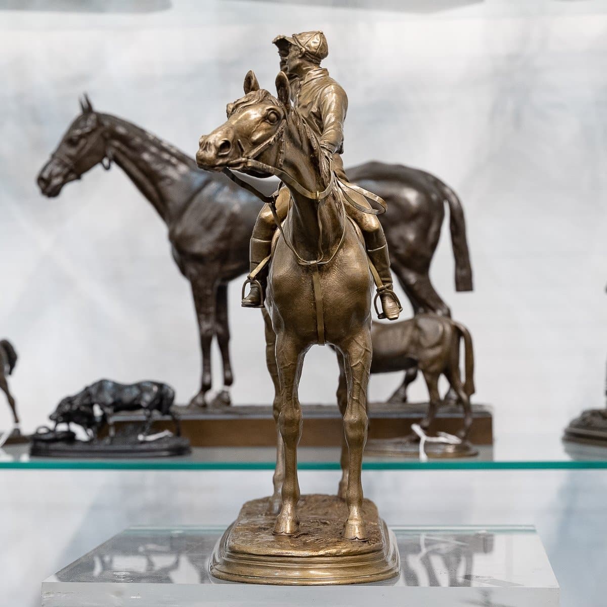 Épreuve en bronze à patine médaille , figurant un jockey à cheval , par le sculpteur Jules Moigniez (1835-1894) .