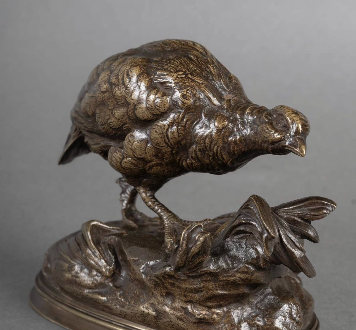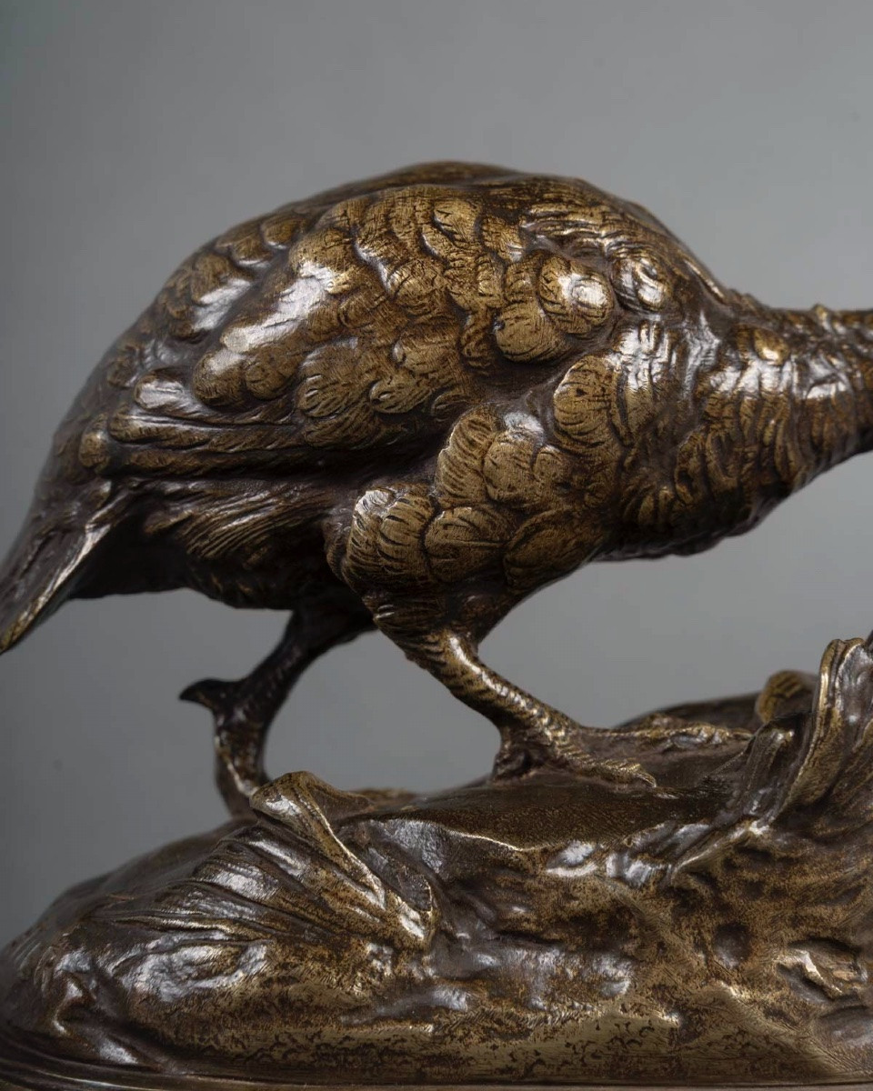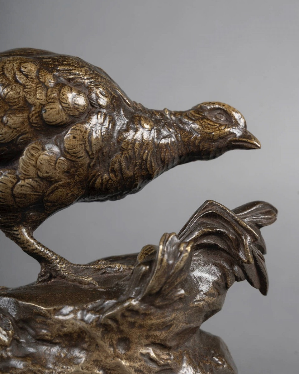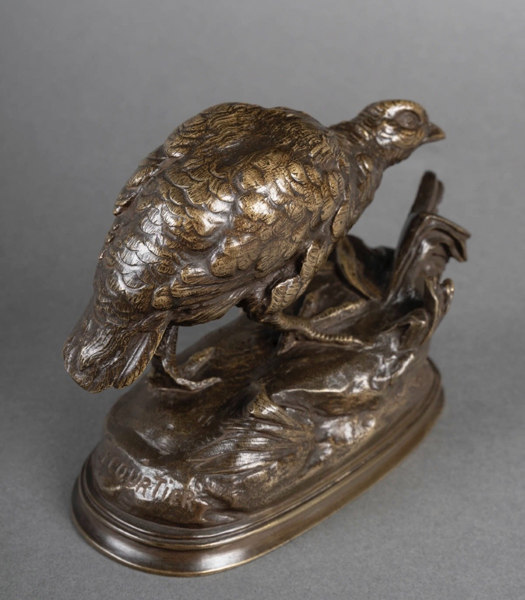 Épreuve en bronze à patine brune nuancée , figurant une perdrix accompagnée d’un escargot , par le sculpteur Prosper Lecourtier (1851-1924) .