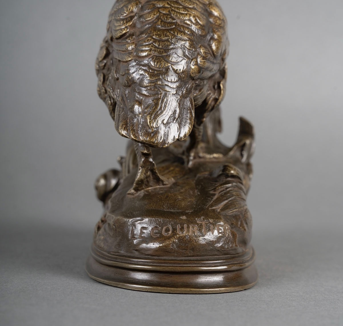 Signature du sculpteur « LECOURTIER » , en creux sur la terrasse ovale naturaliste , enrichie d’un profil .