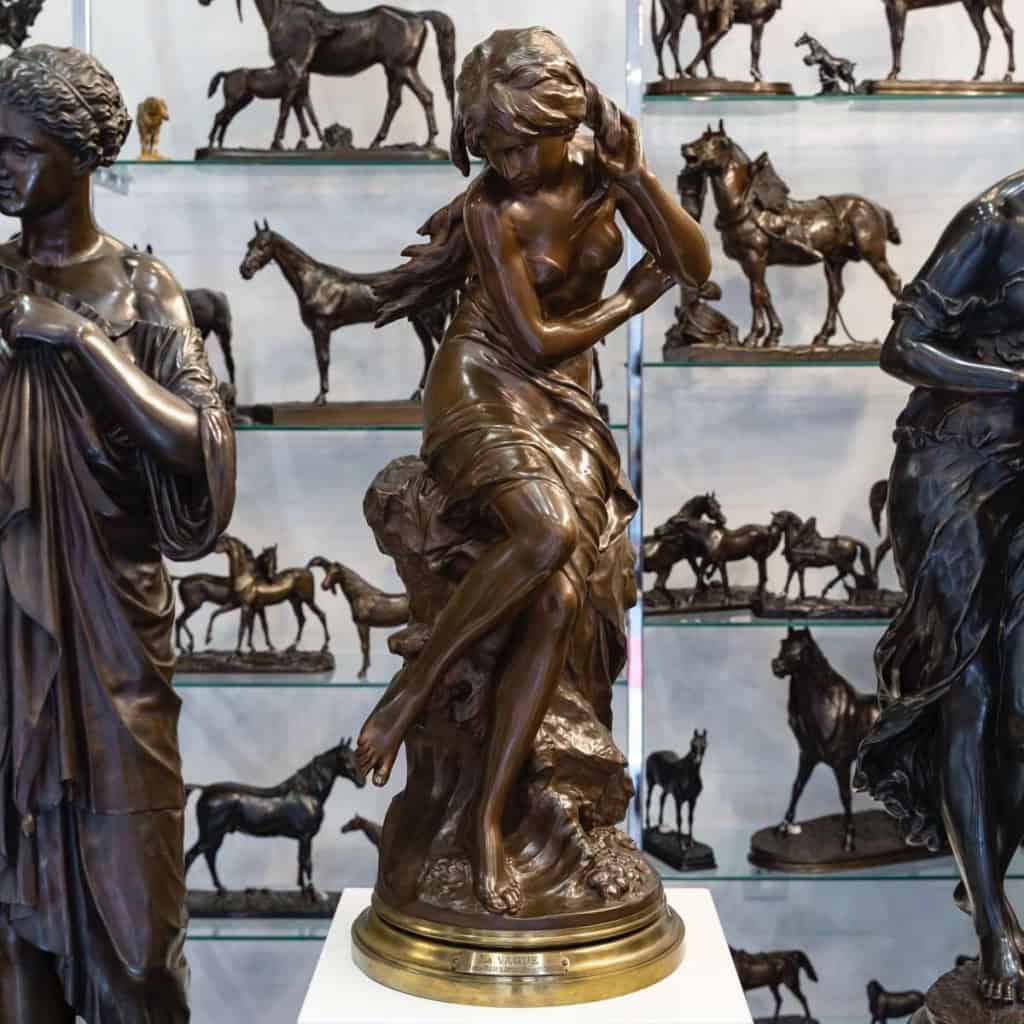 Importante épreuve en bronze figurant une jeune femme dénudée , assise sur un rocher , se protégant de l’arrivée d’une vague , par Mathurin Moreau .
