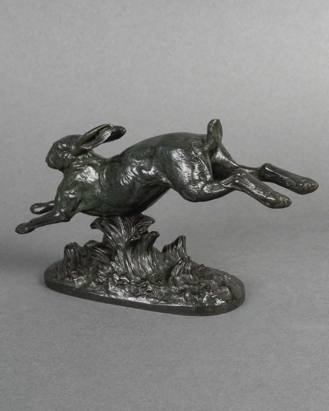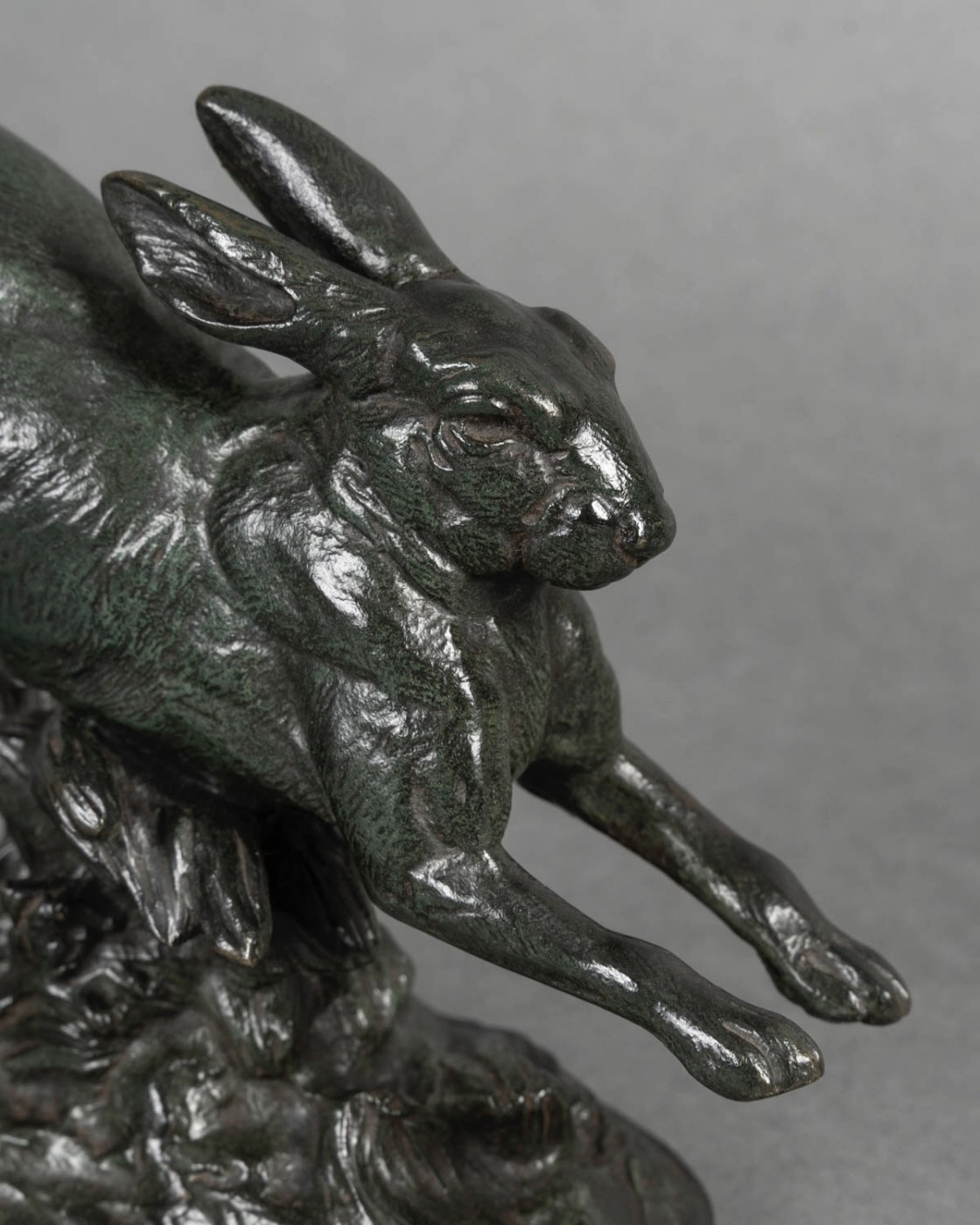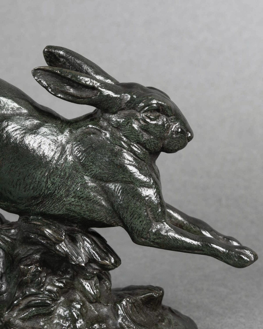 Épreuve en bronze à patine verte , figurant un lièvre courant sur une longue base naturaliste , par le sculpteur Alfred Barye , aussi nommé « Barye Fils »(1839-1882) .