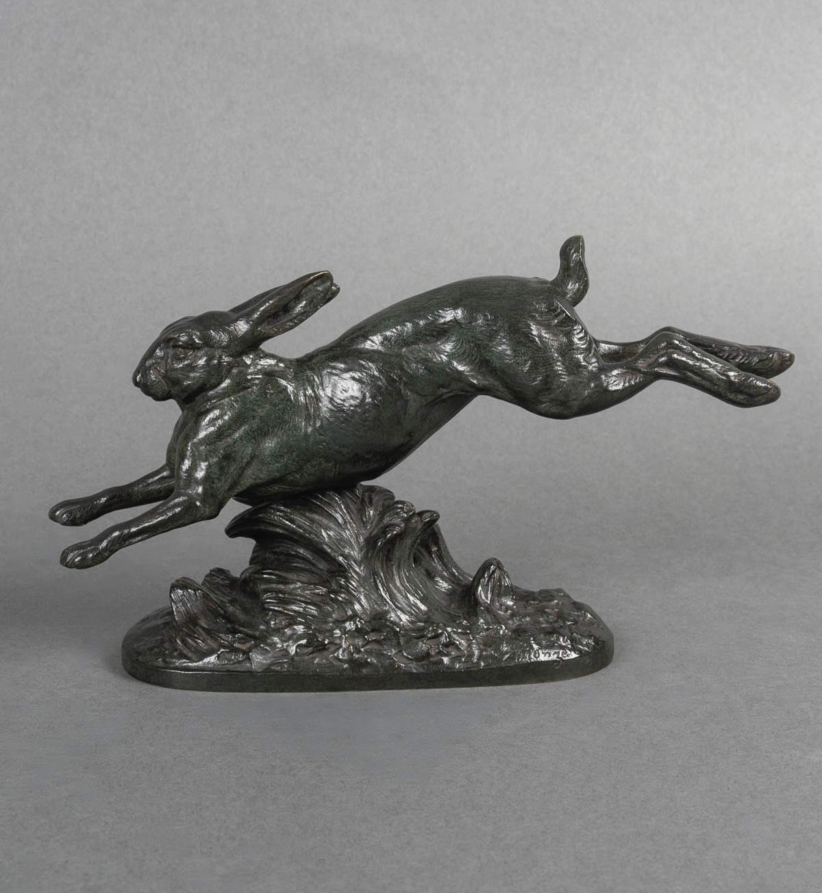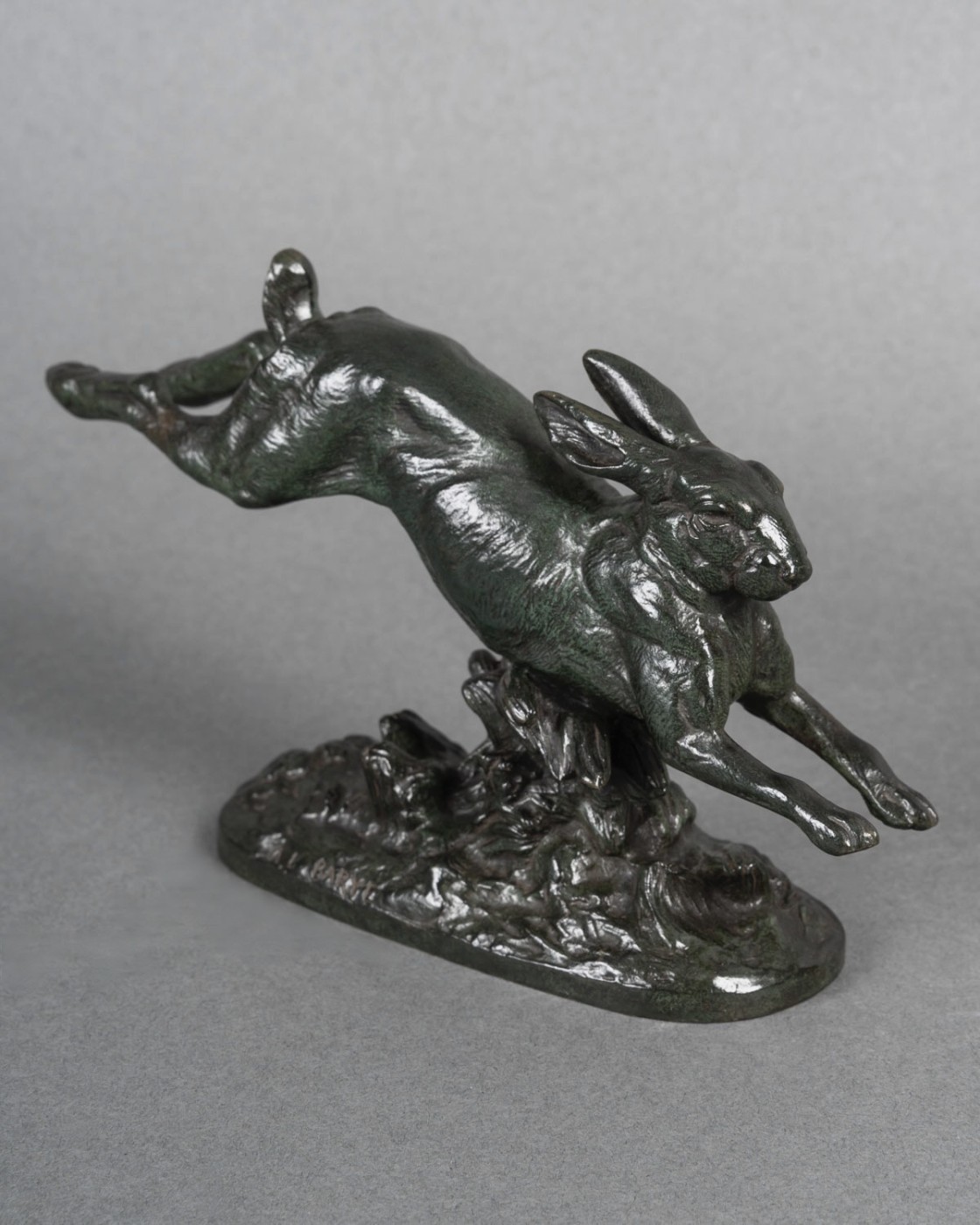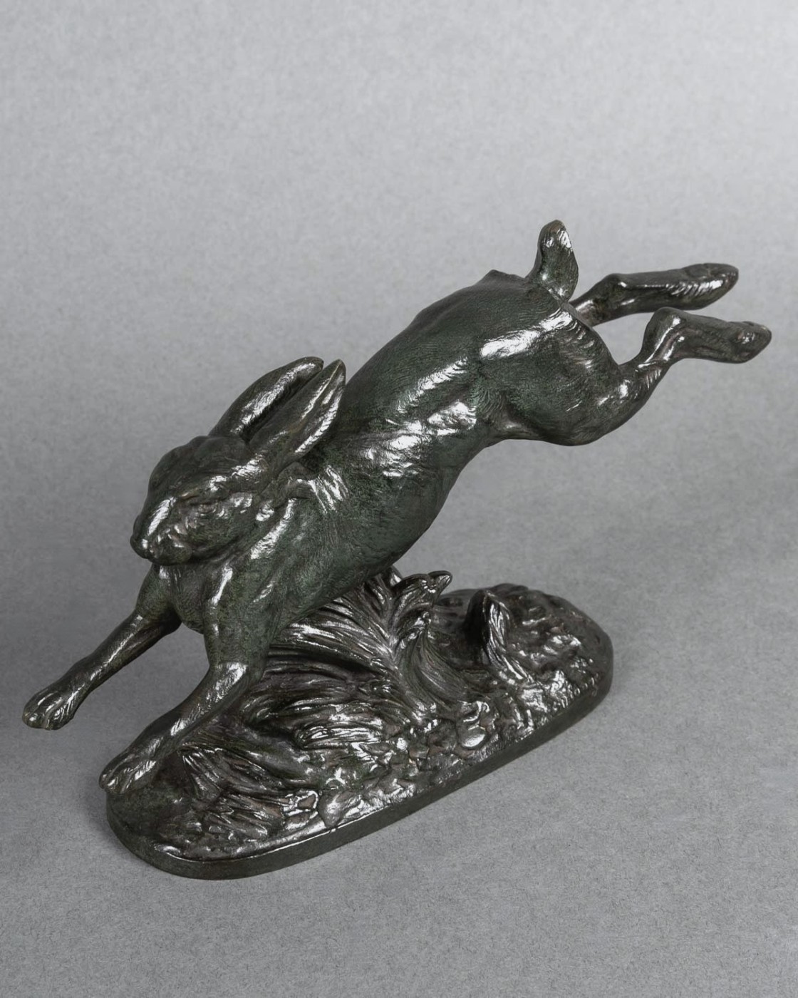 Épreuve en bronze à patine verte , figurant un lièvre courant sur une longue base naturaliste , par le sculpteur Alfred Barye , aussi nommé « Barye Fils »(1839-1882) .