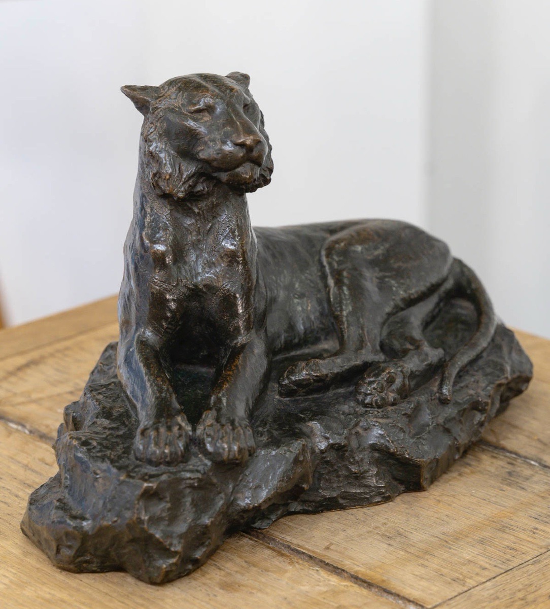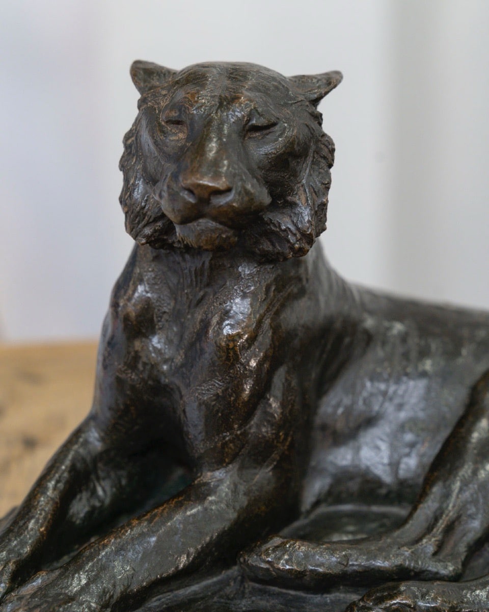 Rare épreuve en bronze à patine brune , intitulée « Le Tigre Couché » , œuvre de François Auguste Hippolyte Peyrol (PEYROL Fils) en collaboration avec Hippolyte Peyrol (PEYROL Père) , constitue une illustration brillante de la synergie entre l’art et la maîtrise technique propre à la famille Peyrol .