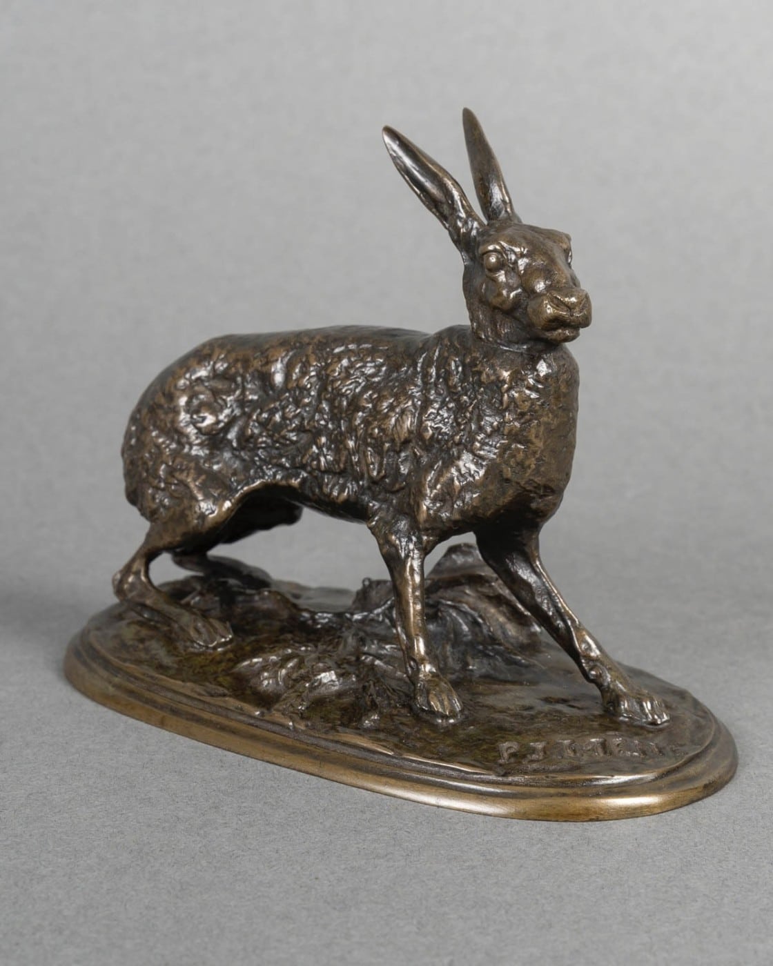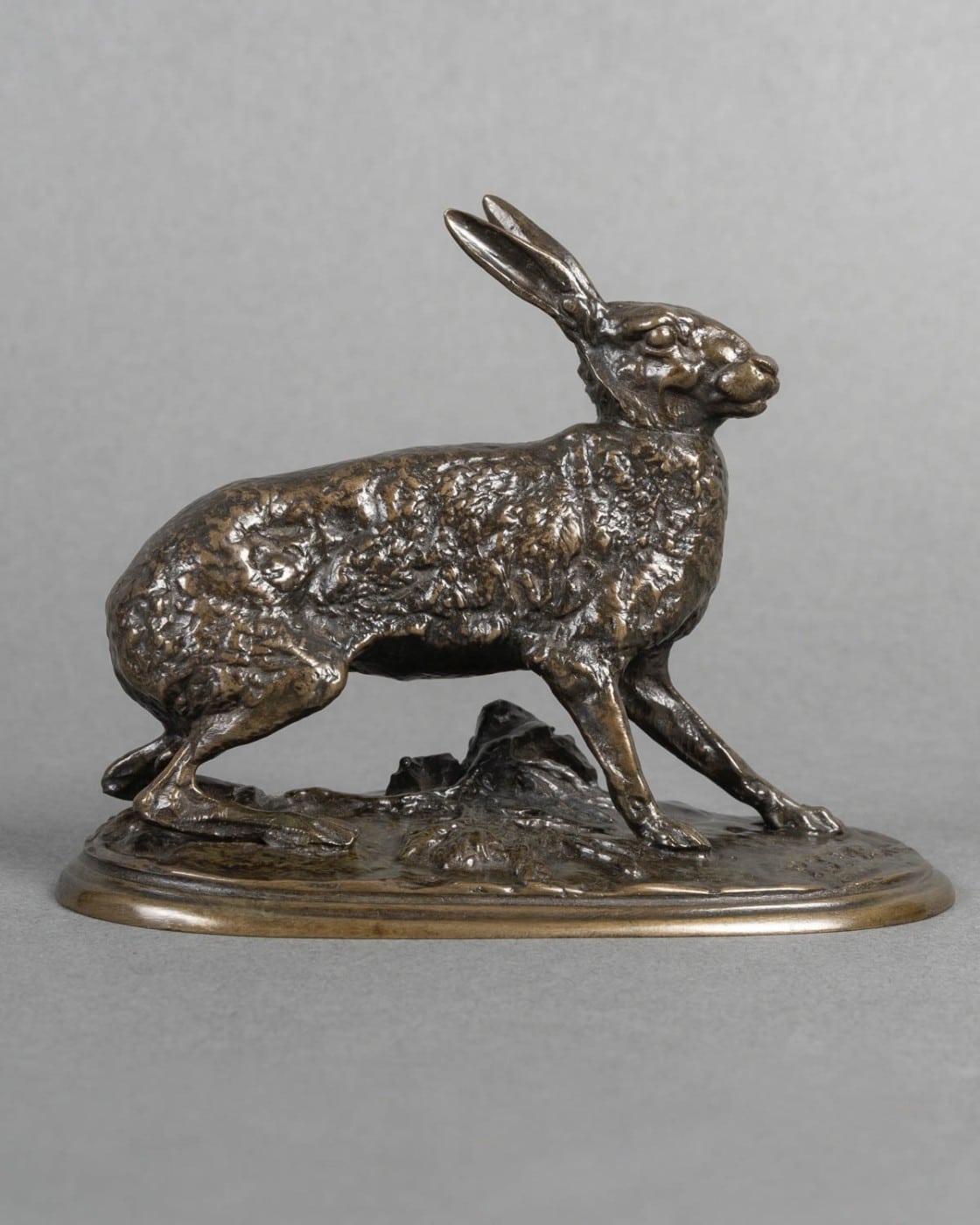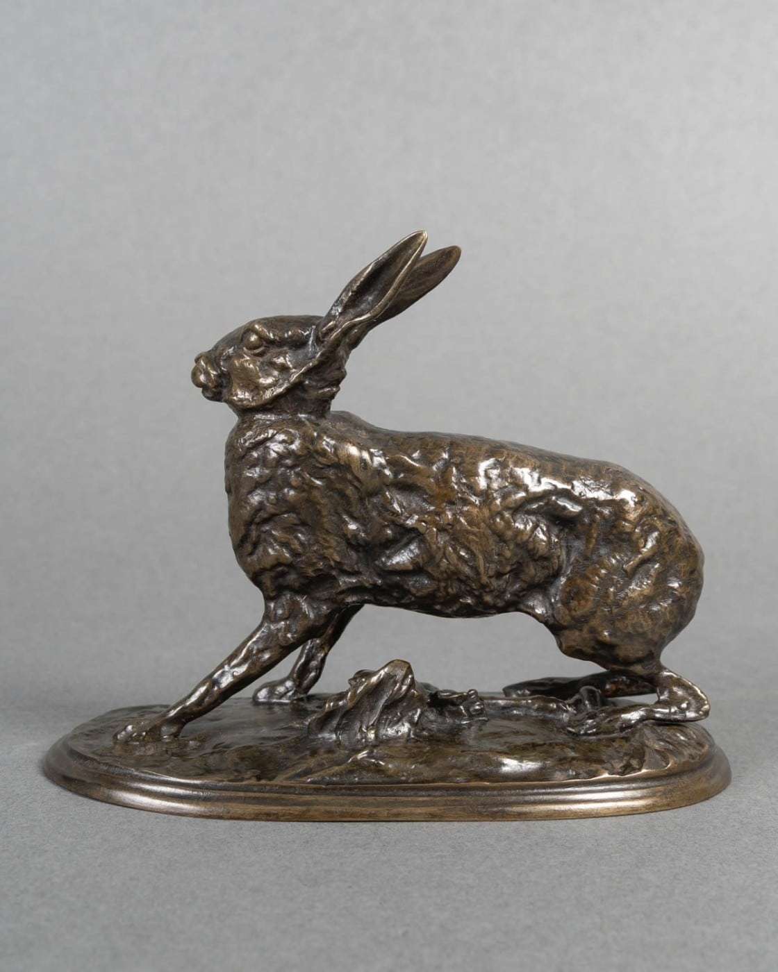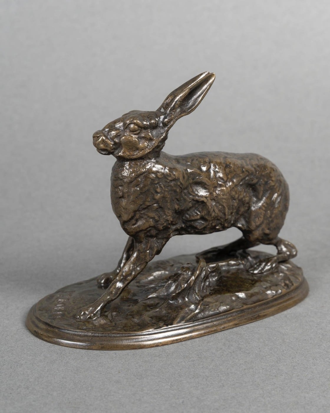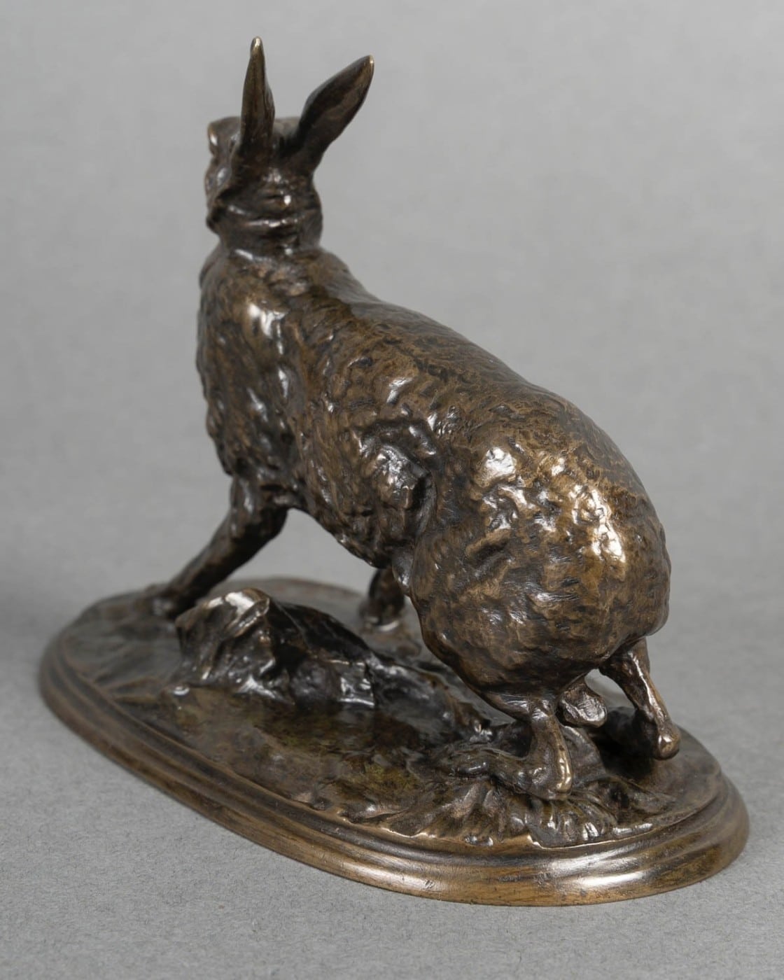 Épreuve en bronze , à patine brune , figurant un lièvre au repos , présenté en attitude d’observation , par le sculpture Pierre – Jules Mêne (1810-1879) .