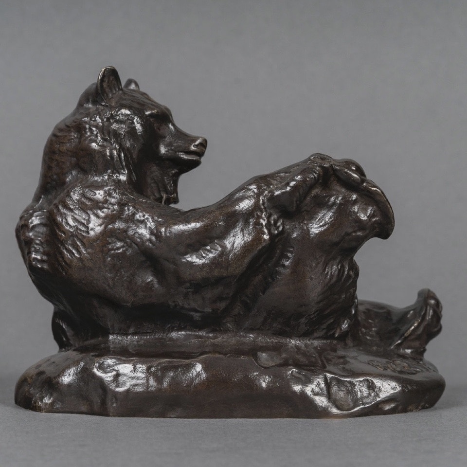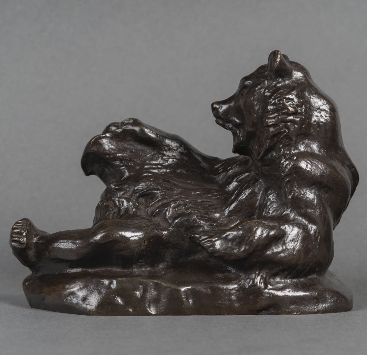 A bronze sculpture with a brown patina, depicting « The Reclining Bear » , an emblematic work , by the sculptor Antoine-Louis Barye .