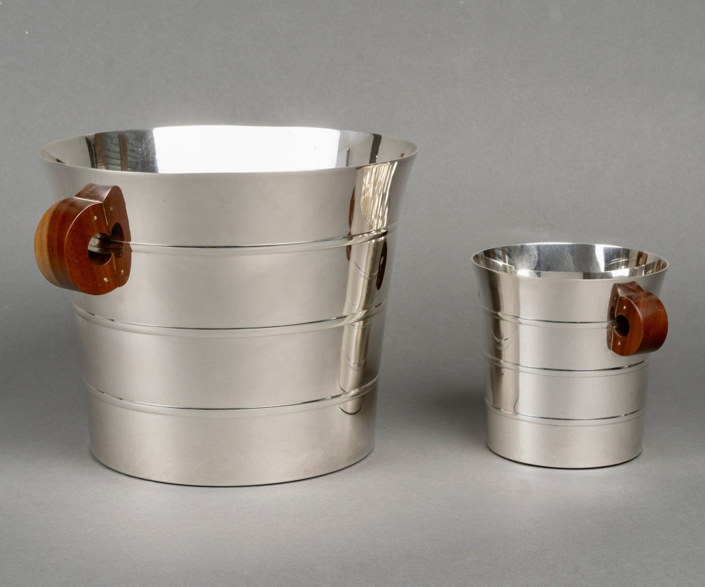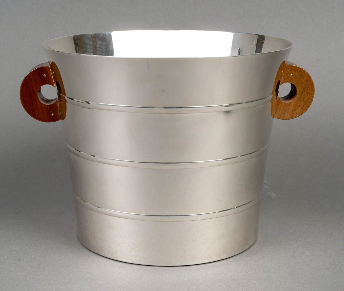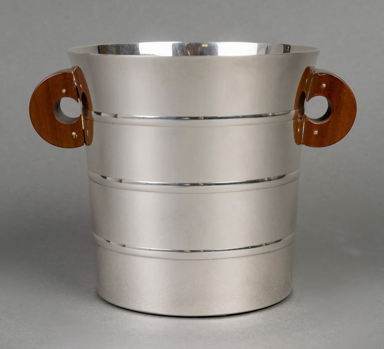 Seau à Champagne et à Glaçons « Epsilon » en argent massif et prises en noyer de Puiforcat d’après un modèle Jean E. Puiforcat créé en 1936.