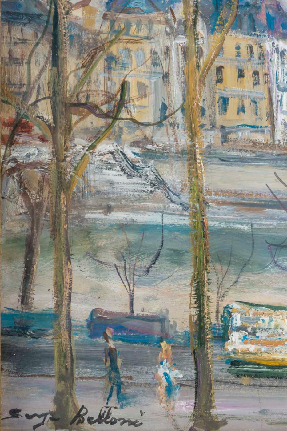 Ce beau tableau nous transporte à Paris, avec cette superbe vue des Quais de paris, de l’Île Saint-Louis et des Bouquinistes. Belloni affectionnait passer l’automne et le début de l’hiver à Paris, où les arbres dénudés révélaient l’architecture et l’âme authentique de la ville. Et le reste de l’année à Venise pour y capturer cette lumière si particulière.