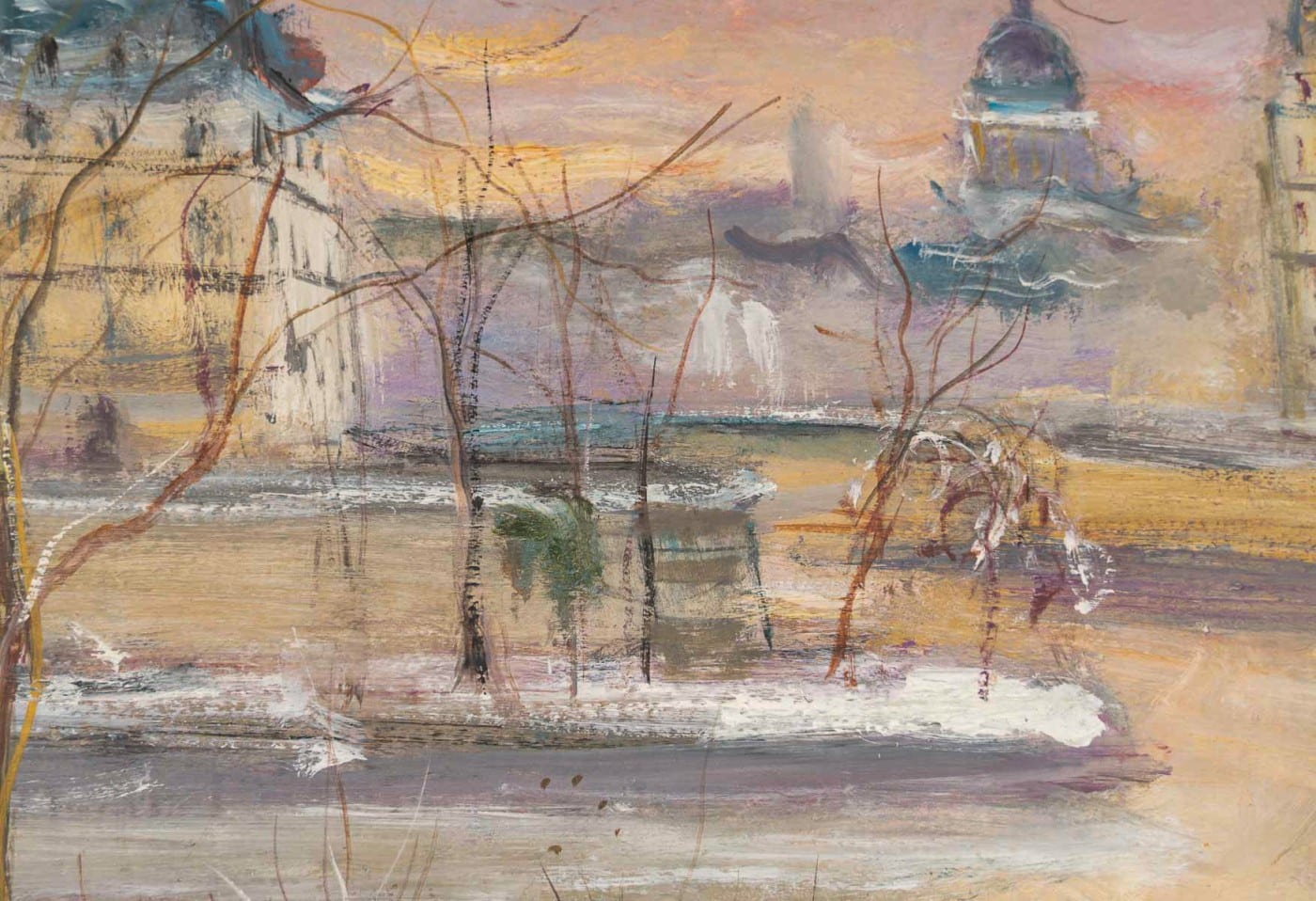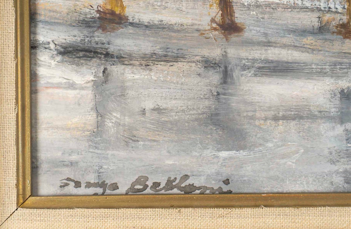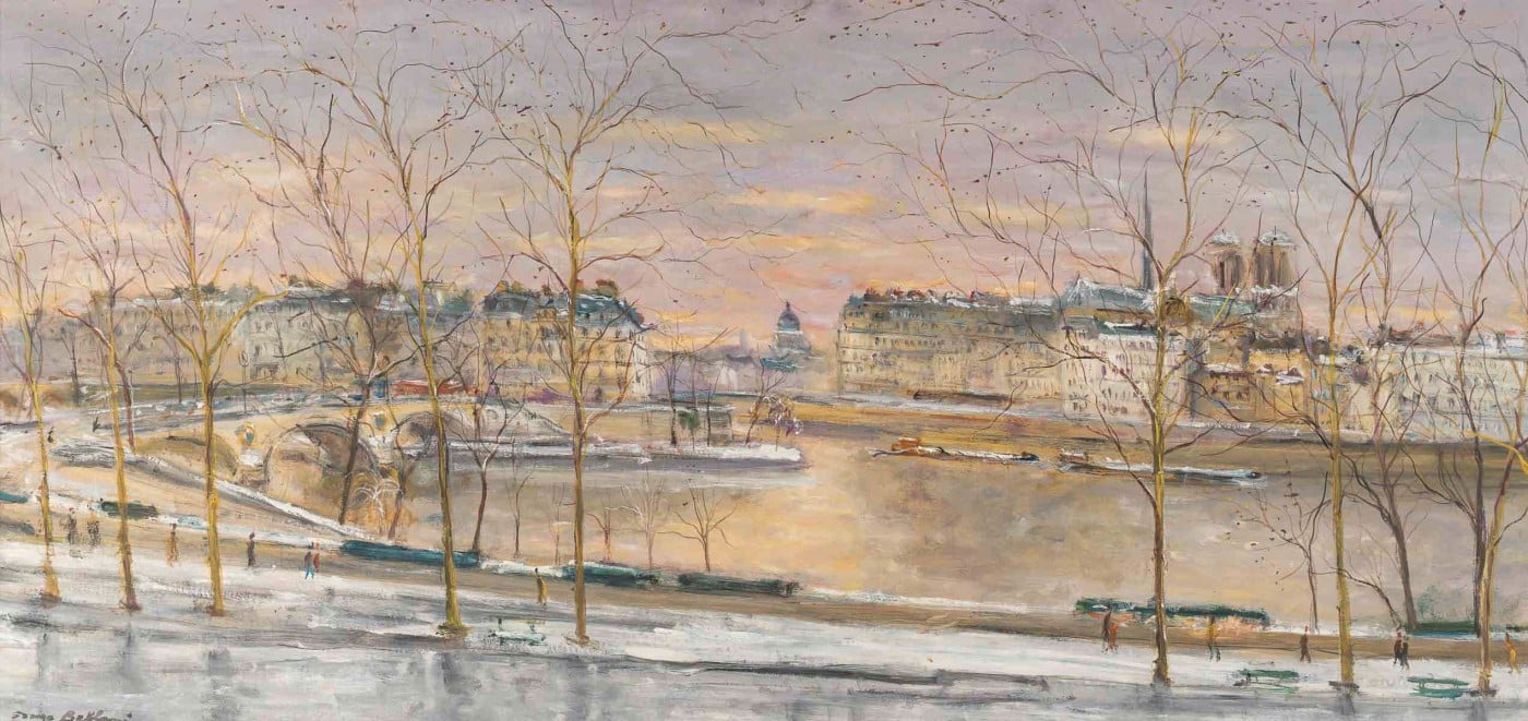 This magnificent painting transports us to Paris, with its beautiful panoramic view of the Louis Philippe Bridge, the Quays of the Seine with its bookshops, and Notre-Dame. Belloni loved spending autumn and early winter in Paris, where the bare trees revealed the architecture and authentic soul of the city. He spent the rest of the year in Venice, capturing its unique light.