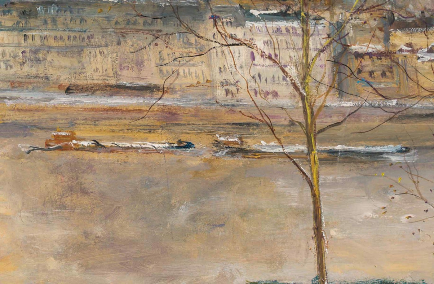 Ce magnifique tableau, nous transporte à Paris, avec cette belle vue panoramique qui embrasse le Pont Louis Philippe, les Quais de Seine avec ses bouquiniste, l’Ile Saint-Louis et Notre-Dame. Belloni affectionnait passer l’automne et le début de l’hiver à Paris, où les arbres dénudés révélaient l’architecture et l’âme authentique de la ville. Et le reste de l’année à Venise pour y capturer cette lumière si particulière.