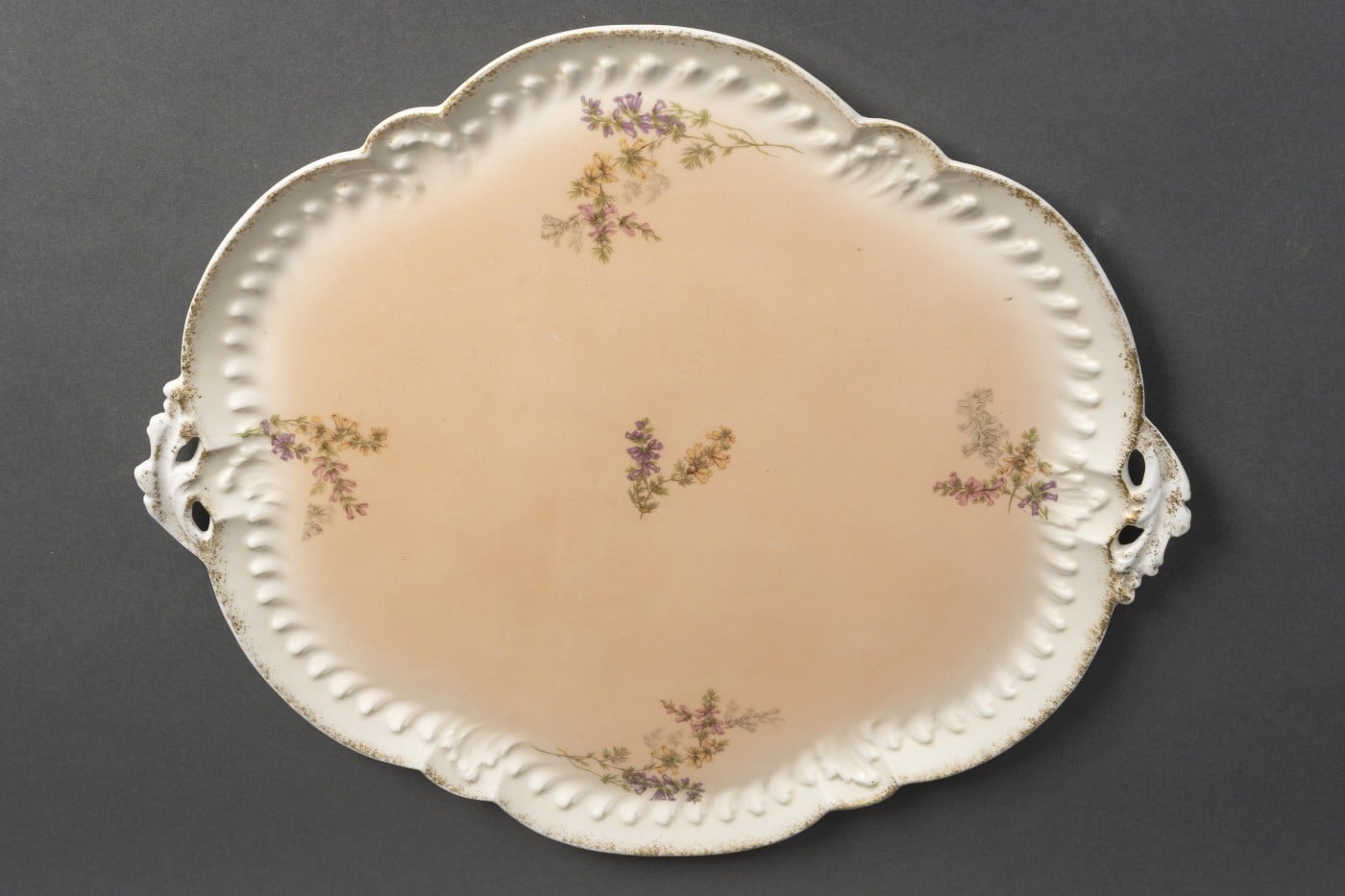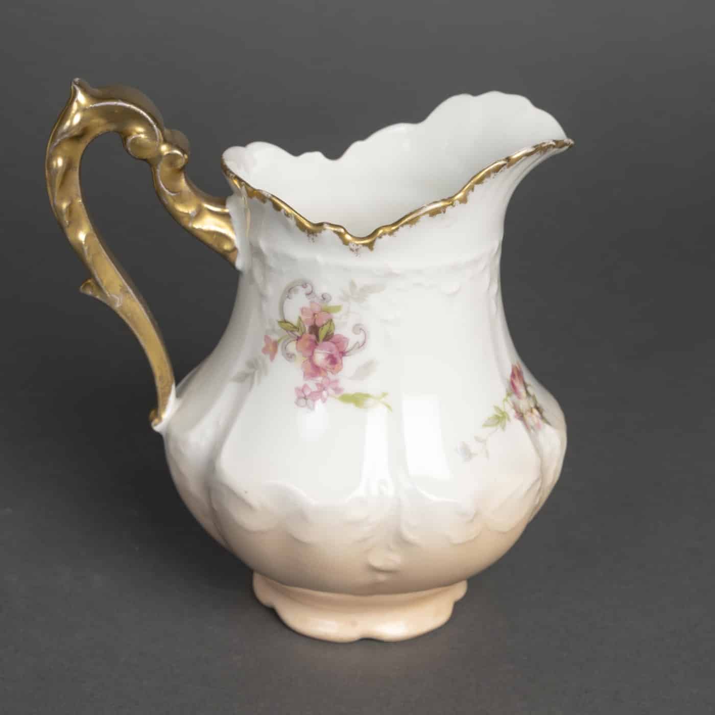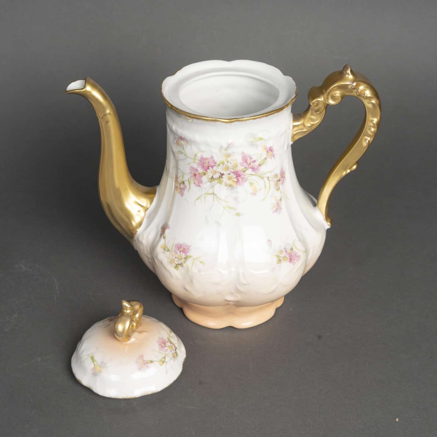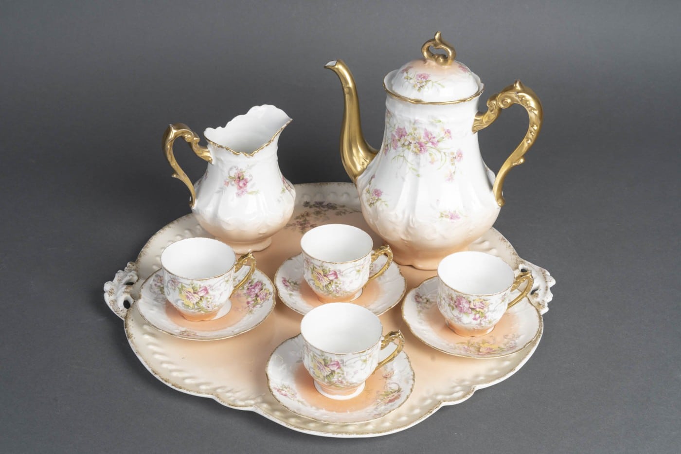Les formes chantournées, les anses dorées et le décor pastel témoignent du raffinement caractéristique de la fin du XIXᵉ siècle, dans l’esprit de la Belle Époque et des prémices de l’Art Nouveau. L’ensemble est harmonieusement présenté sur son plateau assorti, soulignant son élégance décorative.