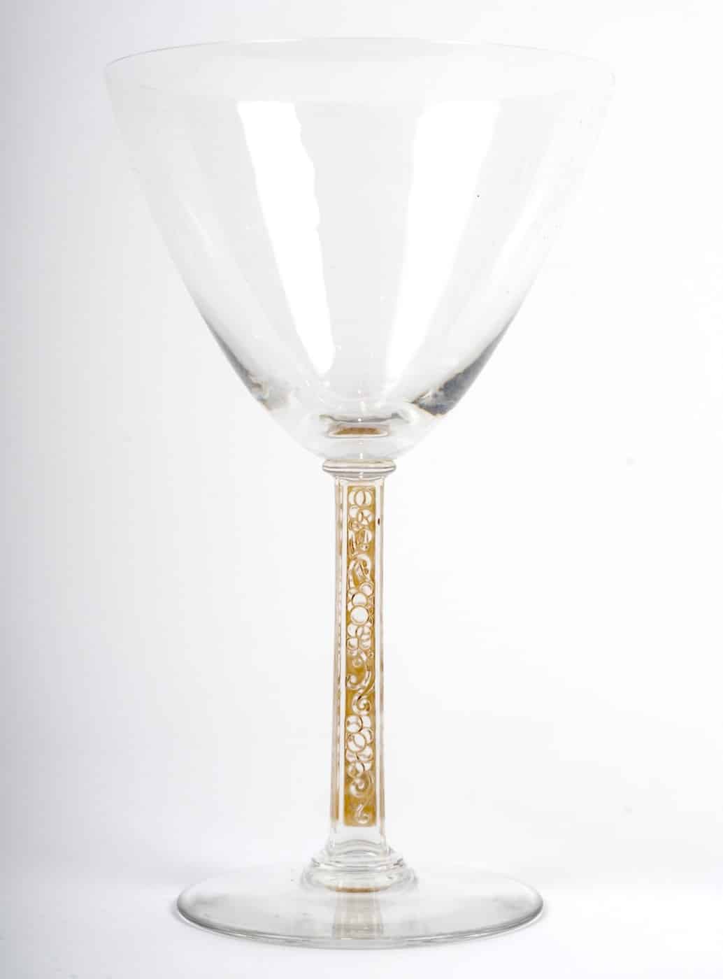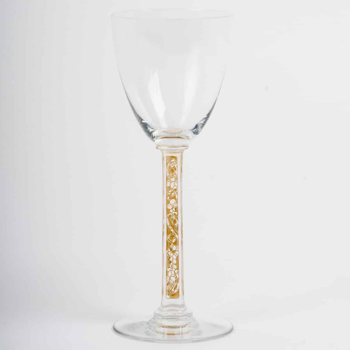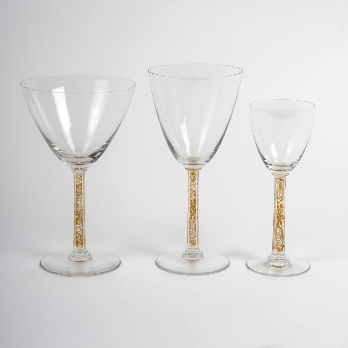 Service de 18 verres « Phalsbourg » en verre blanc patiné sépia de René Lalique créés en 1924.