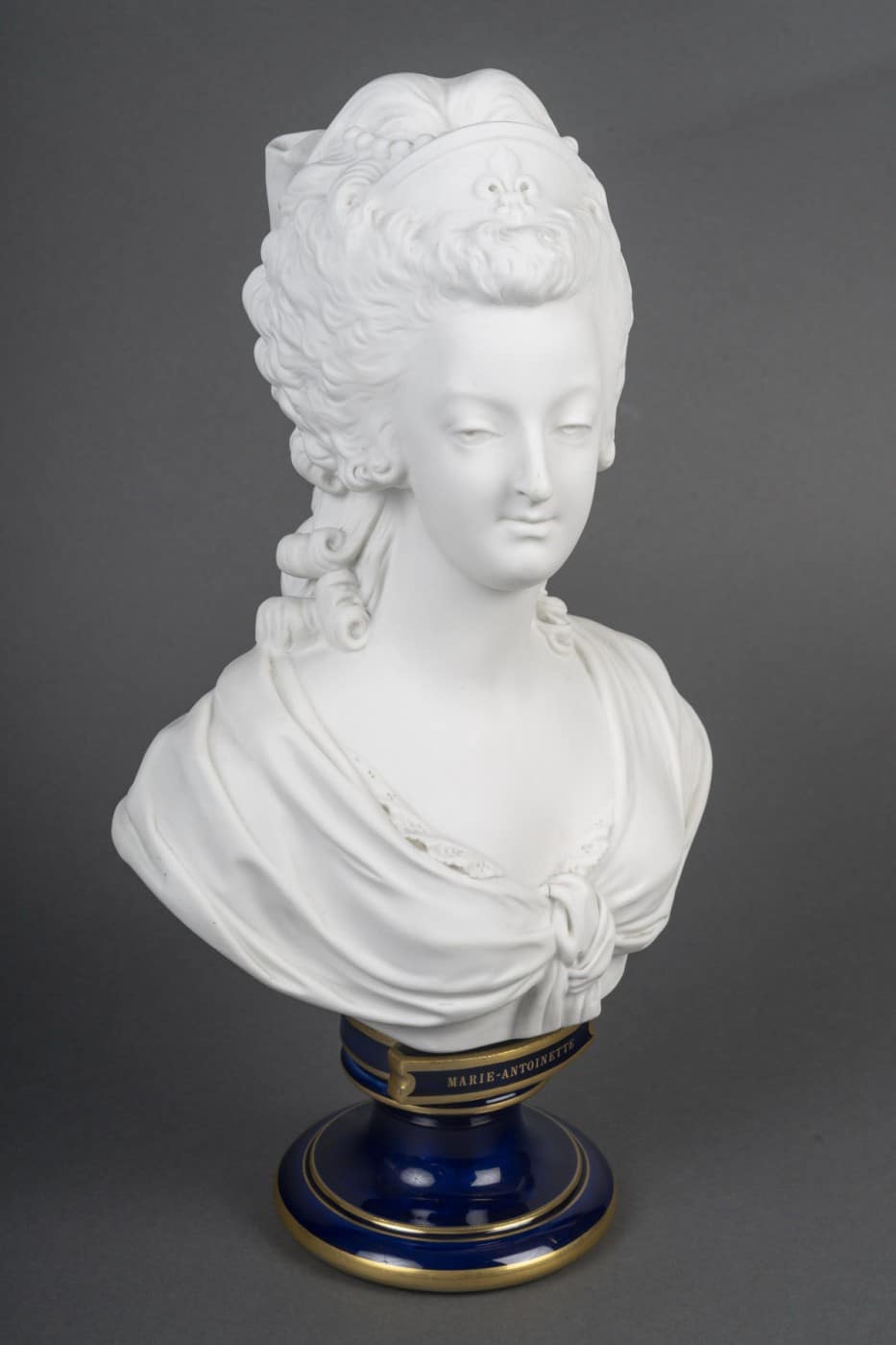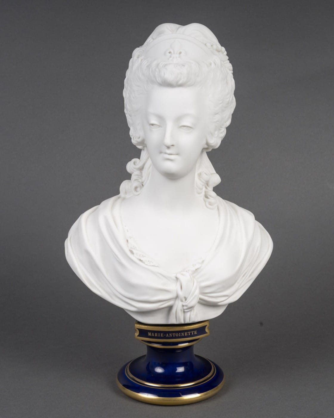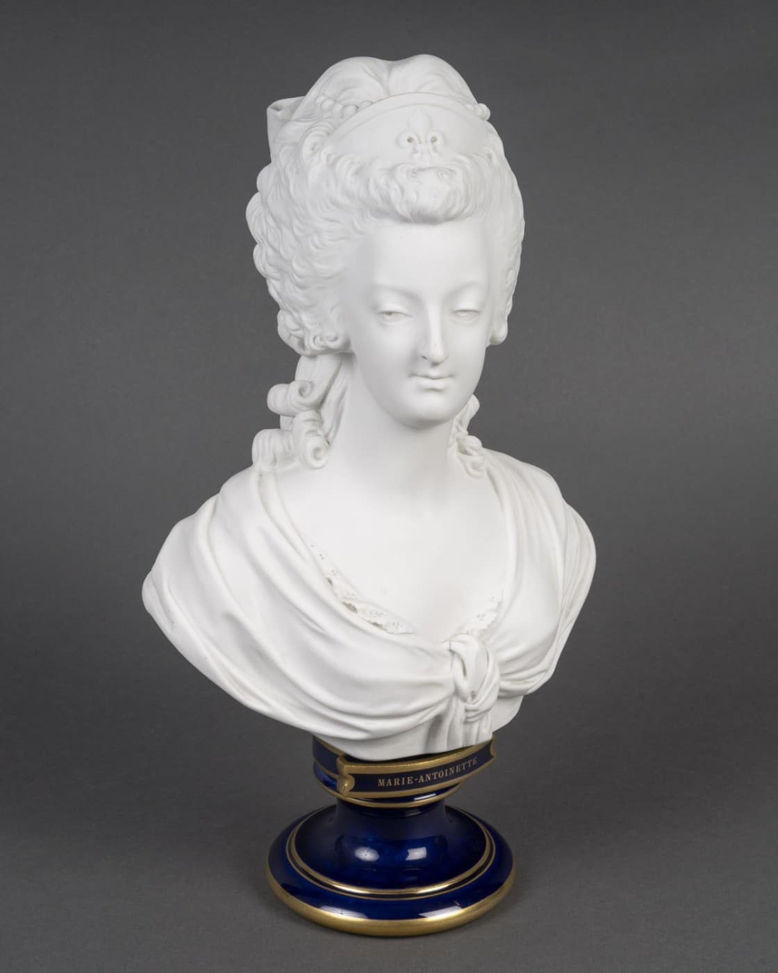 Buste de la reine Marie-Antoinette en biscuit de Sèvres, coiffé d’un diadème figurant une fleur de lys