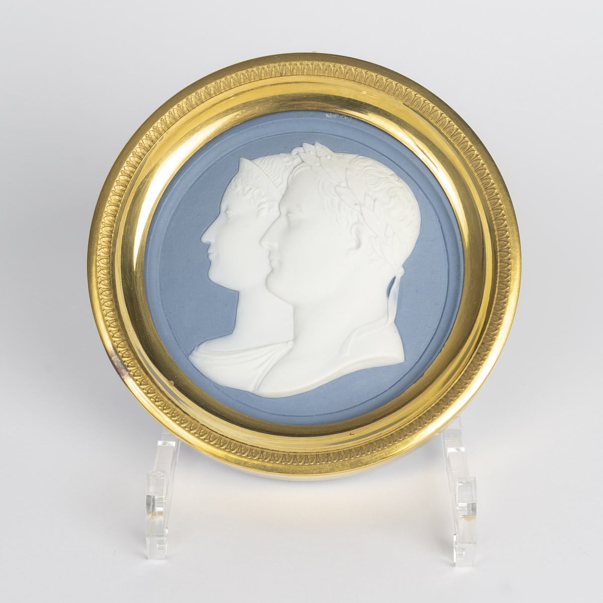 Médaillon en biscuit bleu et blanc figurant les profils de l’empereur Napoléon 1er et de l’impératrice Eugenie.