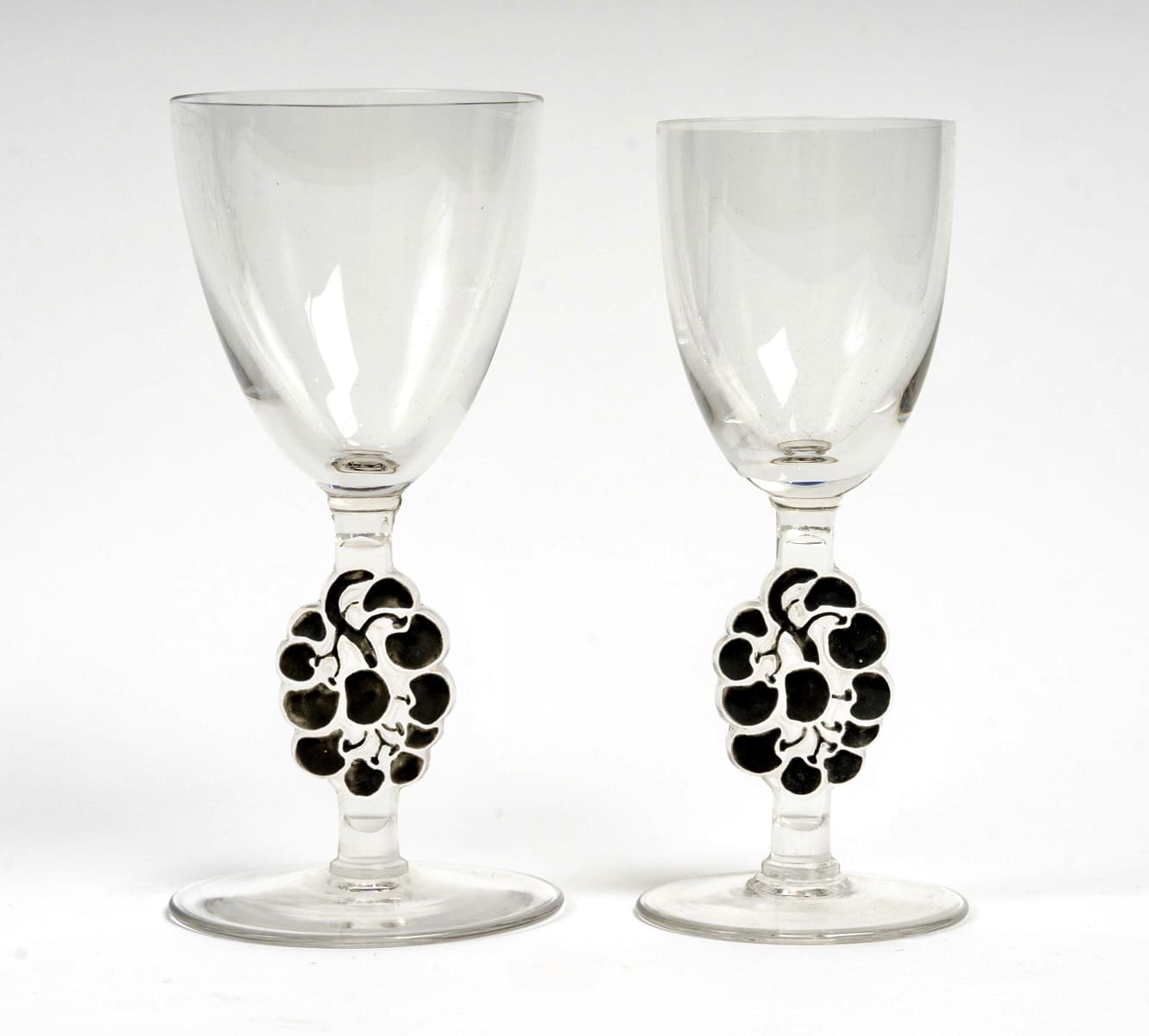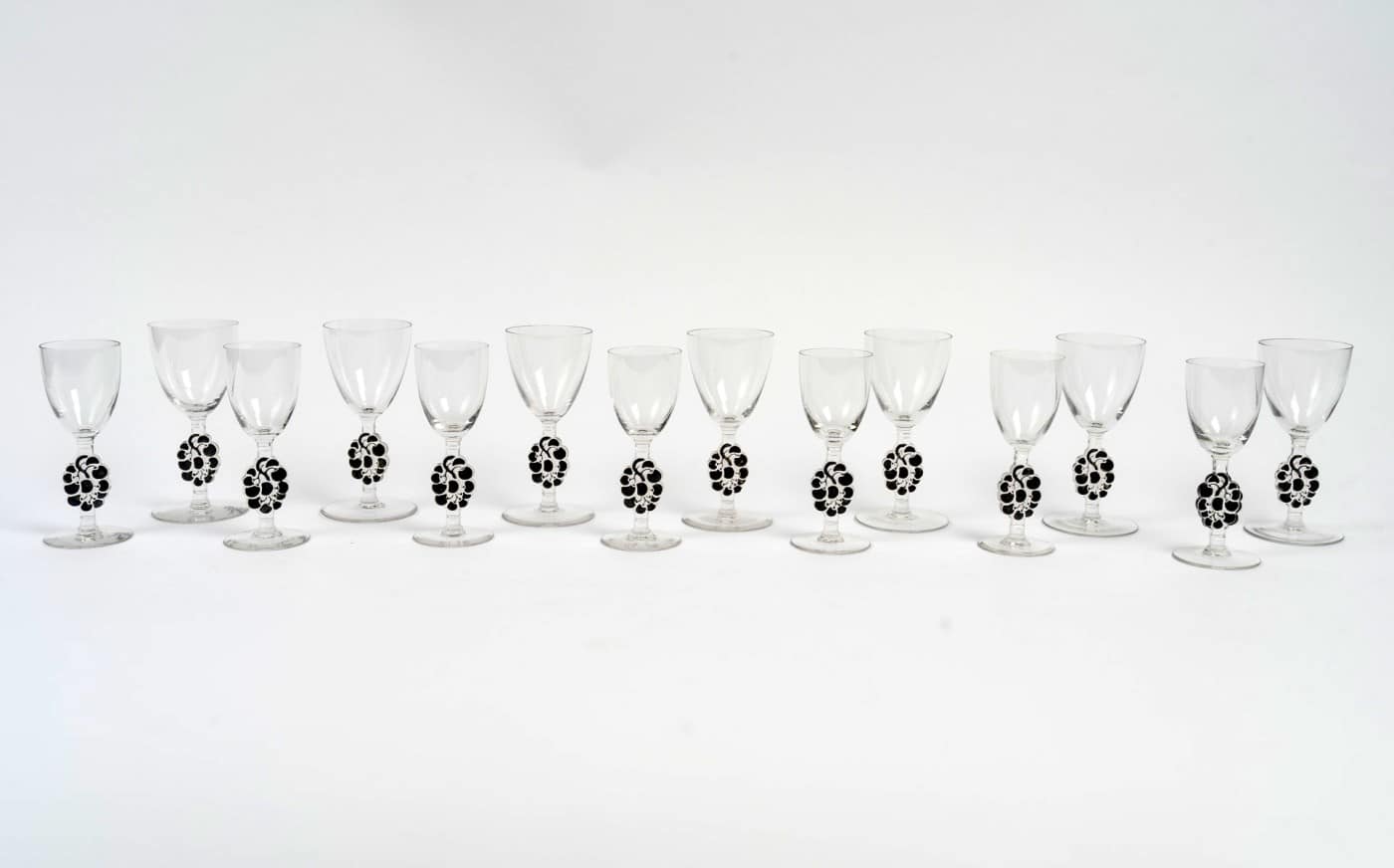 Suite de 14 verres « Thionville » en verre blanc émaillé noir d’origineà chaud de René Lalique créés en 1924.