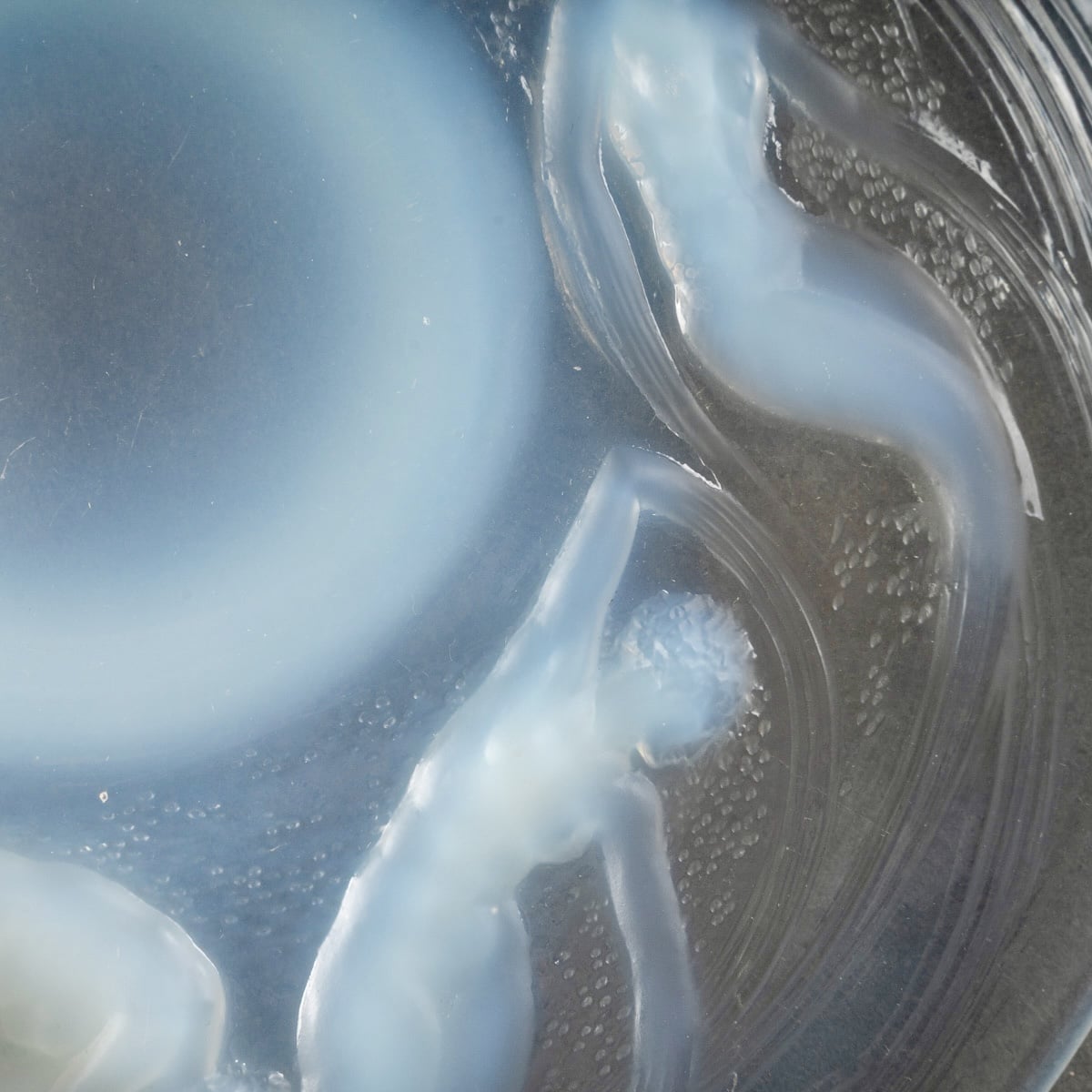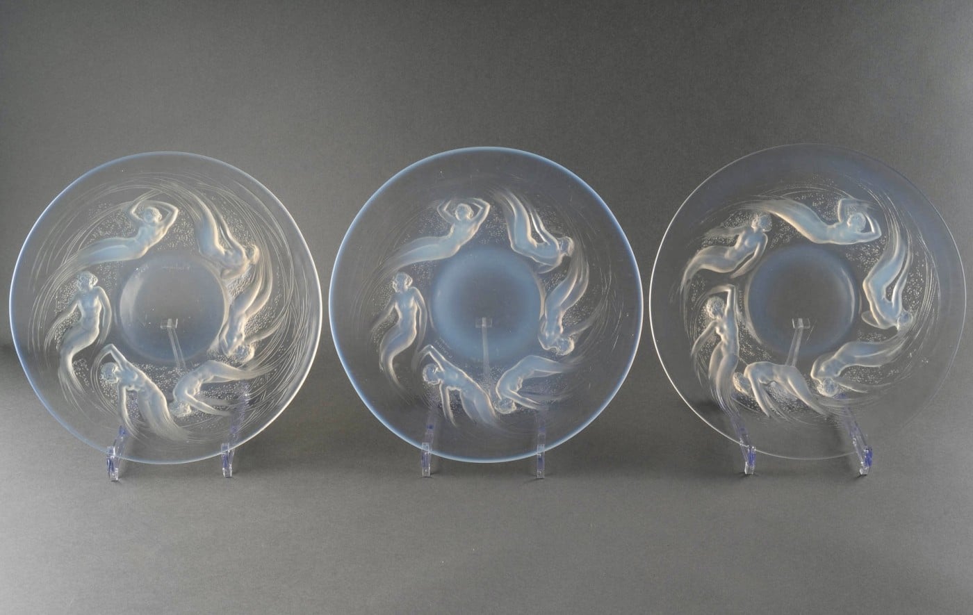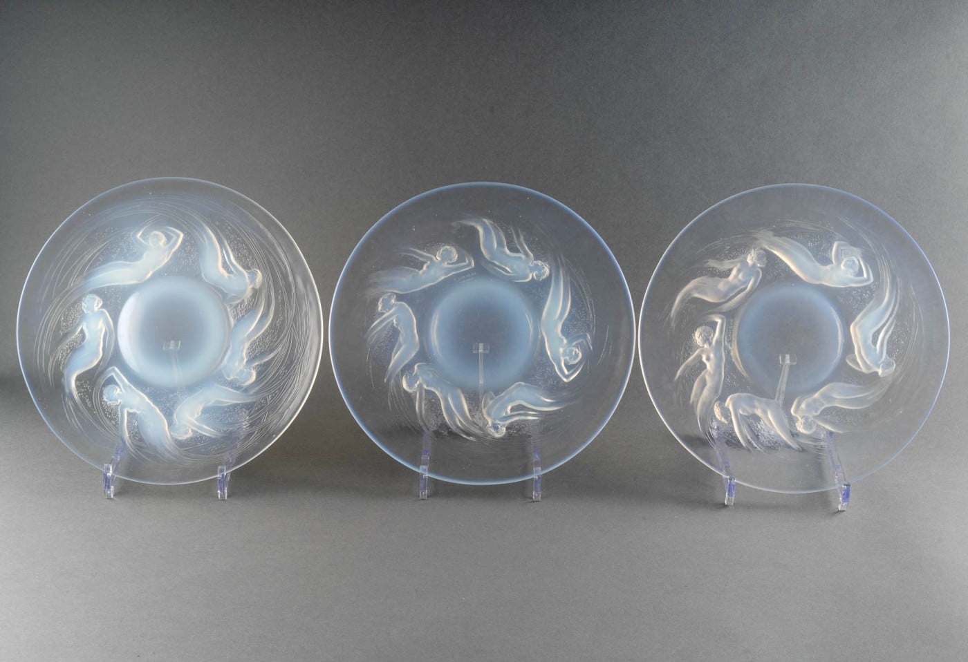 Suite de 6 assiettes « Ondines » en verre opalescent de René Lalique créées en 1921.