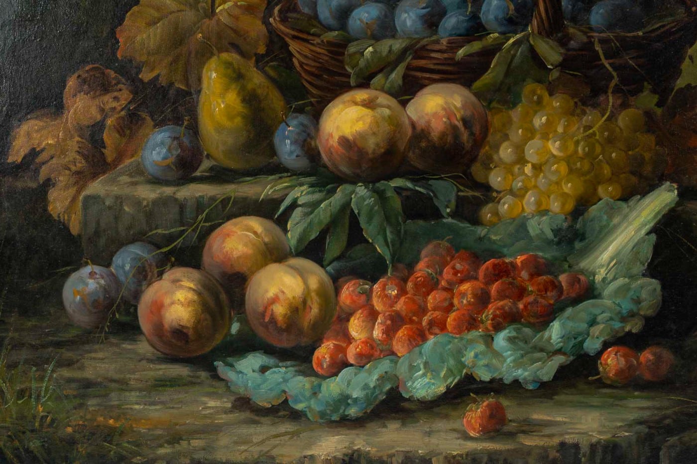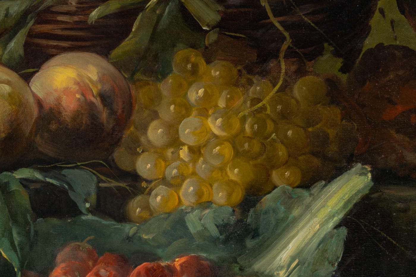 La scène met en valeur une abondante variété de fruits disposés de manière harmonieuse. On y distingue un panier en osier rempli de prunes bleutées, des pêches et des poires, une grappe de raisin blanc, des feuilles de vigne et quelques feuilles sèches, qui apportent une dimension naturelle et saisonnière à l’ensembles. Des fraises éparpillées sur une feuille de chou, renforçant l’impression de fraîcheur et de générosité. Une poire et une pêche posées à l’avant-plan, ainsi que quelques fruits tombés au premier plan, créant un effet de profondeur et de réalisme.