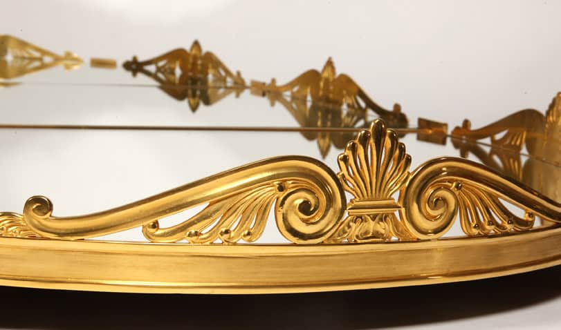 Surtout de table en bronze doré ,en 4 parties, deux rectangulaires et deux demies lunes , à fond de miroirs sur plateau en bois, monté sur dix pieds pattes griffées, décor d’arabesques et de palmettes . Travail français du début du XIXè siècle.