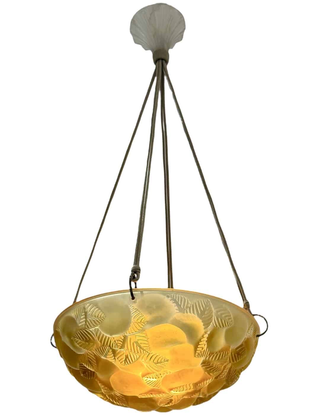 Suspension Plafonnier Lustre « Lausanne » en verre jaune ambré créée par René Lalique en 1929.