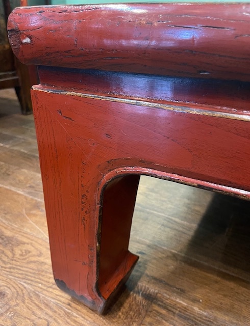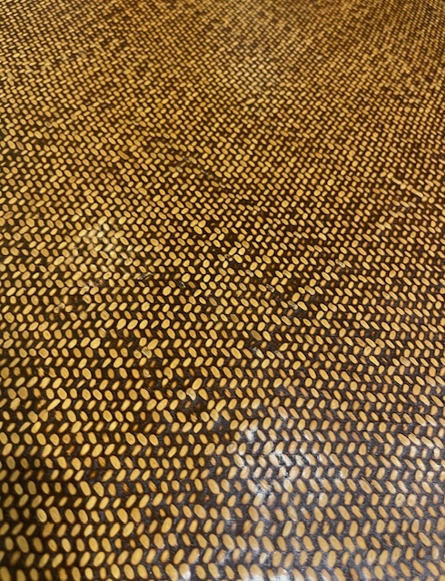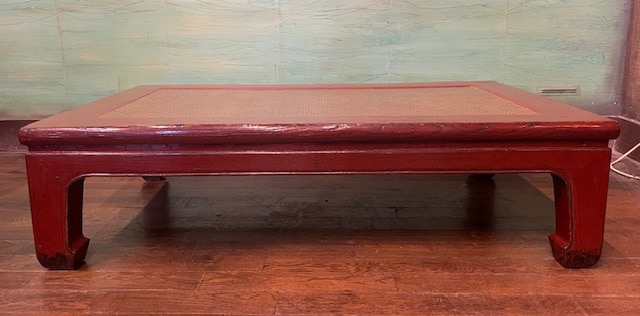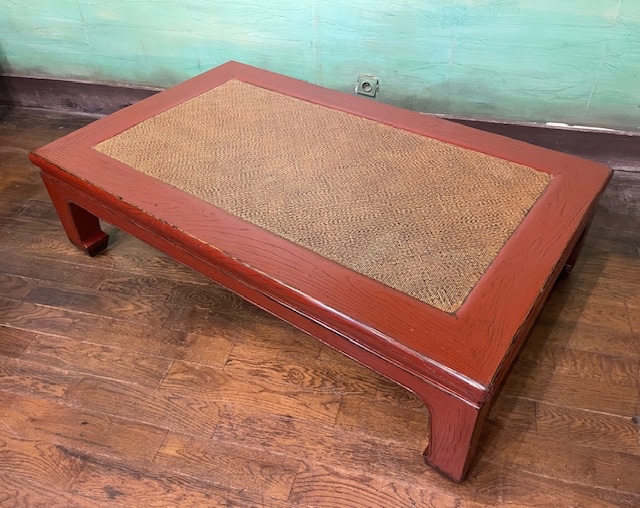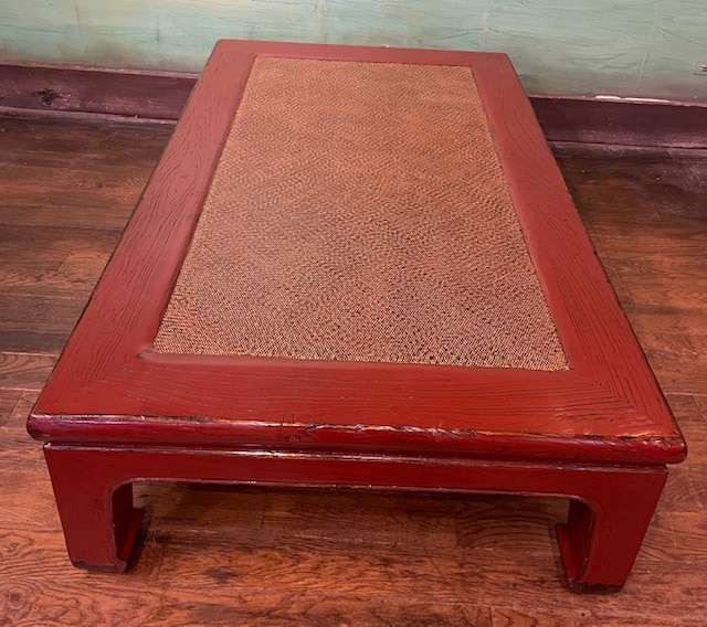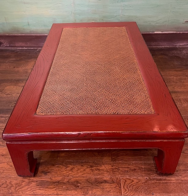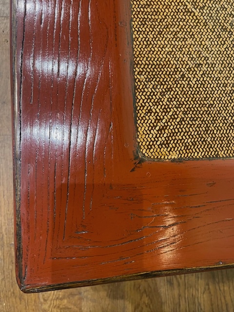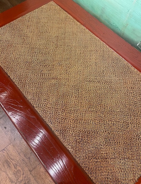 Piètement et encadrement plateau orme laqué rouge sombre/intérieur plateau paille de riz tressée.