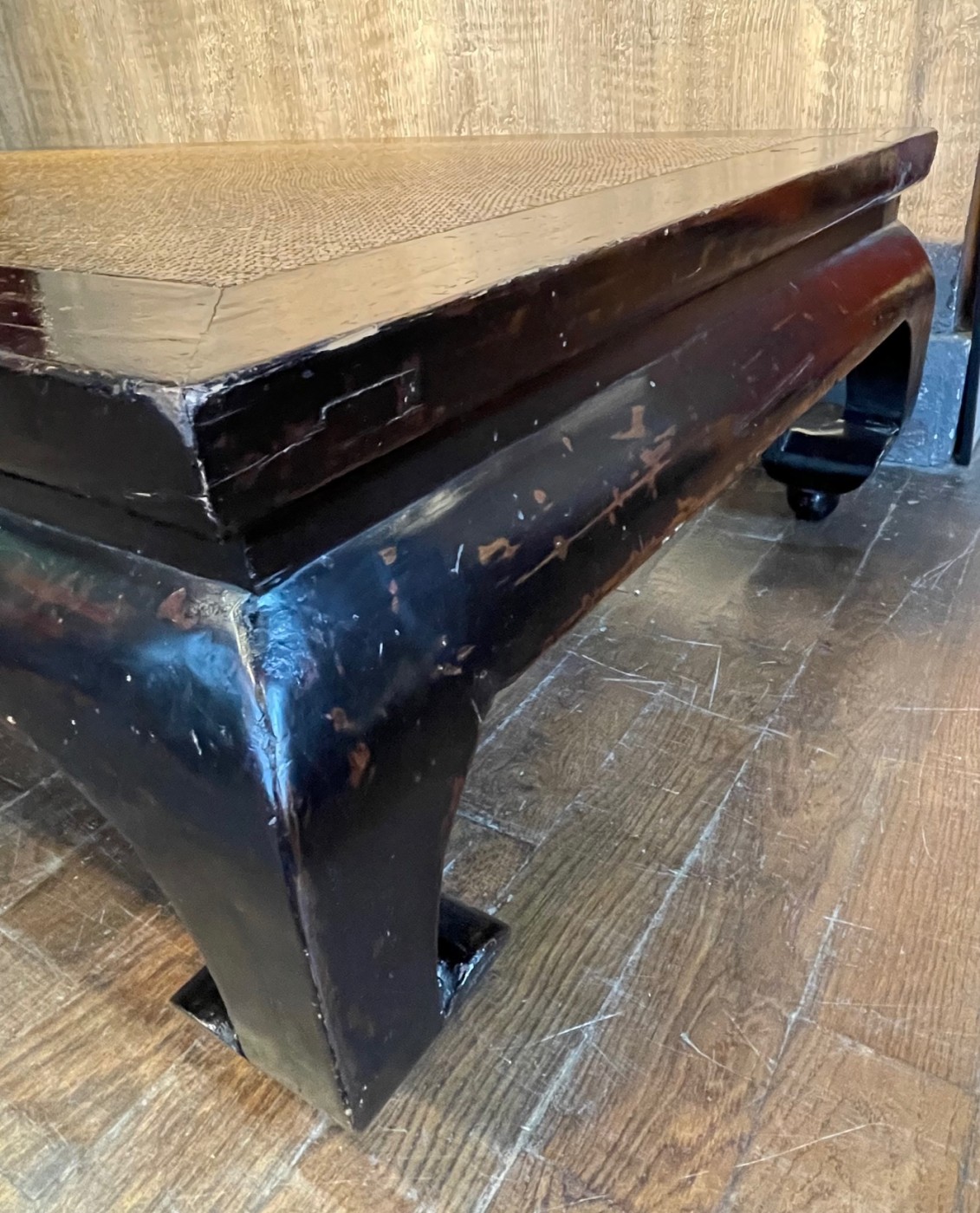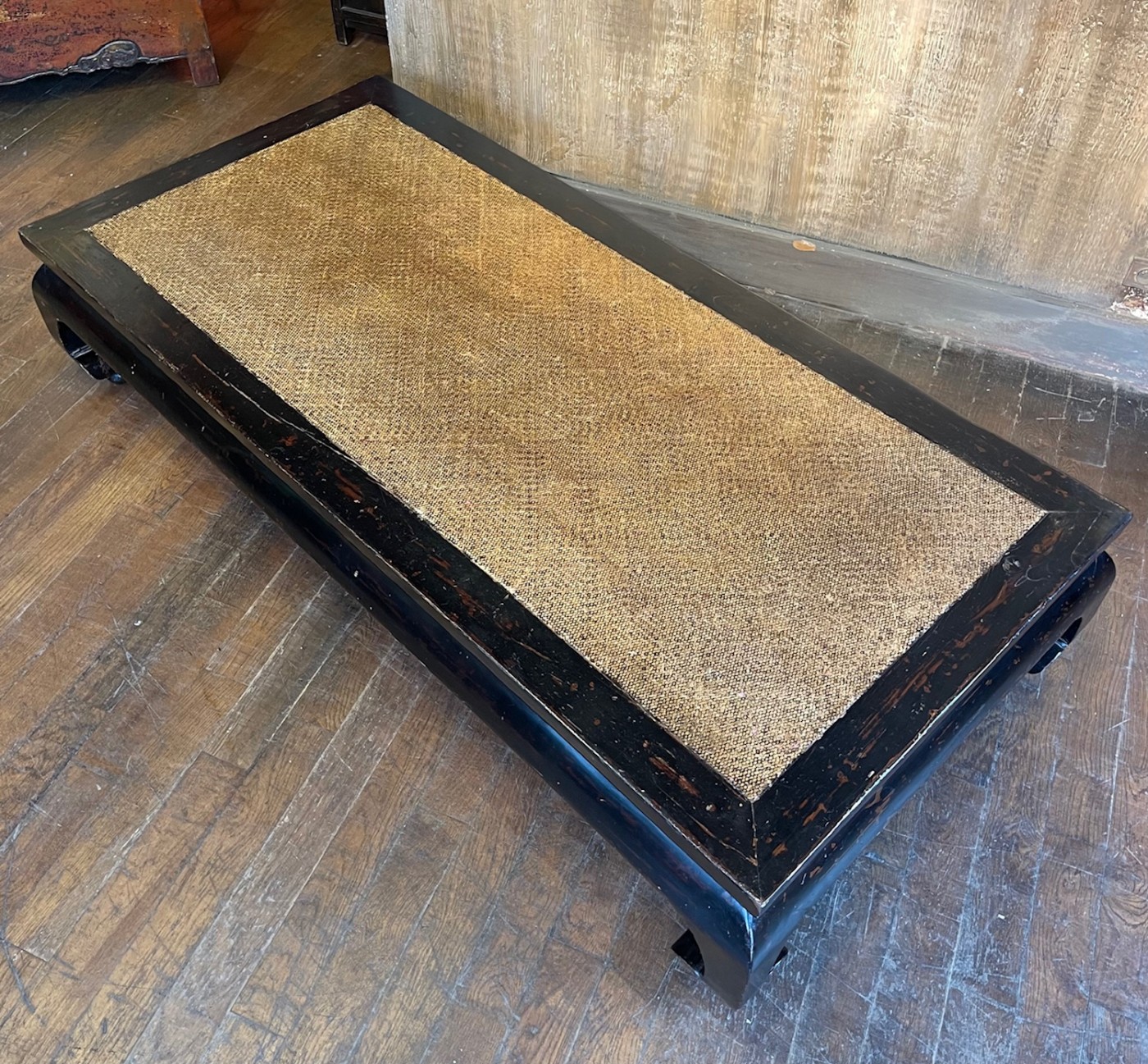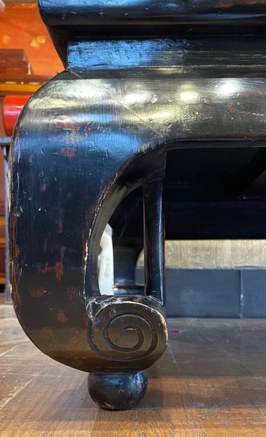 Structure en bois massif finition laqué noire, piètement sculpté en volutes dans la tradition du mobilier chinois classique. Plateau encadré avec centre en natte végétale tressée. Patine naturelle avec traces d’usage discrètes.