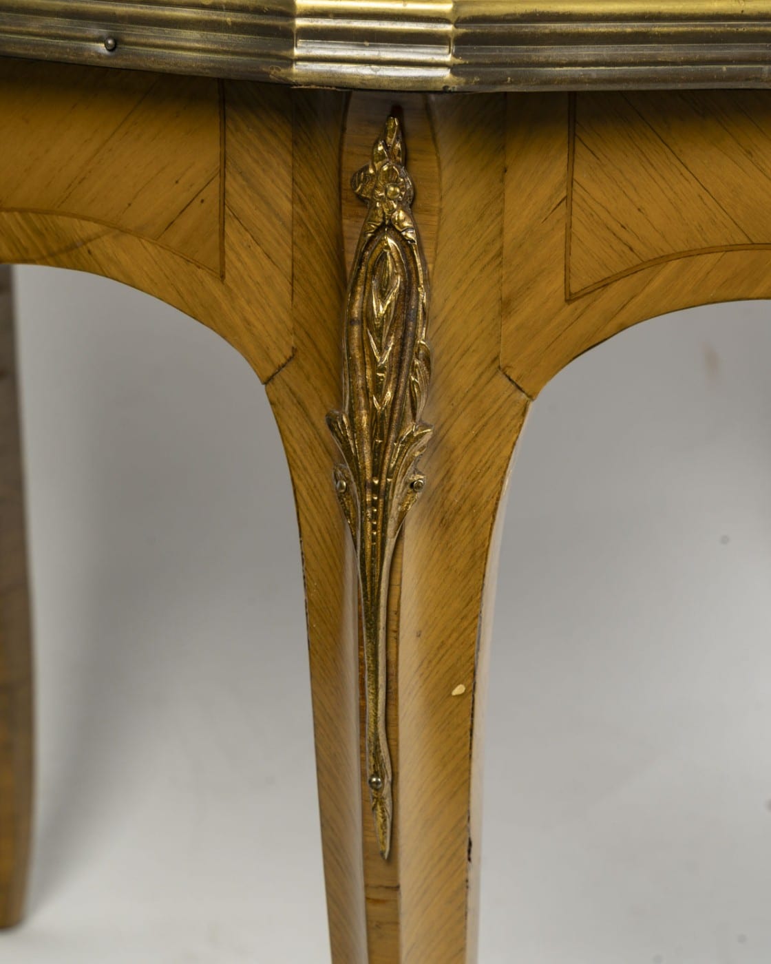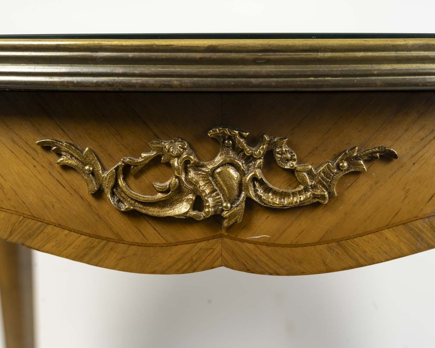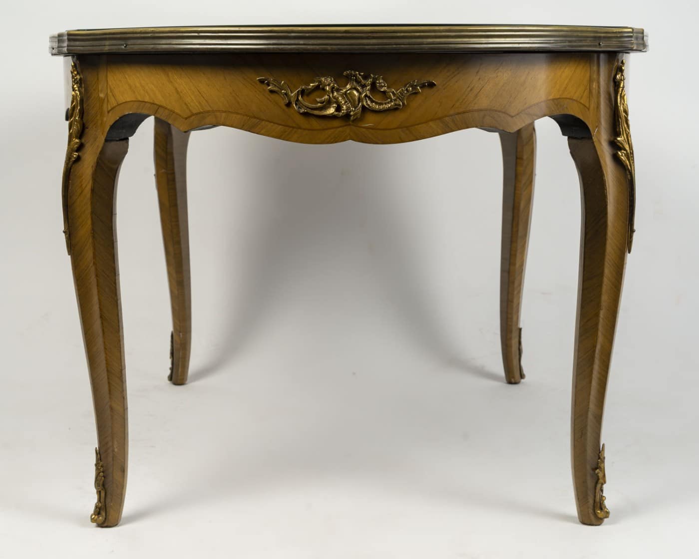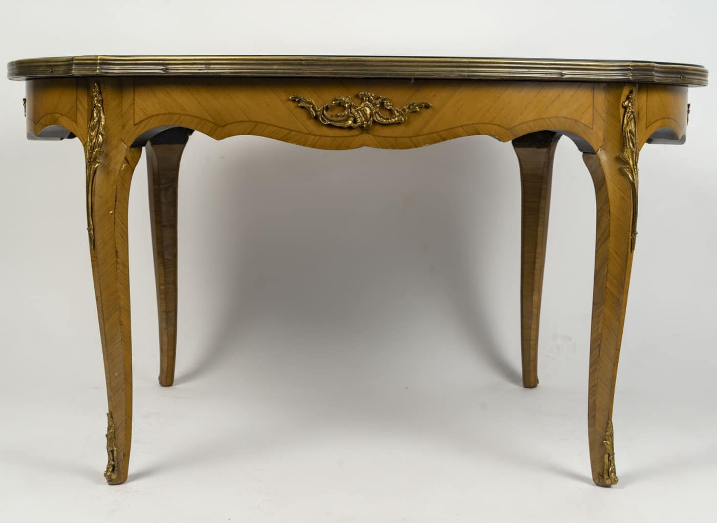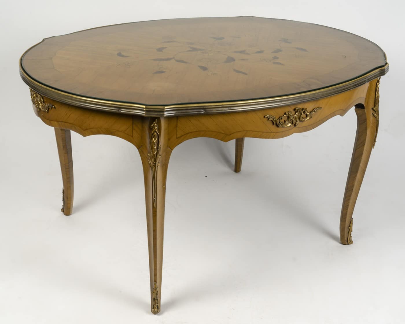 Élégante table basse de style Louis XV ou Louis XVI revisité, reconnaissable à ses pieds galbés, ses ornements en bronze doré et son plateau en marqueterie florale finement travaillée, protégée par un plateau de verre. Le dessin du bois en chevrons et les incrustations florales témoignent d’un travail d’ébénisterie raffiné.