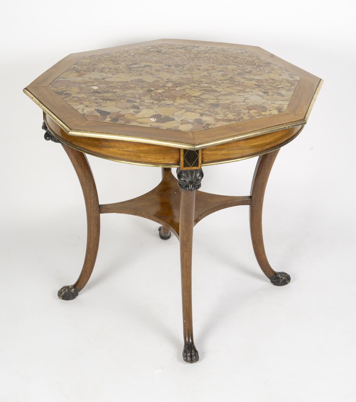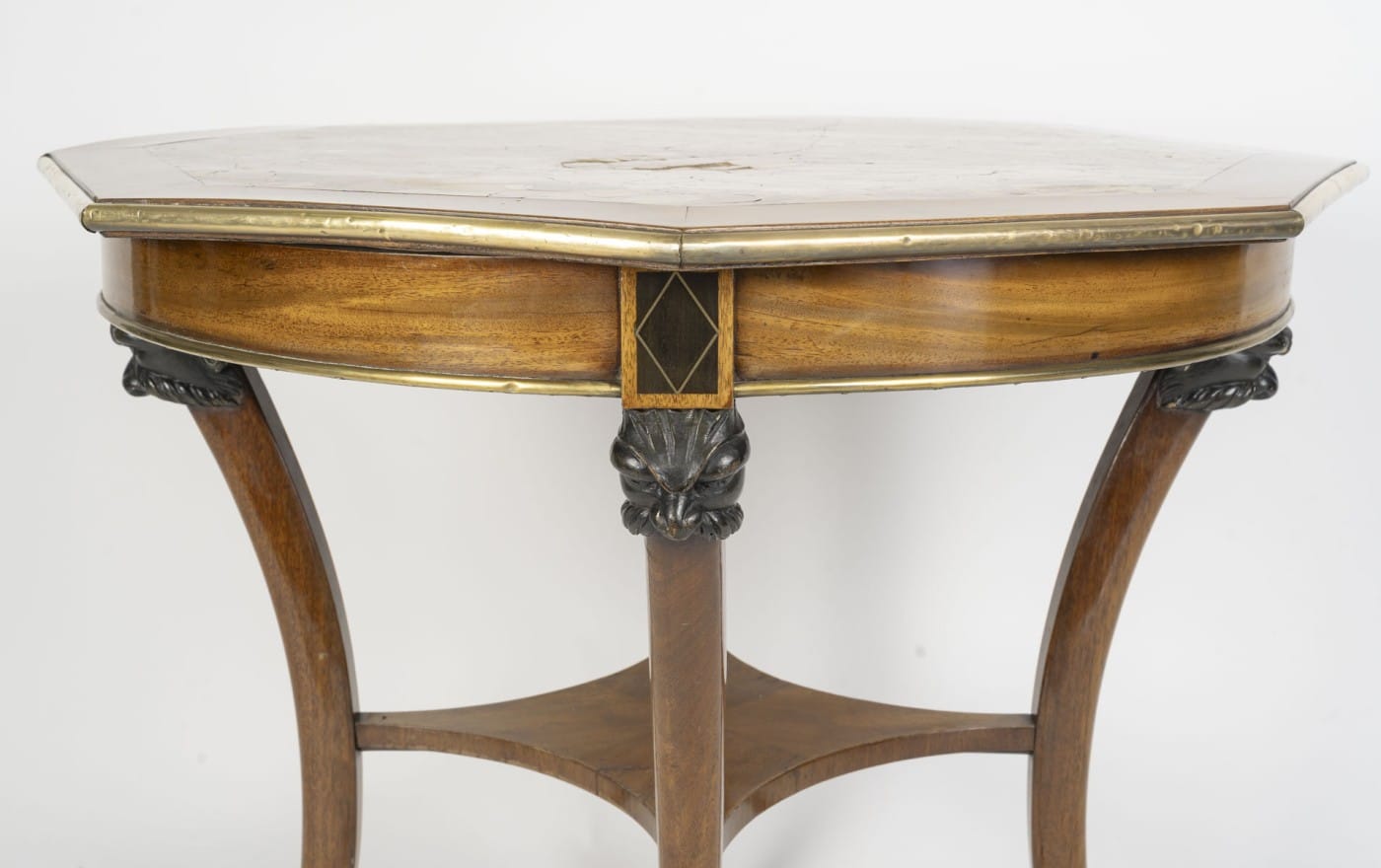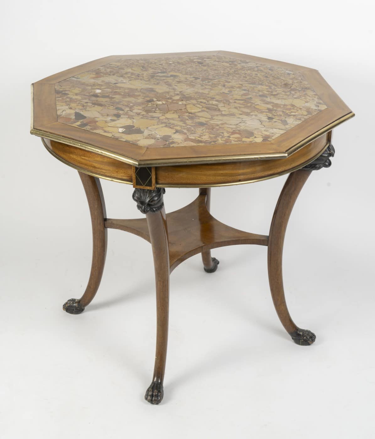Elégant guéridon de style Directoire de forme hexagonale en acajou blond à quatre pieds reliés par une entretoise. Circa 1820