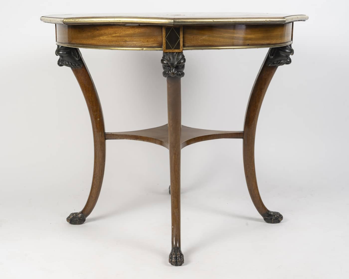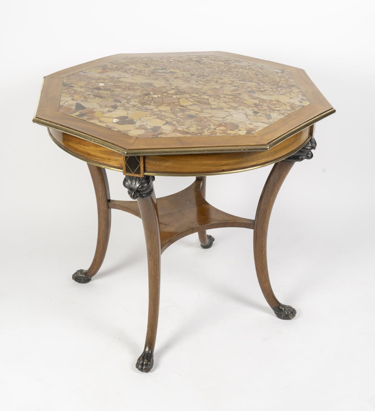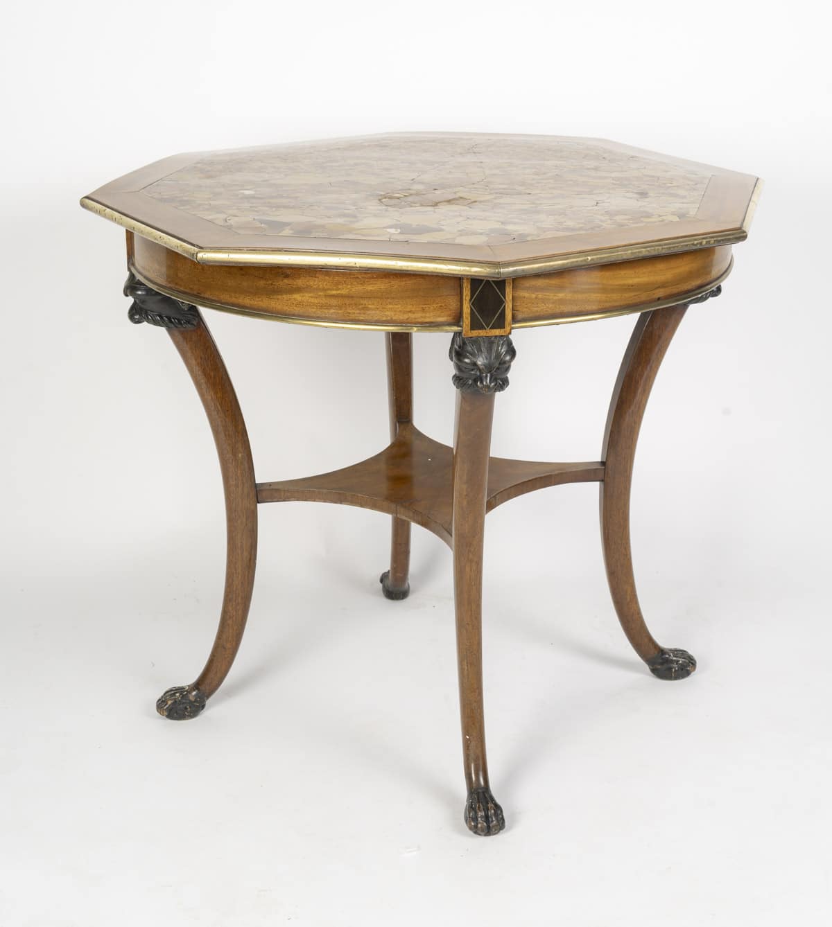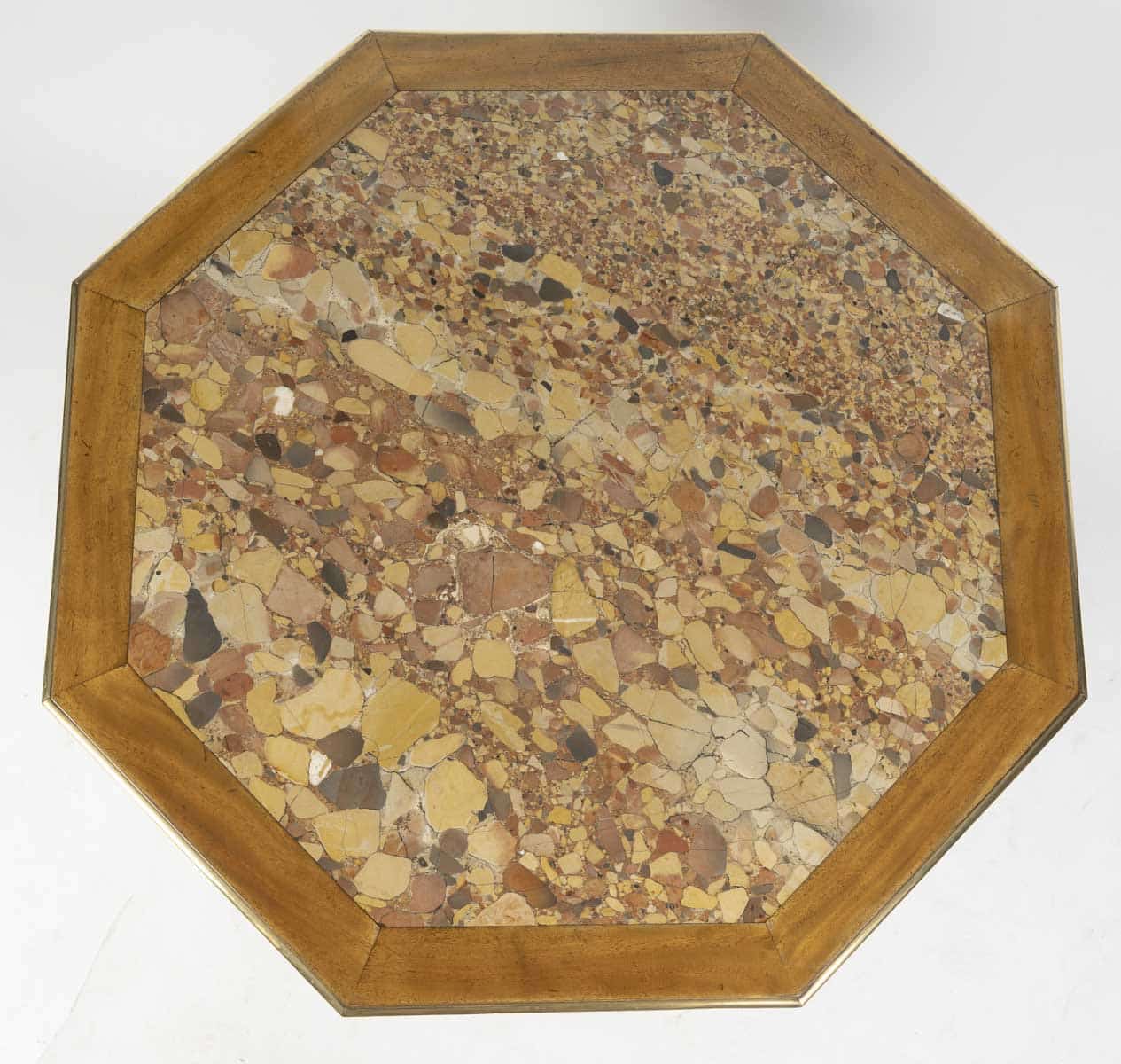 Elégant guéridon de style Directoire de forme hexagonale en acajou blond à quatre pieds reliés par une entretoise. Circa 1820