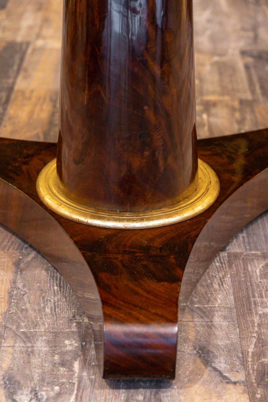 Rare et élégant guéridon circulaire, ce meuble d’exception se distingue par son plateau en marbre blanc de Carrare, en cuvette, orné de onze scènes de ruines antiques en marqueterie de pierres dures et de marbres. Ces motifs, d’une finesse remarquable, sont soulignés par un filet de marbre noir sur fond de paesine, témoignant du savoir-faire florentin en matière de marqueterie. Le pied cylindrique, en acajou ronceux, acajou teinté noir et acajou doré, s’appuie sur une base à trois pieds, alliant robustesse et élégance.