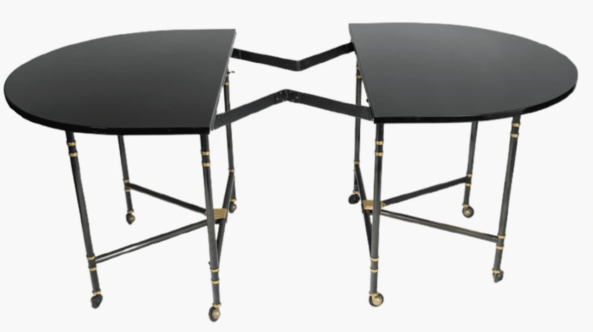 Conçue et fabriquée pour l’actrice française Jacqueline Delubac (1907-1997), qui n’aimait pas les tables à manger. La particularité de cette table est qu’elle est pliable et dispose d’une rallonge qui peut être insérée au centre pour l’agrandir. Une centaine d’exemplaires ont été fabriqués avec plusieurs plateaux différents.