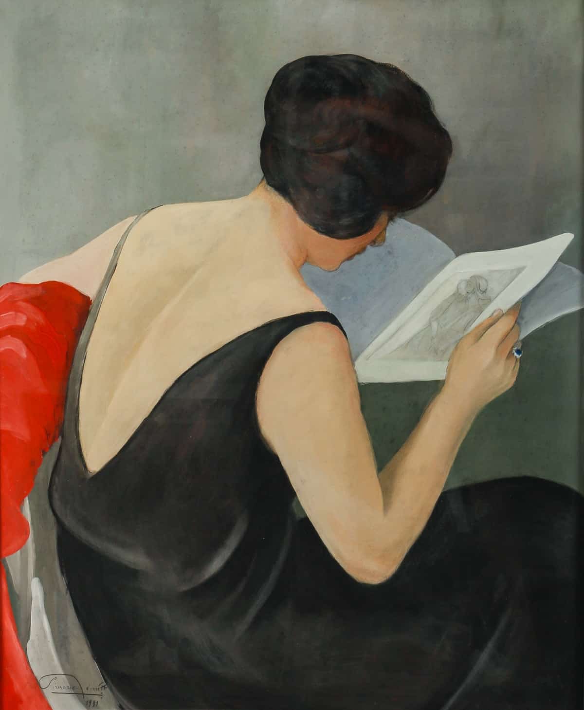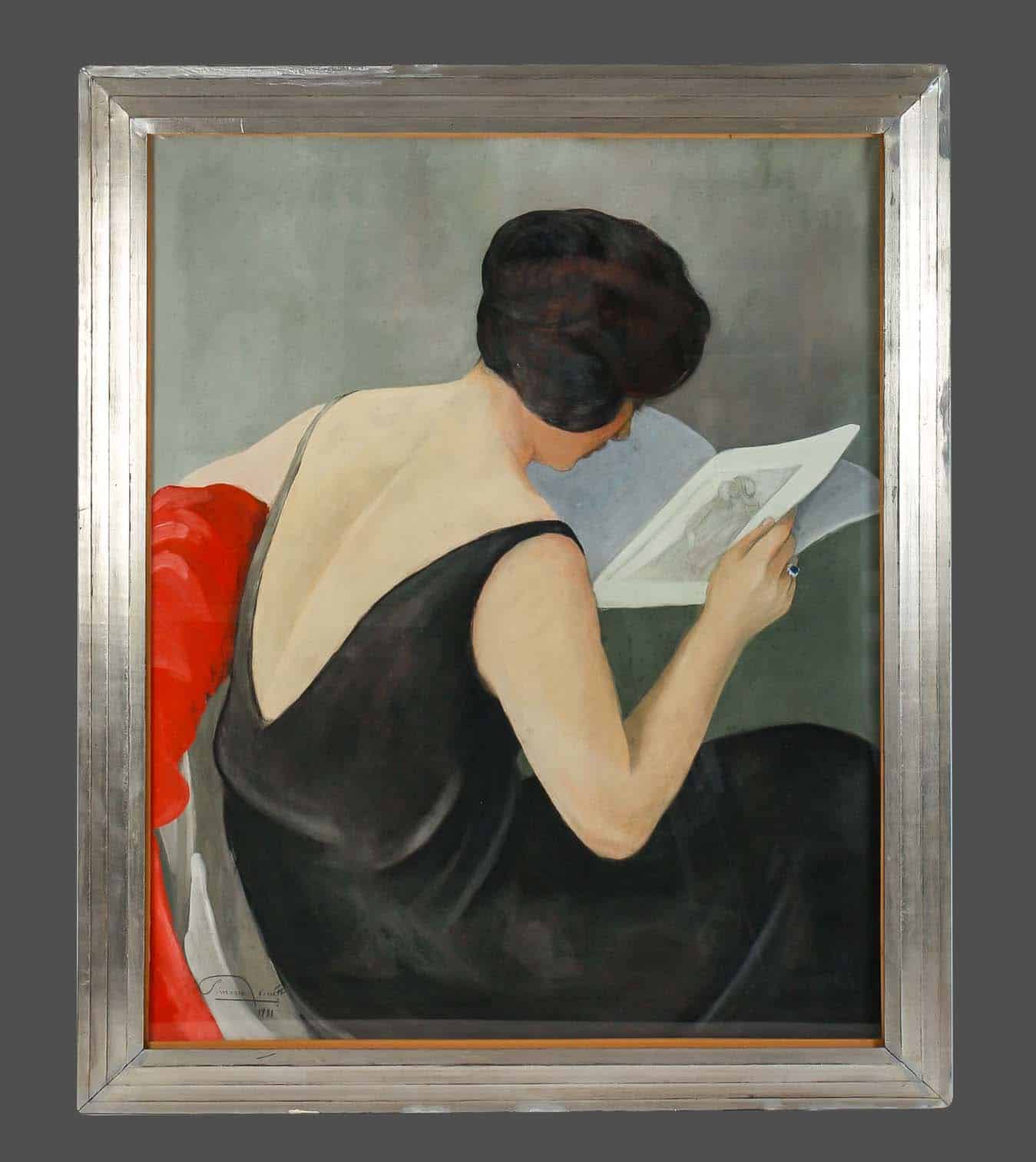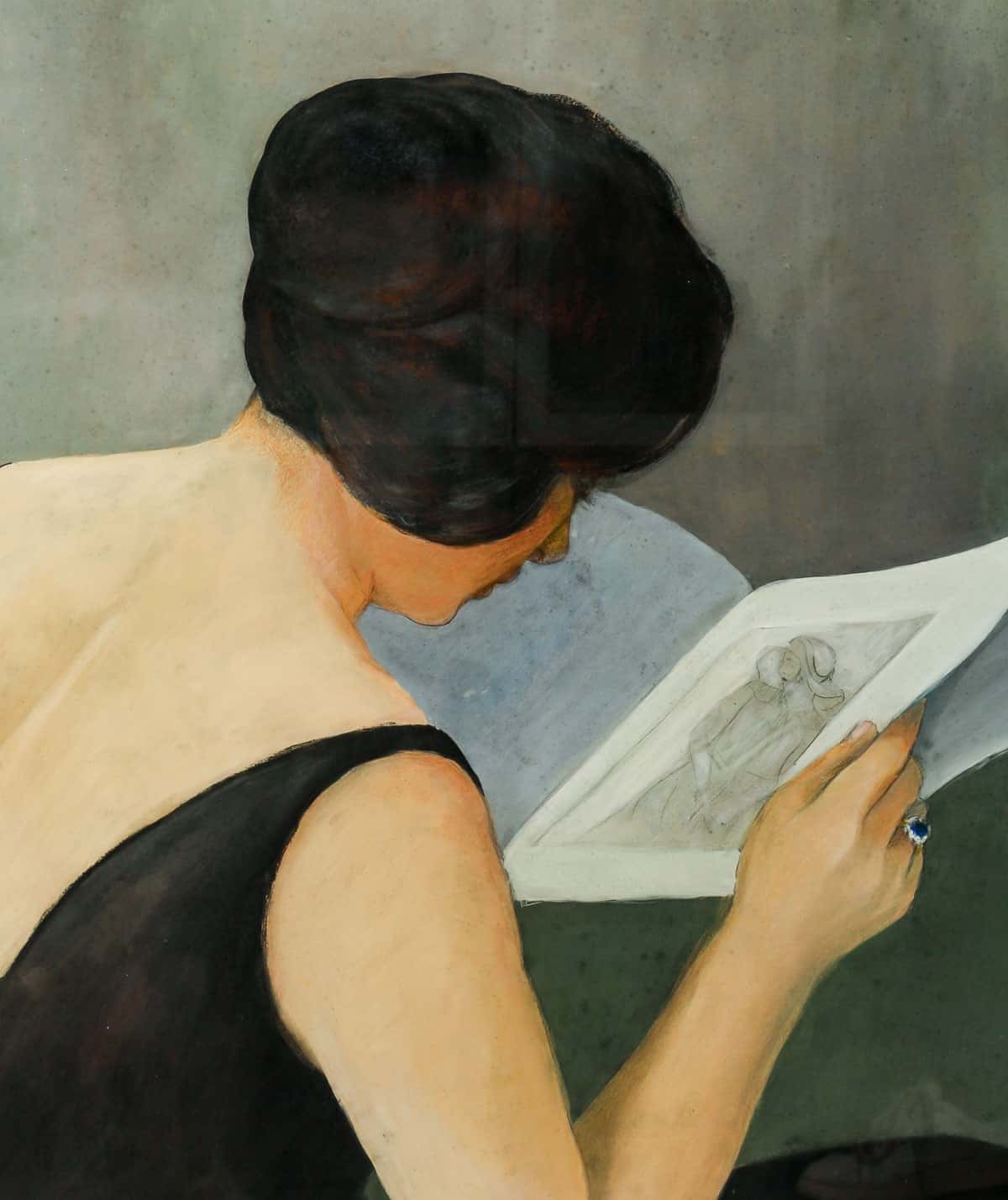 Important pastel et gouache d’époque Art-Deco, figurant une jeune femme en robe noire, de trois quart lisant une revue.